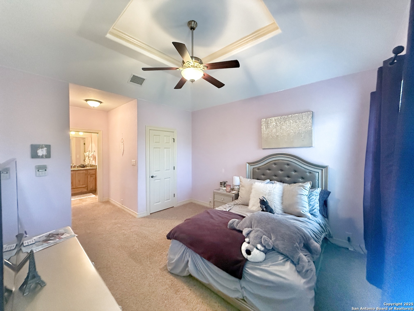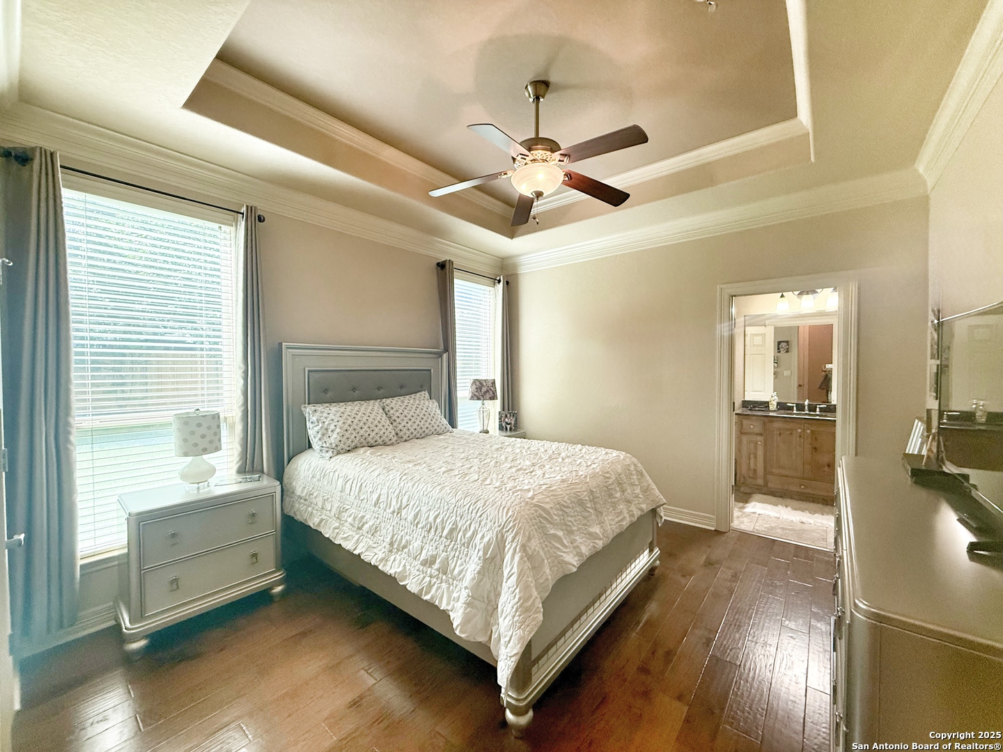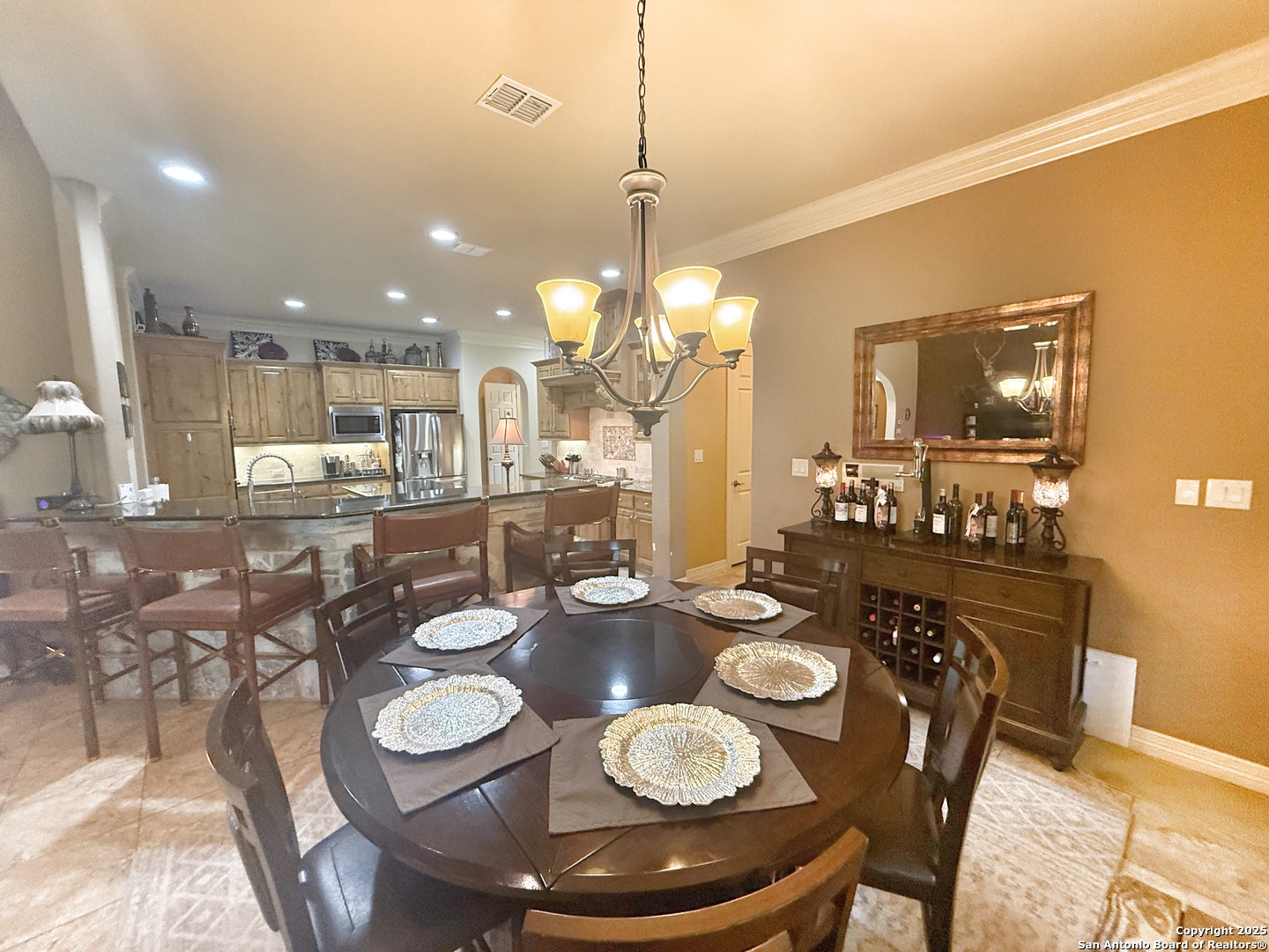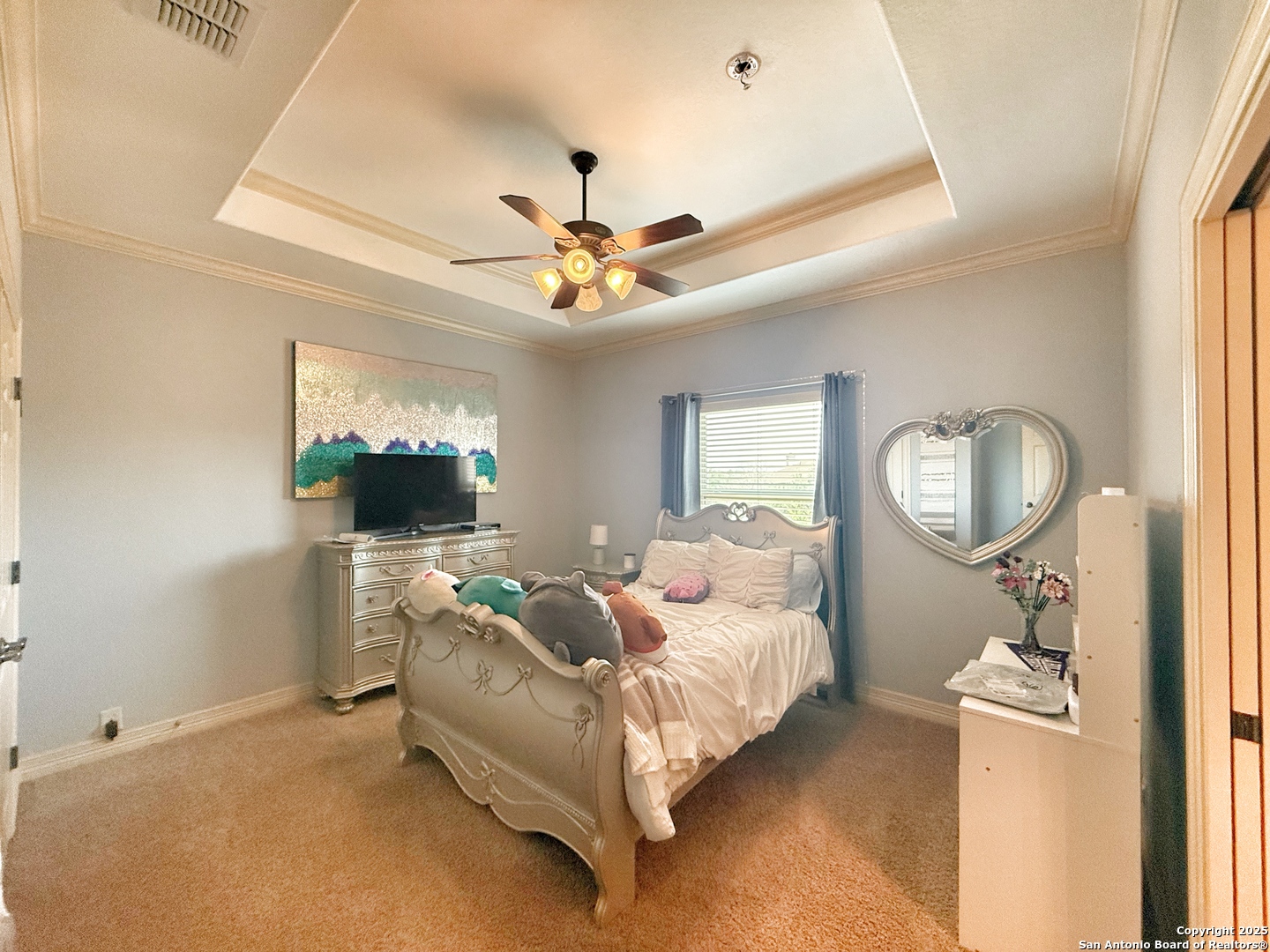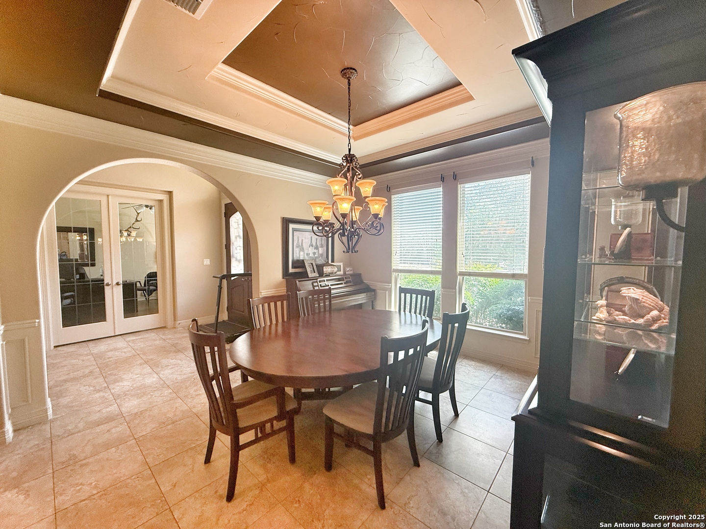 Nestled in a serene cul-de-sac within the desirable Mesas at Canyon Springs, this exquisite Mediterranean-style custom home offers luxury, space, and privacy. Meticulously designed for both comfortable family living and entertaining, this distinguished home features 4 generously sized bedrooms, 4 full bathrooms, a convenient half bath, and a spacious three-car split garage. Step through a grand foyer into an inviting open-concept layout, highlighted by soaring ceilings and an abundance of natural light. The main floor includes a formal dining room, a dedicated office or study, and a private guest bedroom with a full bath-perfect for visitors. The luxurious primary suite offers direct access to the tranquil backyard retreat, a spa-inspired bath with split vanities, multiple closets, and an elegantly crafted walk-through shower. The chef's kitchen is a culinary masterpiece, boasting custom cabinetry, premium stainless steel appliances, a large island, gas cooktop, double ovens, built-in microwave, and a spacious walk-in pantry. This space flows seamlessly into a grand living area anchored by a dramatic floor-to-ceiling stone fireplace, expansive windows and built-in speakers for ambient entertainment. Upstairs, a spacious game room with a built-in mini bar invites relaxation and fun, accompanied by two additional bedrooms each with their own full bathrooms. A fully finished walk-in attic provides abundant storage, ensuring every inch of the home is utilized with care. The backyard oasis is a true sanctuary, surrounded by mature trees and ample space for both quiet moments and lively gatherings. Located within a gated community offering endless amenities and conveniently close to shopping, dining, and recreation, this home delivers an unparalleled lifestyle of comfort and elegance. **Please note: Kitchen fridge does NOT convey. Laundry room fridge will remain**