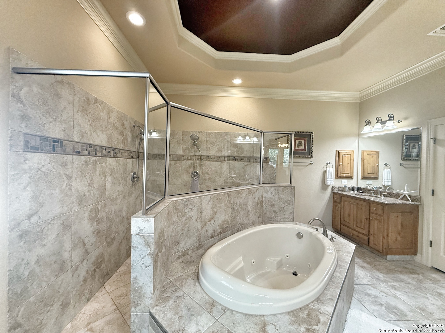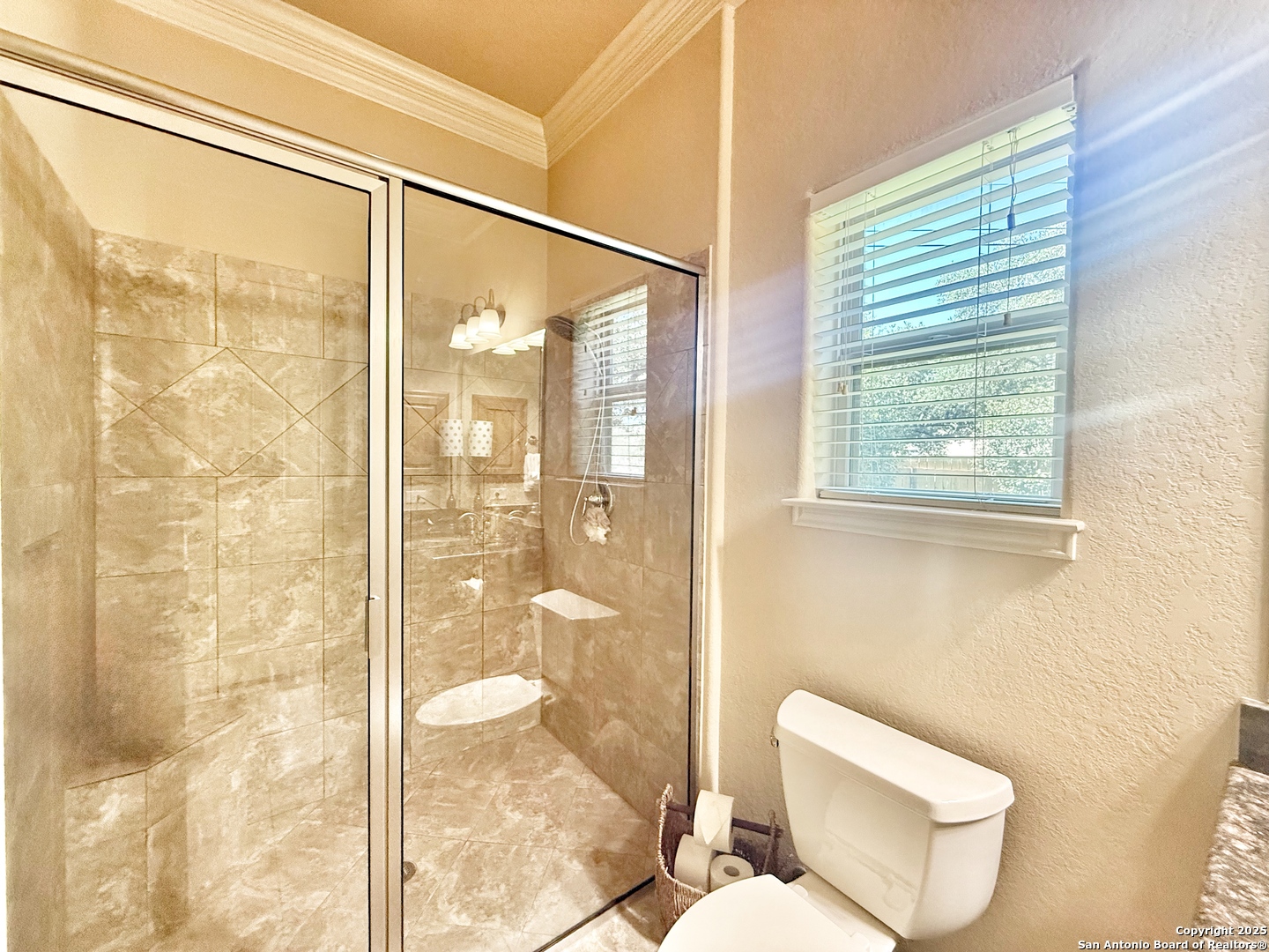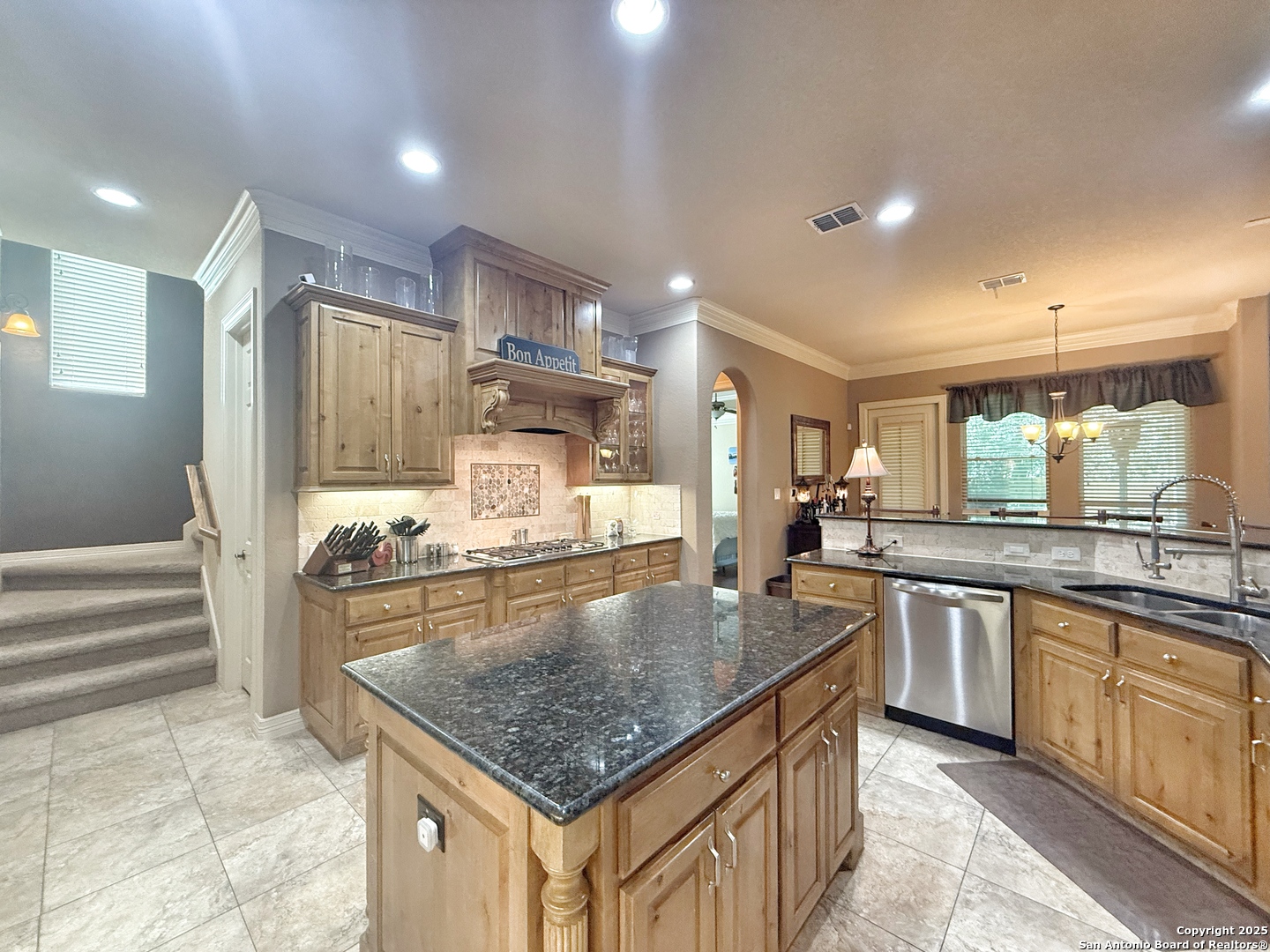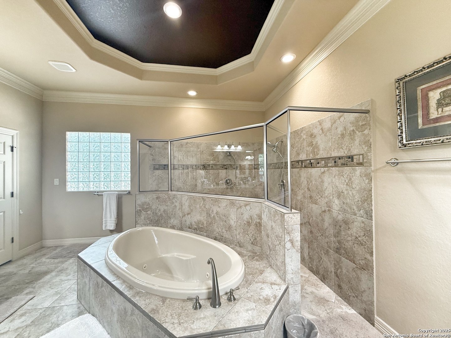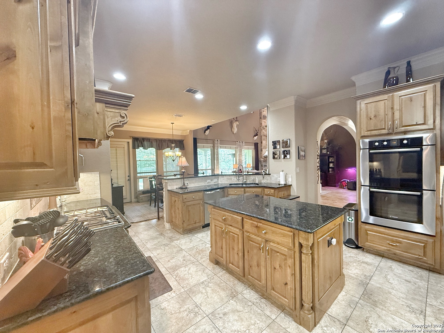 Nestled in a serene cul-de-sac within the desirable Mesas at Canyon Springs, this exquisite Mediterranean-style custom home offers luxury, space, and privacy. Meticulously designed for both comfortable family living and entertaining, this distinguished home features 4 generously sized bedrooms, 4 full bathrooms, a convenient half bath, and a spacious three-car split garage. Step through a grand foyer into an inviting open-concept layout, highlighted by soaring ceilings and an abundance of natural light. The main floor includes a formal dining room, a dedicated office or study, and a private guest bedroom with a full bath-perfect for visitors. The luxurious primary suite offers direct access to the tranquil backyard retreat, a spa-inspired bath with split vanities, multiple closets, and an elegantly crafted walk-through shower. The chef's kitchen is a culinary masterpiece, boasting custom cabinetry, premium stainless steel appliances, a large island, gas cooktop, double ovens, built-in microwave, and a spacious walk-in pantry. This space flows seamlessly into a grand living area anchored by a dramatic floor-to-ceiling stone fireplace, expansive windows and built-in speakers for ambient entertainment. Upstairs, a spacious game room with a built-in mini bar invites relaxation and fun, accompanied by two additional bedrooms each with their own full bathrooms. A fully finished walk-in attic provides abundant storage, ensuring every inch of the home is utilized with care. The backyard oasis is a true sanctuary, surrounded by mature trees and ample space for both quiet moments and lively gatherings. Located within a gated community offering endless amenities and conveniently close to shopping, dining, and recreation, this home delivers an unparalleled lifestyle of comfort and elegance. **Please note: Kitchen fridge does NOT convey. Laundry room fridge will remain**