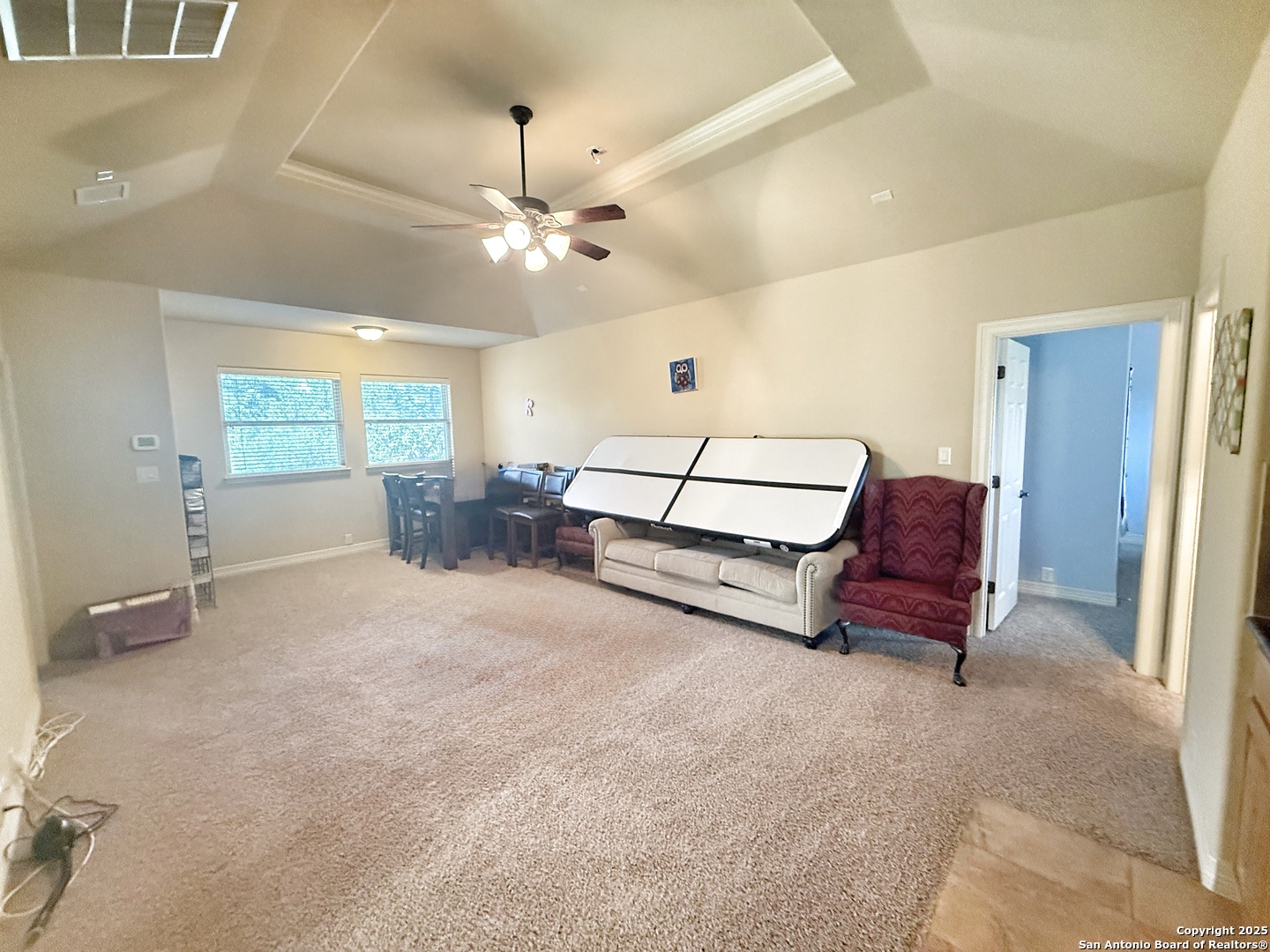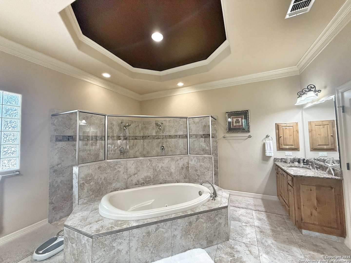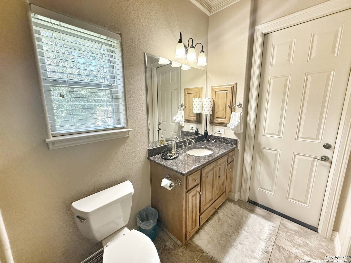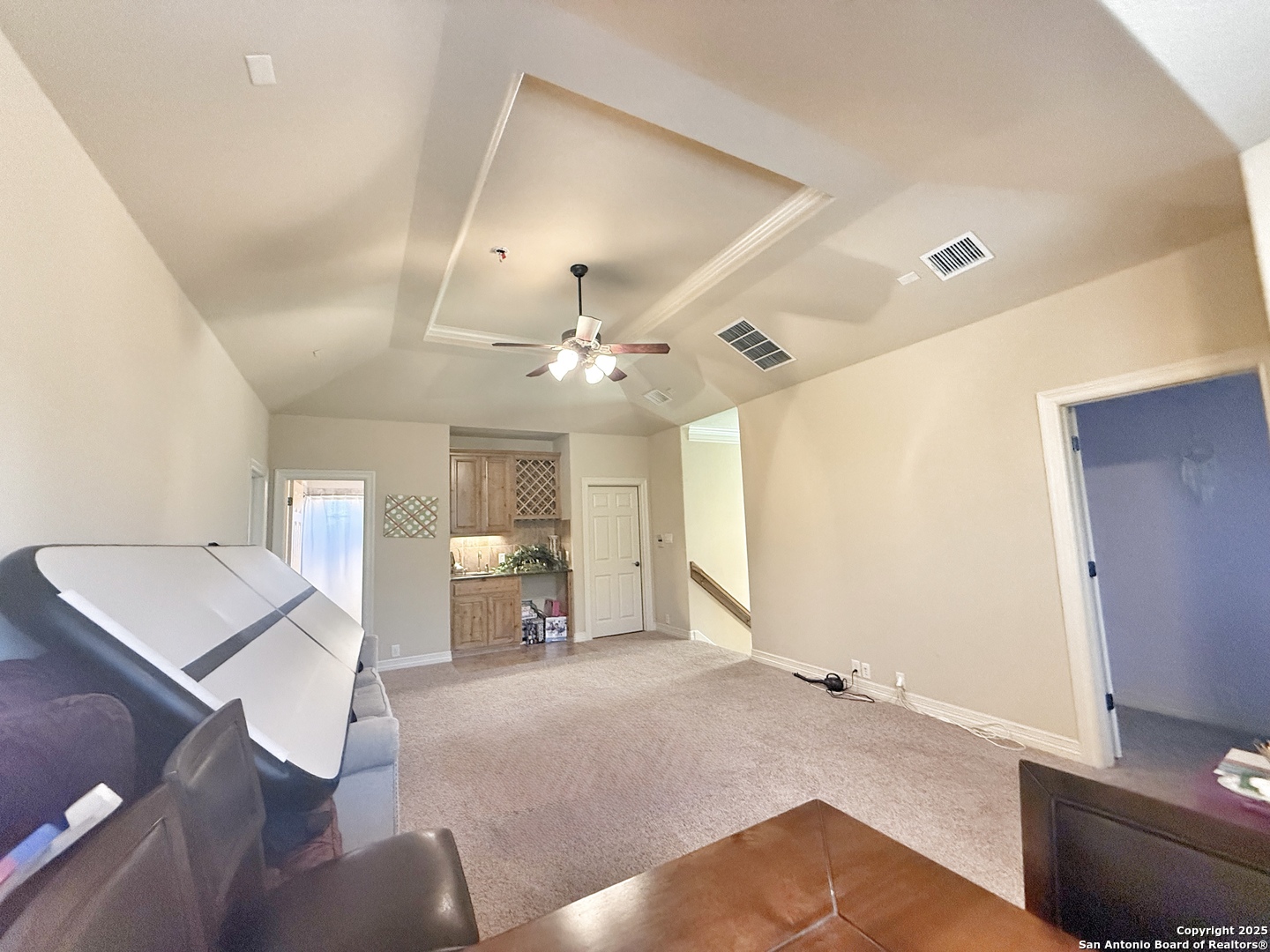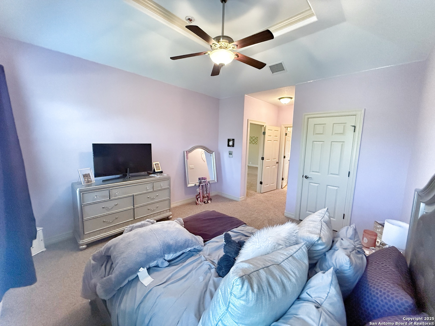 Nestled in a serene cul-de-sac within the desirable Mesas at Canyon Springs, this exquisite Mediterranean-style custom home offers luxury, space, and privacy. Meticulously designed for both comfortable family living and entertaining, this distinguished home features 4 generously sized bedrooms, 4 full bathrooms, a convenient half bath, and a spacious three-car split garage. Step through a grand foyer into an inviting open-concept layout, highlighted by soaring ceilings and an abundance of natural light. The main floor includes a formal dining room, a dedicated office or study, and a private guest bedroom with a full bath-perfect for visitors. The luxurious primary suite offers direct access to the tranquil backyard retreat, a spa-inspired bath with split vanities, multiple closets, and an elegantly crafted walk-through shower. The chef's kitchen is a culinary masterpiece, boasting custom cabinetry, premium stainless steel appliances, a large island, gas cooktop, double ovens, built-in microwave, and a spacious walk-in pantry. This space flows seamlessly into a grand living area anchored by a dramatic floor-to-ceiling stone fireplace, expansive windows and built-in speakers for ambient entertainment. Upstairs, a spacious game room with a built-in mini bar invites relaxation and fun, accompanied by two additional bedrooms each with their own full bathrooms. A fully finished walk-in attic provides abundant storage, ensuring every inch of the home is utilized with care. The backyard oasis is a true sanctuary, surrounded by mature trees and ample space for both quiet moments and lively gatherings. Located within a gated community offering endless amenities and conveniently close to shopping, dining, and recreation, this home delivers an unparalleled lifestyle of comfort and elegance. **Please note: Kitchen fridge does NOT convey. Laundry room fridge will remain**