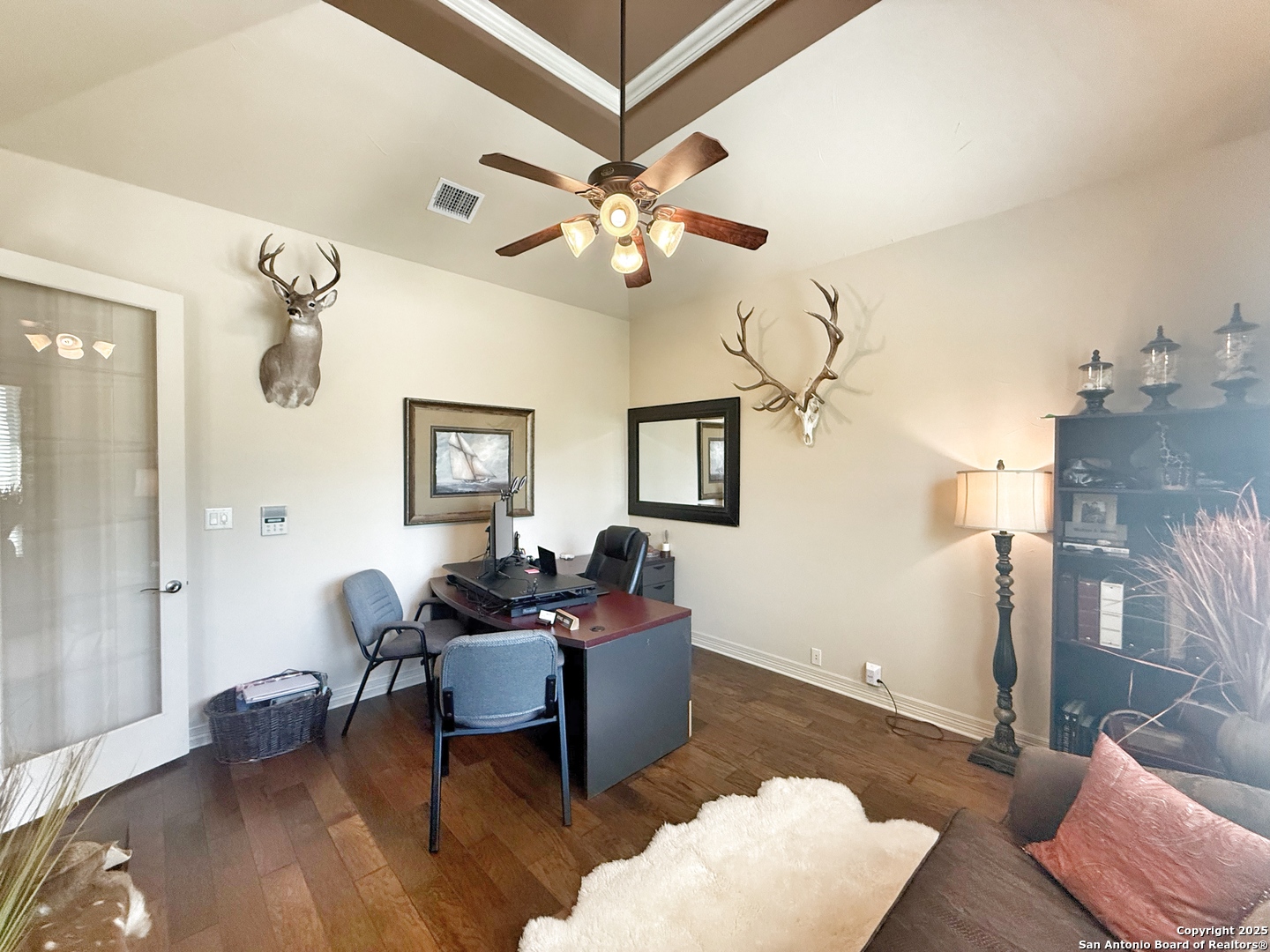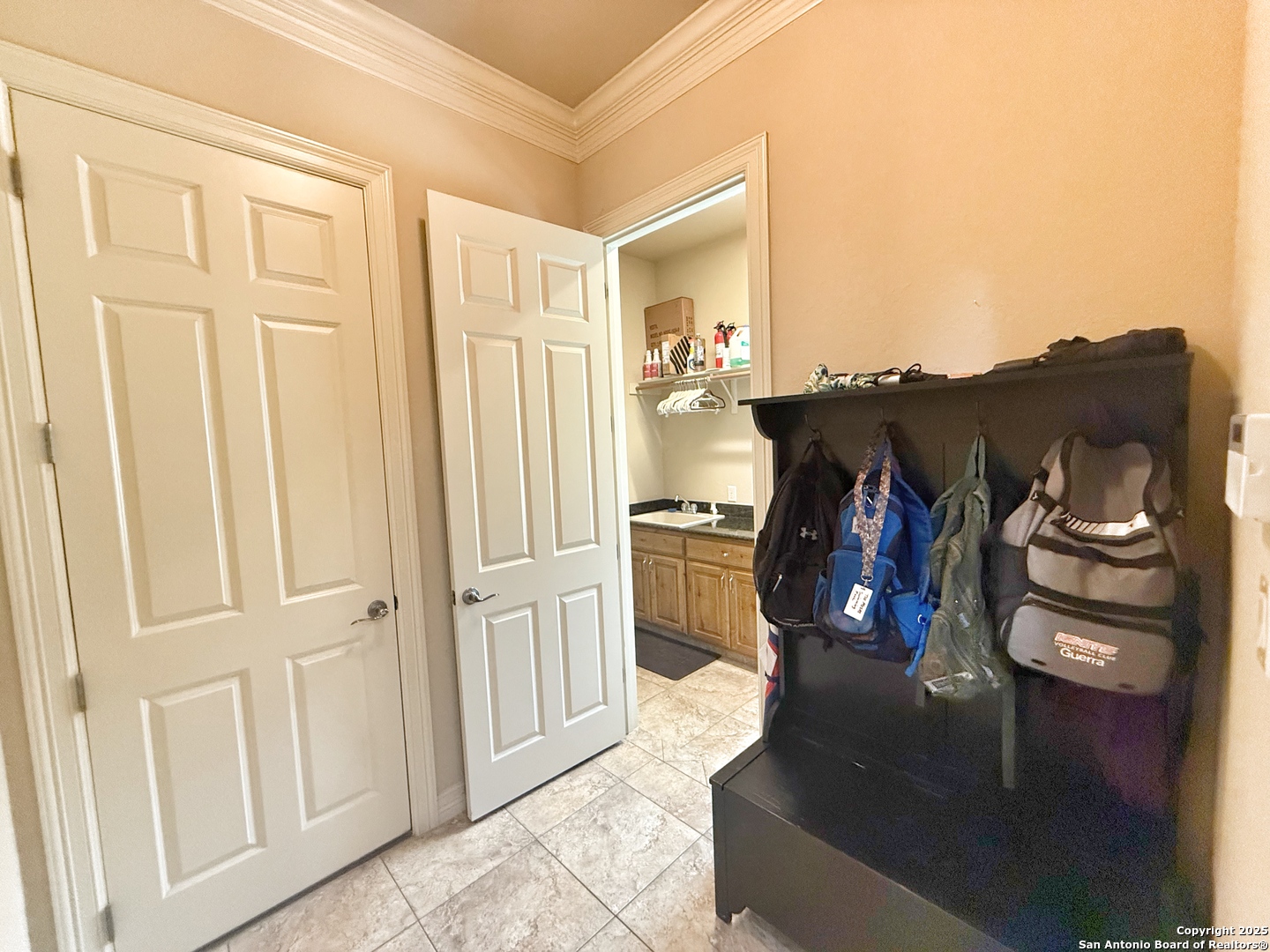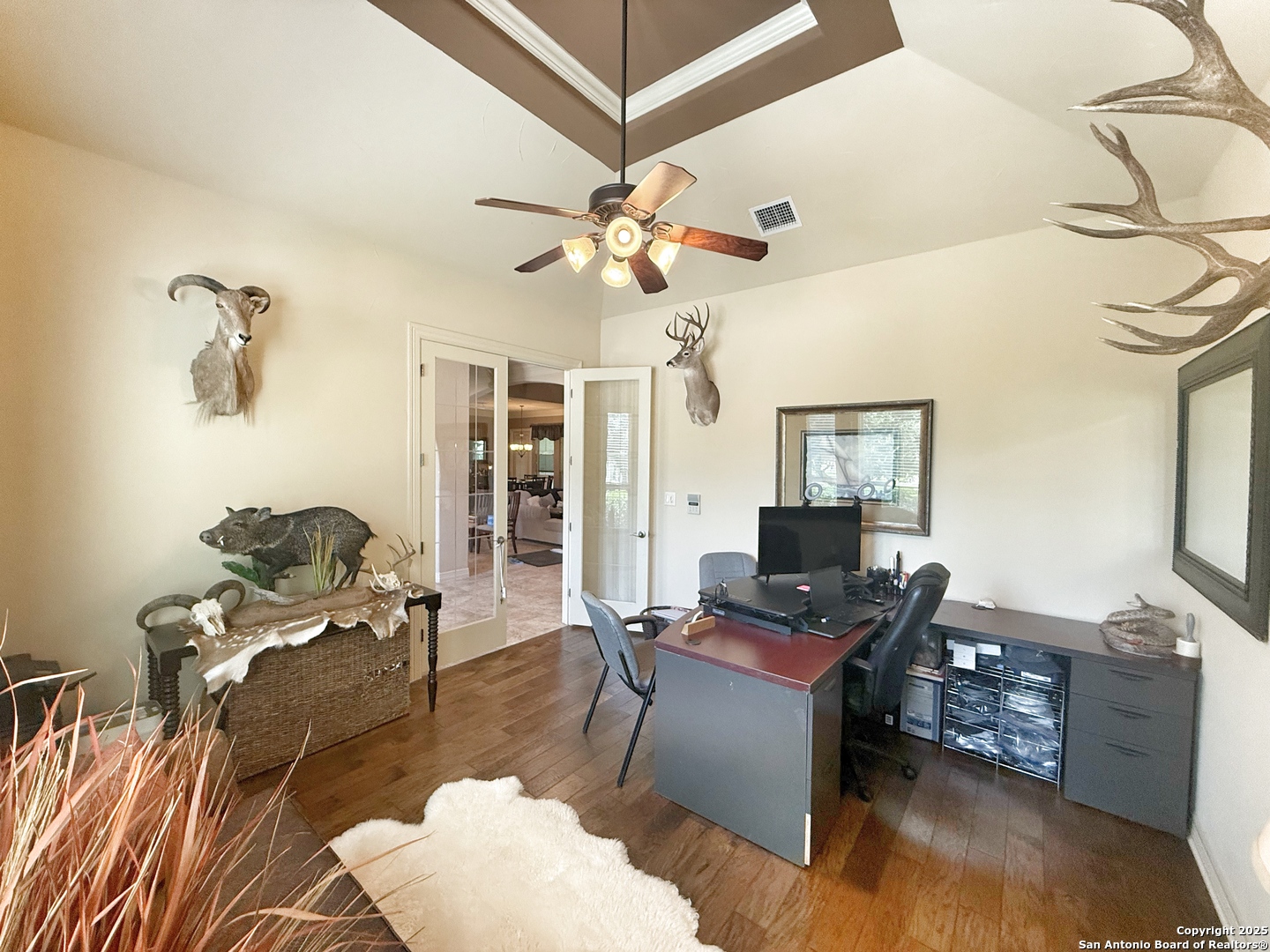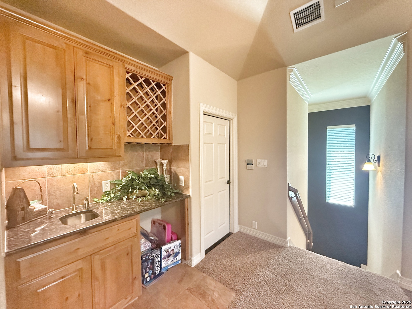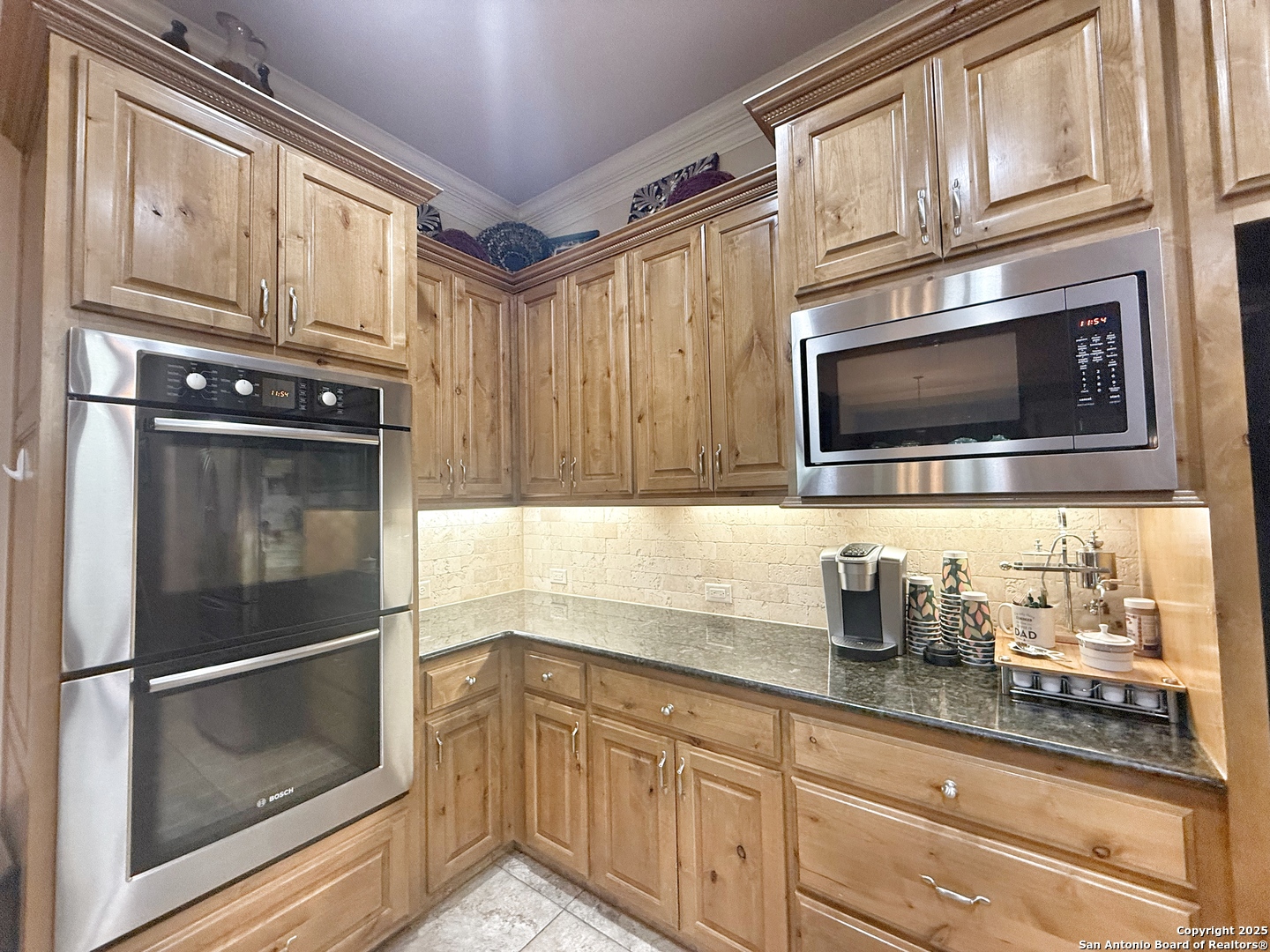 Nestled in a serene cul-de-sac within the desirable Mesas at Canyon Springs, this exquisite Mediterranean-style custom home offers luxury, space, and privacy. Meticulously designed for both comfortable family living and entertaining, this distinguished home features 4 generously sized bedrooms, 4 full bathrooms, a convenient half bath, and a spacious three-car split garage. Step through a grand foyer into an inviting open-concept layout, highlighted by soaring ceilings and an abundance of natural light. The main floor includes a formal dining room, a dedicated office or study, and a private guest bedroom with a full bath-perfect for visitors. The luxurious primary suite offers direct access to the tranquil backyard retreat, a spa-inspired bath with split vanities, multiple closets, and an elegantly crafted walk-through shower. The chef's kitchen is a culinary masterpiece, boasting custom cabinetry, premium stainless steel appliances, a large island, gas cooktop, double ovens, built-in microwave, and a spacious walk-in pantry. This space flows seamlessly into a grand living area anchored by a dramatic floor-to-ceiling stone fireplace, expansive windows and built-in speakers for ambient entertainment. Upstairs, a spacious game room with a built-in mini bar invites relaxation and fun, accompanied by two additional bedrooms each with their own full bathrooms. A fully finished walk-in attic provides abundant storage, ensuring every inch of the home is utilized with care. The backyard oasis is a true sanctuary, surrounded by mature trees and ample space for both quiet moments and lively gatherings. Located within a gated community offering endless amenities and conveniently close to shopping, dining, and recreation, this home delivers an unparalleled lifestyle of comfort and elegance. **Please note: Kitchen fridge does NOT convey. Laundry room fridge will remain**