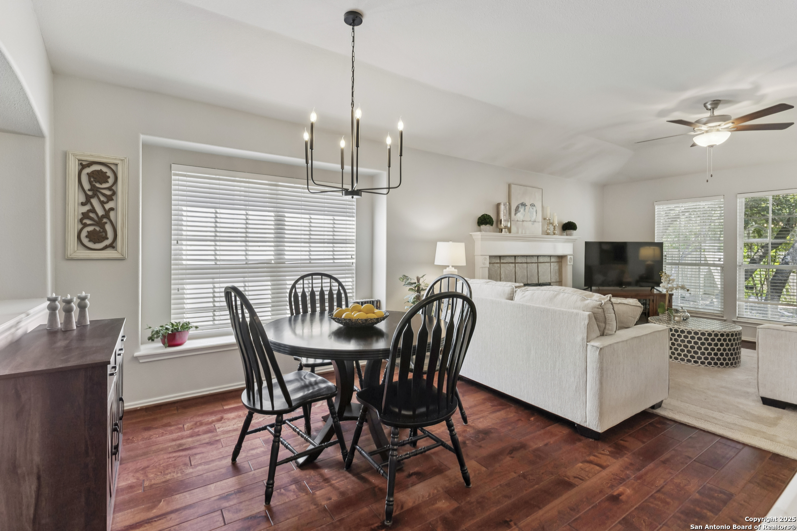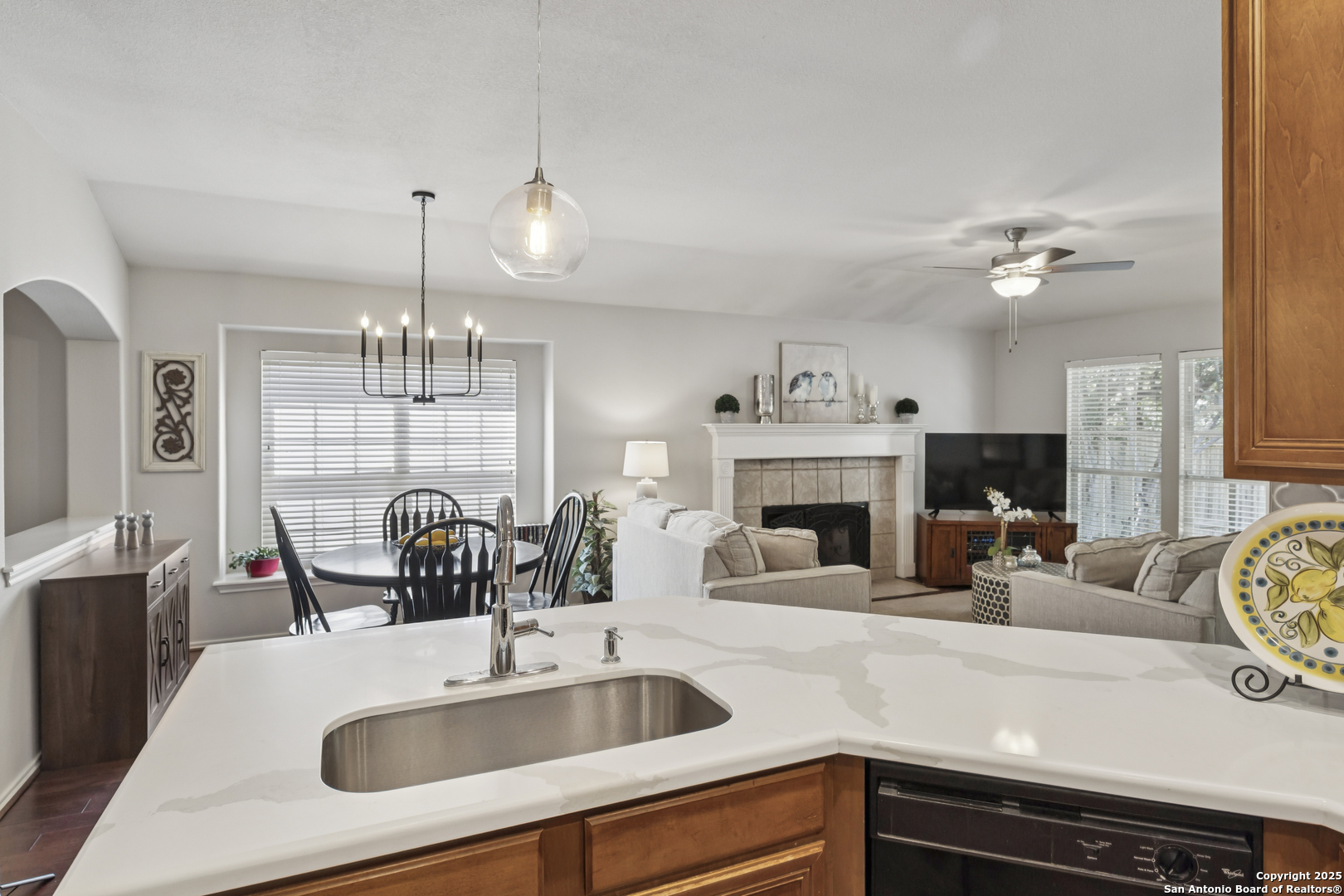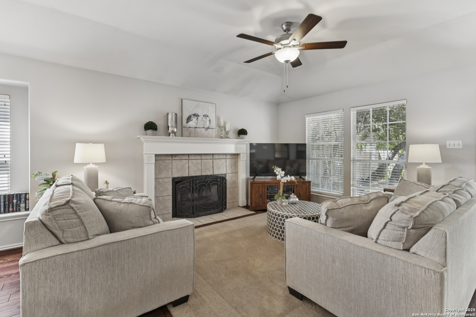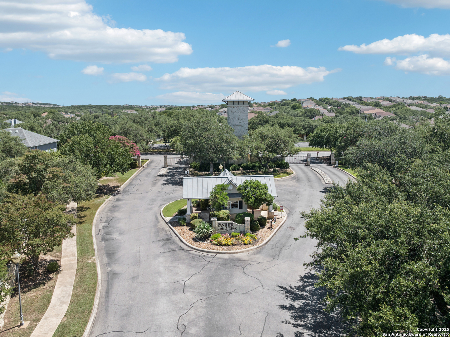 Updated One-Story Gem Backing to Greenbelt in Panther Creek! Don't miss this beautifully renovated one-level home in the highly desirable gated community of Panther Creek! Thoughtfully updated with hardwood floors, BRAND NEW carpets in bedrooms, quartz countertops, stylish lighting, and a modern open layout, this home blends charm and functionality with ease. The spacious kitchen features a peninsula layout and breakfast bar, quartz counters, a designer backsplash, and a walk-in pantry-perfect for cooking and entertaining. The cozy family room centers around a wood-burning fireplace with a striking mantle and hearth. The owner's suite offers a spa-inspired retreat with double vanities, a walk-in shower, and a large closet. Two additional bedrooms and an updated guest bath provide space and privacy for family or guests. Enjoy outdoor living on the spacious patio and covered pergola, surrounded by mature trees and backing to a peaceful greenbelt-no rear neighbors! The 2-car garage offers ample storage. Enjoy Top-rated NEISD schools and fantastic HOA amenities just steps from your front door! This move-in ready home offers the perfect mix of updates, location, and lifestyle. Schedule your showing today!