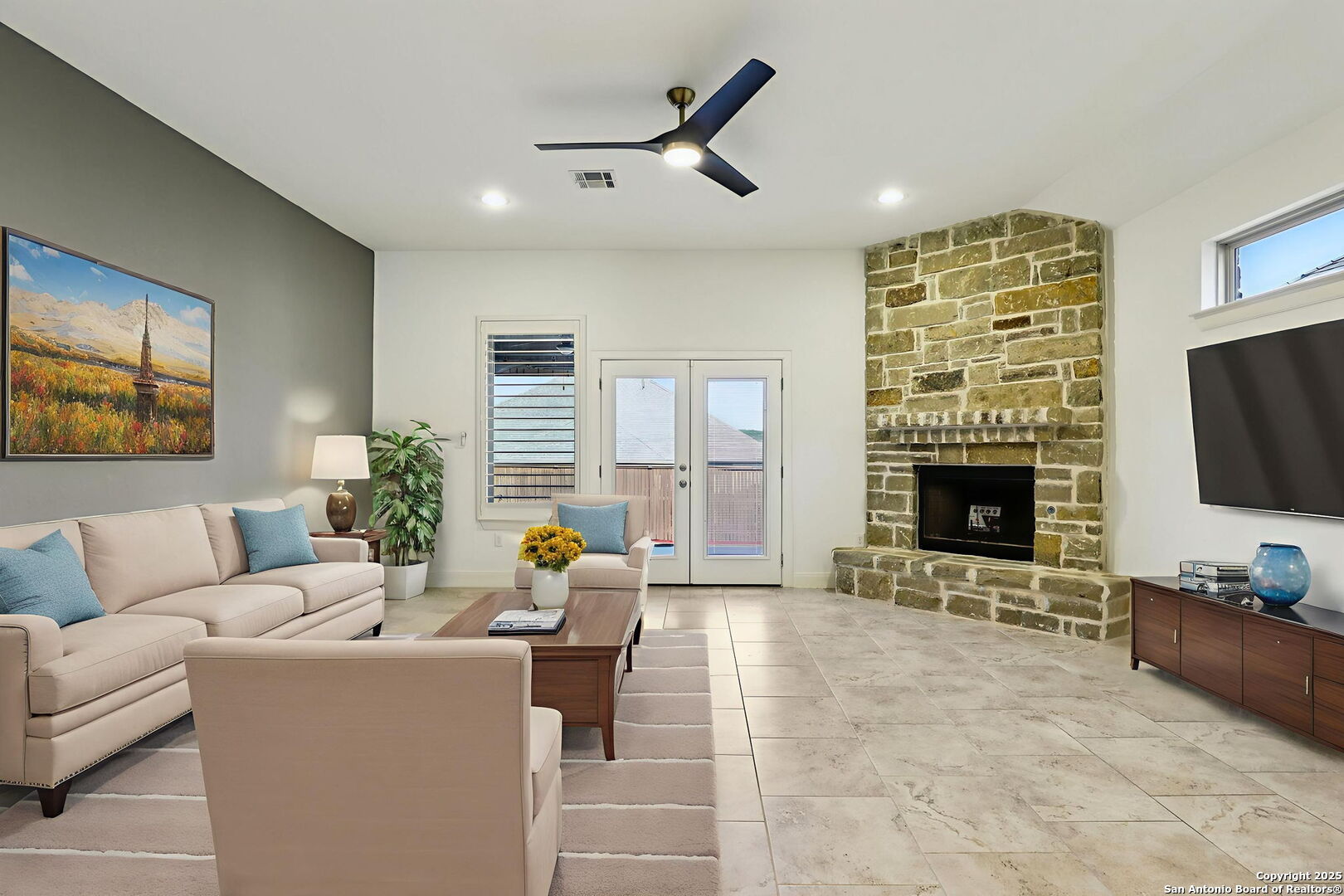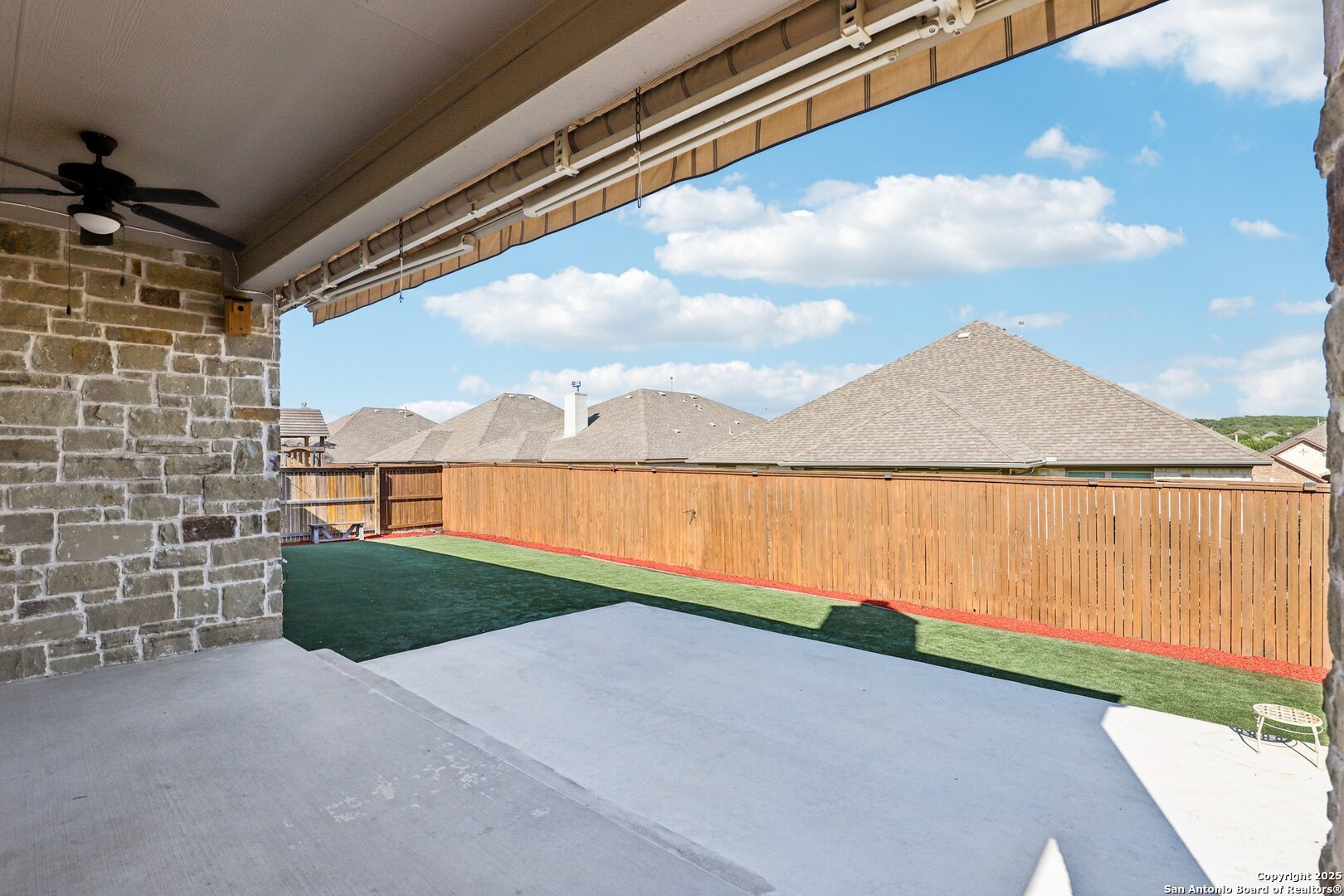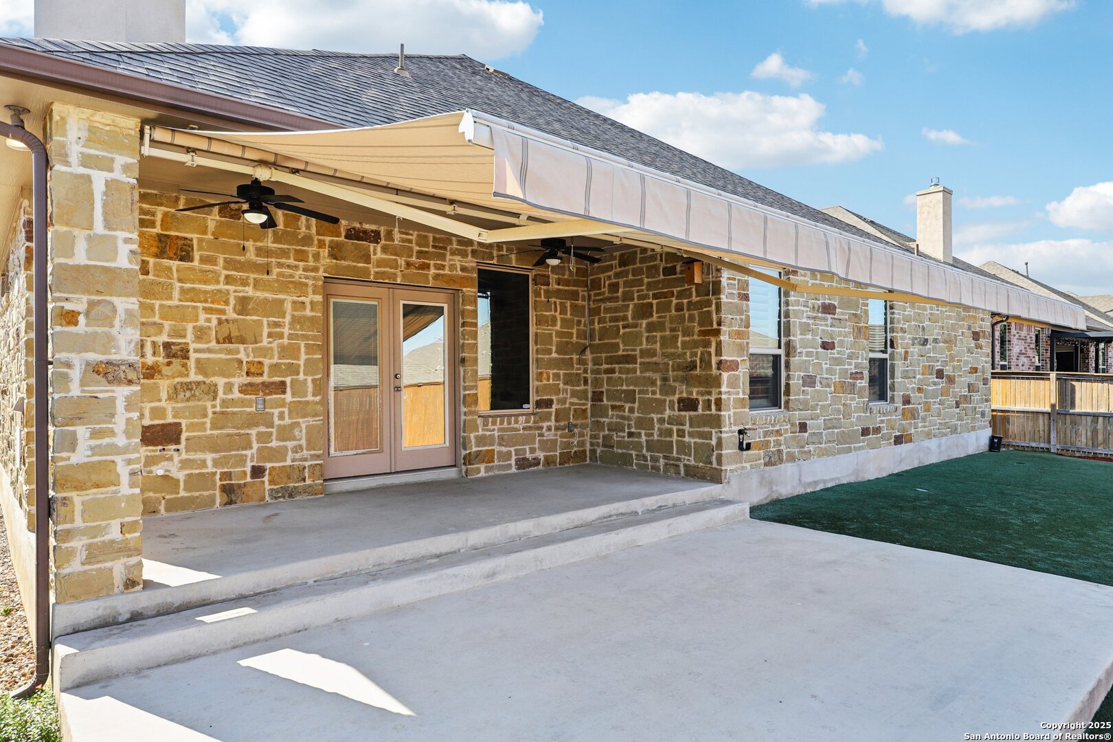 Welcome to 239 Bamberger, a beautifully maintained single-story residence nestled in the desirable Villas at Manor Creek community in New Braunfels, TX. This thoughtfully designed home features 4 spacious bedrooms and 3 full bathrooms, offering both comfort and functionality in every corner. Step inside to find an inviting layout filled with natural light and modern finishes. The kitchen flows seamlessly into the living and dining areas, creating the perfect space for entertaining or relaxing in style. Out back, enjoy a low-maintenance Xeroscape yard, ideal for those seeking a serene outdoor retreat without the upkeep. The extended back patio includes a fully electric retractable awning, providing customizable shade and comfort for outdoor living all year round. Located in a gated neighborhood, residents of Villas at Manor Creek enjoy access to exclusive amenities, including a community pool, park, and playground-all just a short walk from your doorstep.