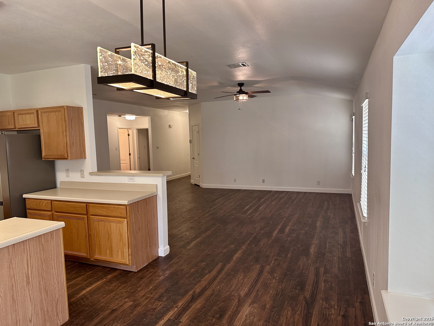 One story on a corner lot! GVEC Electric and zoned for Long Creek High School! Neighborhood pool, park and sports court. NO CARPET! A/C was replaced for energy efficiency. Covered patio, privacy fenced yard and large corner lot! Primary bedroom has barn door entry to the full bathroom with 2 sinks, separate updated shower and large soaking tub! Kitchen has LOTS OF CABINETS and an island too! Updated stainless appliances and the refrigerator has craft ice! 2 more bedrooms near the front of the home with their own bathroom between. 3 sides rock and ceiling fans throughout. Oversized living room and open floor plan! 2 car garage with garage door openers and long driveway.