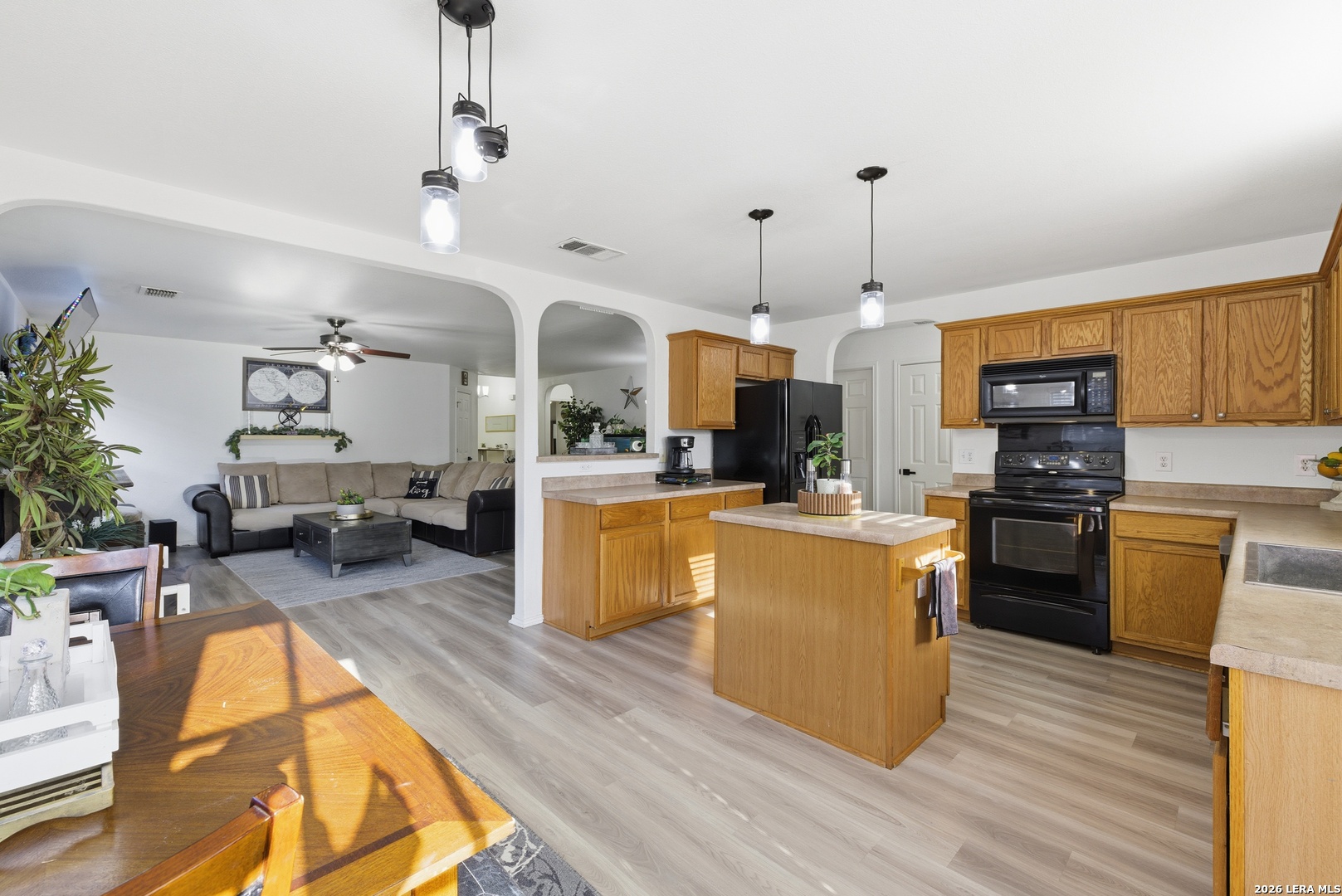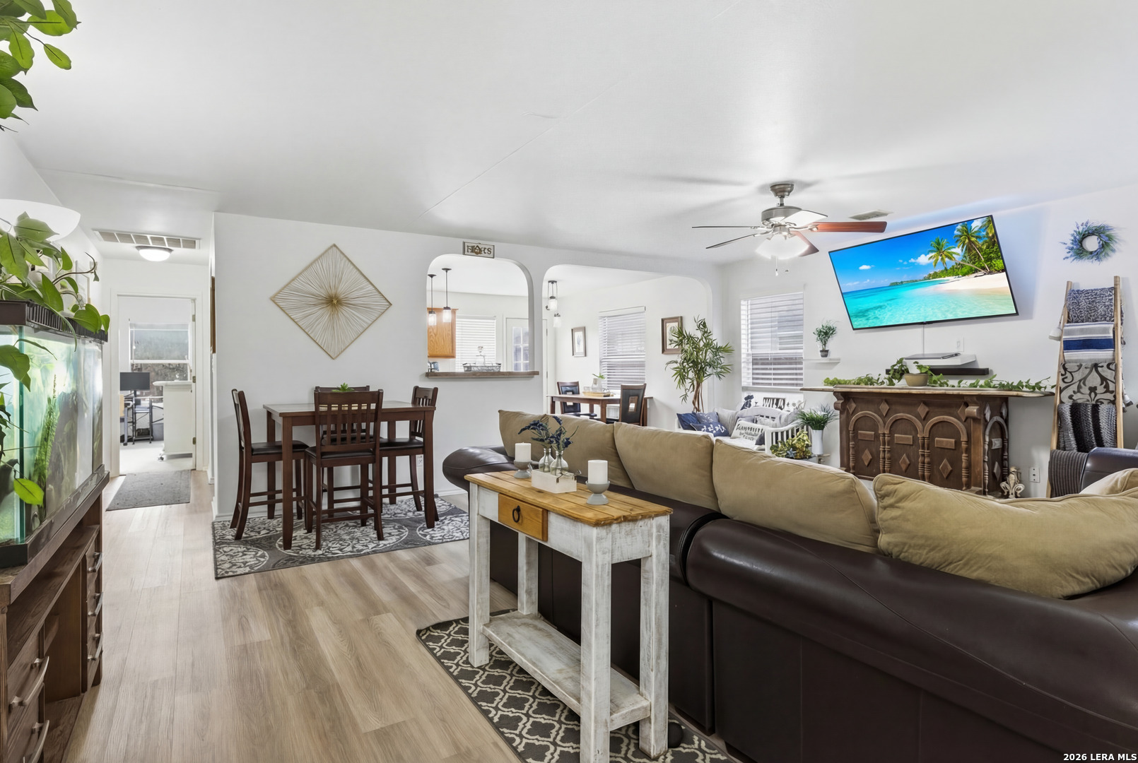 3 BEDROOM 2 BATH. It is a pleasure to present this quaint little gem tucked away in the heart of Dove Crossing. Open floor plan spacious eat in kitchen with island and stylish light fixtures. Primary bedroom suite enjoys double vanities in the bathroom, and large closet. Ceiling fans throughout, huge laundry with tons of shelving walk-in pantry for extra storage. Large back yard back up to a greenbelt separation. Prime location near Fischer Park and easy to get to downtown New Braunfels.