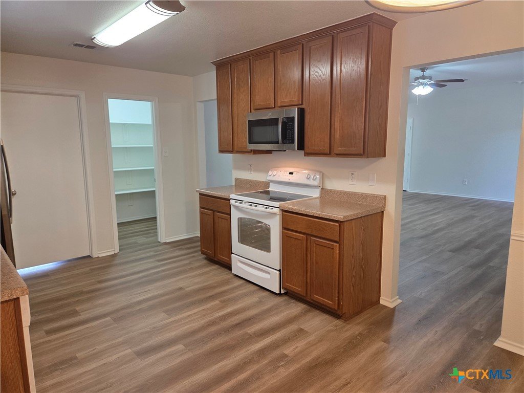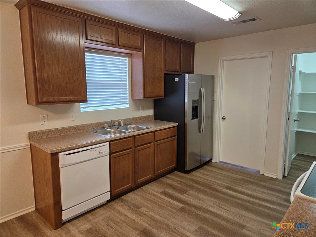 Located in highly desirable South Temple near Lions Junction Family Water Park and area recreation, this beautifully updated 4-bedroom home in Academy Independent School District combines modern upgrades, functional layout, and long-term value. Step inside to fresh interior paint (including garage walls), water proof hybrid flooring with sound backing, and updated ceiling fans—giving the home a clean, move-in-ready feel. The popular split-bedroom floor plan offers privacy for the primary suite, while the versatile flex room is perfect for a home office, second living area, playroom, or workout space. The spacious primary suite features a tile walk-in shower and two closets for optimal storage. The kitchen includes a sought-after walk-in pantry, and the laundry room offers upper cabinetry for added organization. Mini-blinds throughout add convenience and privacy. Enjoy outdoor living on the covered rear patio overlooking a cedar wood privacy fence. The whole-yard sprinkler system helps maintain curb appeal year-round, and the quality-built storage shed provides additional space without sacrificing garage parking. Situated on a corner lot with mature trees and four-sides brick construction, this home offers durability, shade, and strong curb appeal. Refrigerator does not convey but is negotiable. If you’re looking for a move-in ready home with modern updates, flexible living space, and a prime South Temple location—this one checks the boxes.