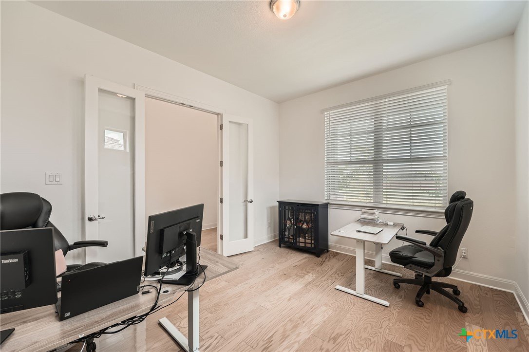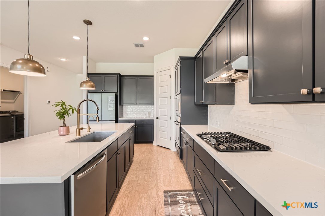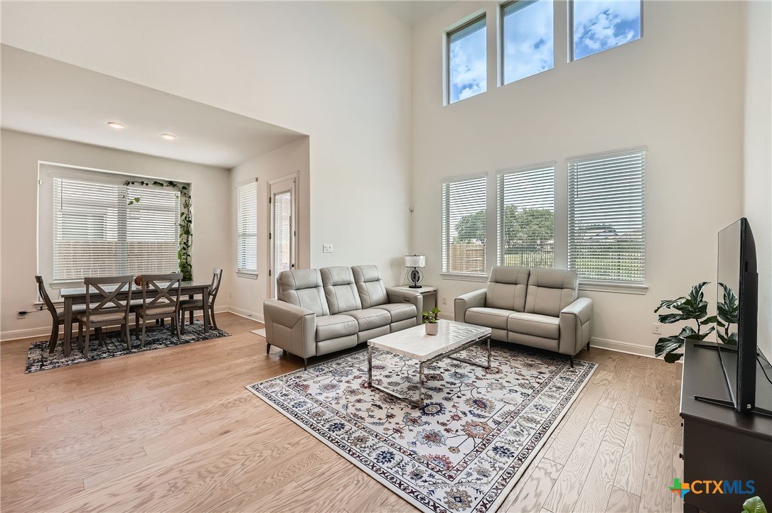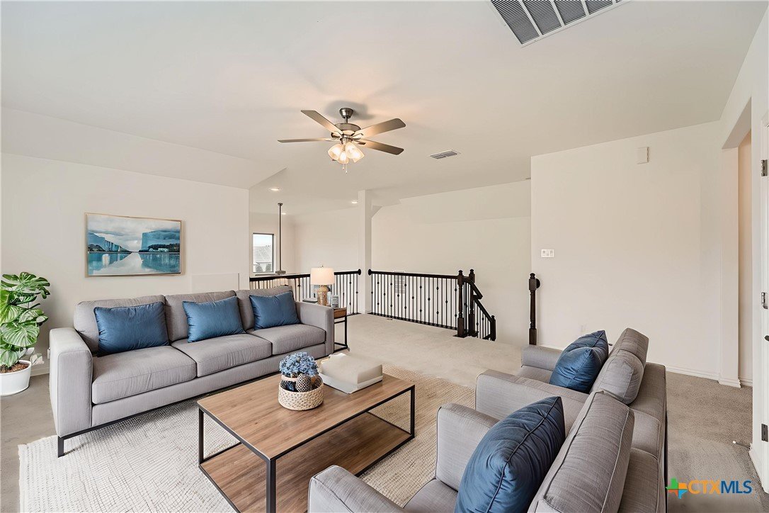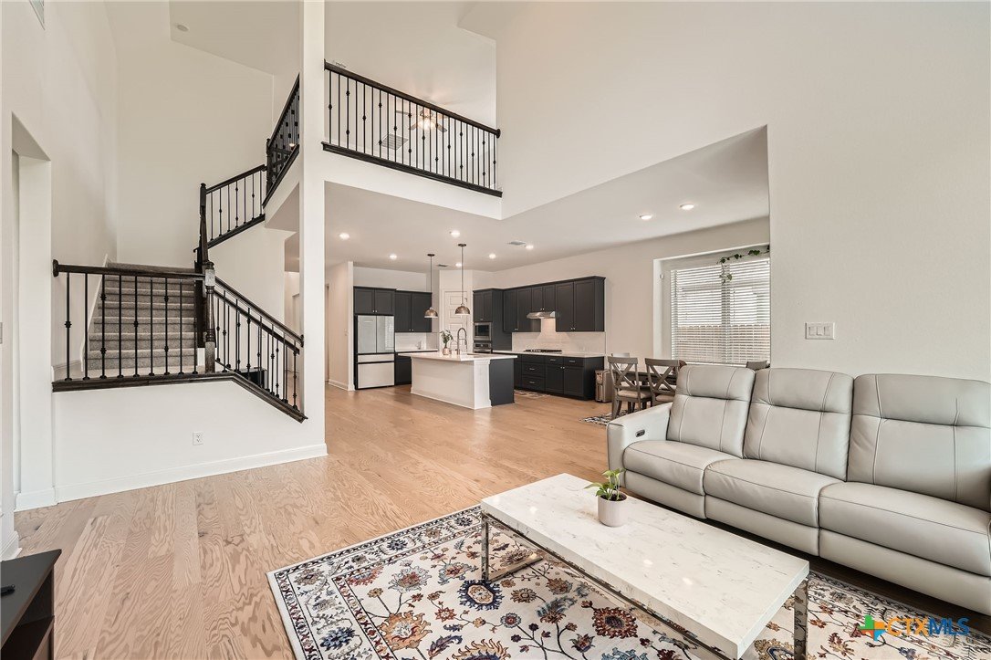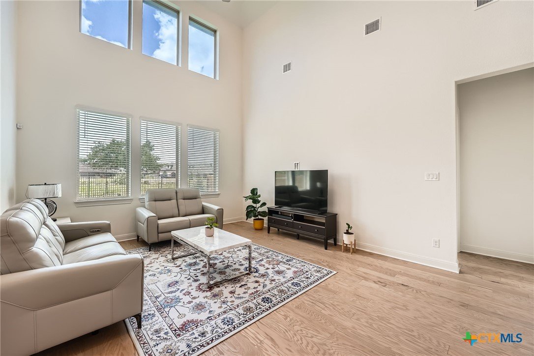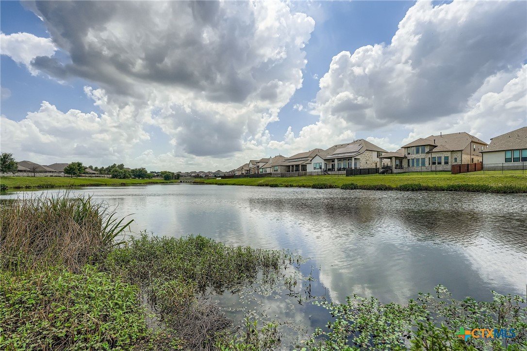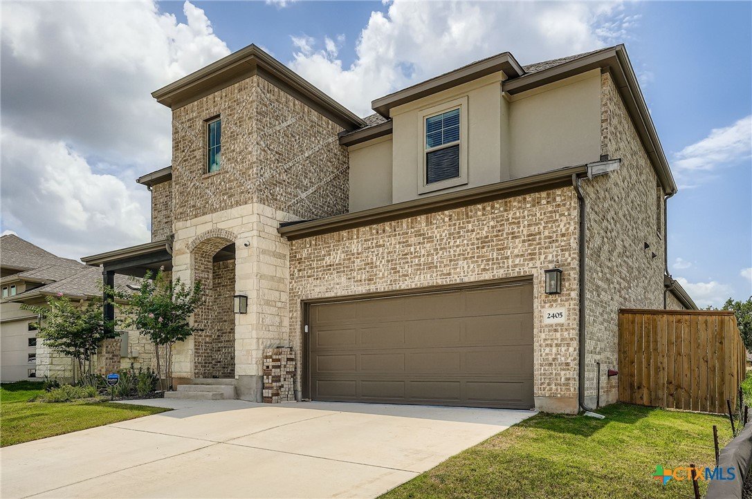 Located just minutes from TX-29, this stylish home sits in the desirable Oaks at San Gabriel community, offering top-tier amenities: a pool with sun deck, clubhouse, covered pavilion, playground, picnic areas, and over 7 miles of hiking/biking trails with outdoor workout stations. This move-in ready home features 4 bedrooms, 3.5 bathrooms, a dedicated home office, and a 2-car garage. Enjoy peaceful greenbelt sunsets from the fenced backyard and covered patio. The modern exterior provides great curb appeal, while the interior impresses with soaring ceilings, 8-foot doors throughout, hardwood floors in the main living areas, and plush high-cushion carpeting in the bedrooms. The designer kitchen boasts upgraded cabinetry, quartz countertops, a propane cooktop, and includes a luxury refrigerator. A washer and dryer, water softener system, and a propane tank are also included—premium features not typically found in inventory homes. The main-level primary suite offers a spa-like retreat with dual vanities, a soaking tub, and a separate walk-in shower. Also on the main floor are a half bath and laundry room. Upstairs, you'll find three spacious bedrooms, two full bathrooms with tub/shower combos, and a versatile loft overlooking the living area. With high-end finishes, a flexible floor plan, and resort-style community amenities, this home blends luxury and everyday comfort in a prime location. Discounted rate options and no lender fee future refinancing may be available for qualified buyers.