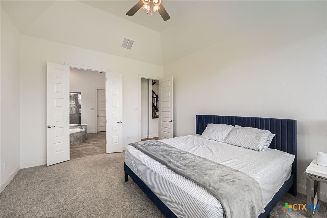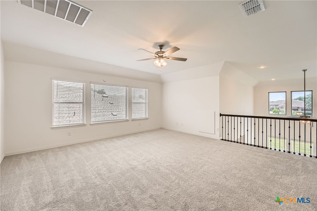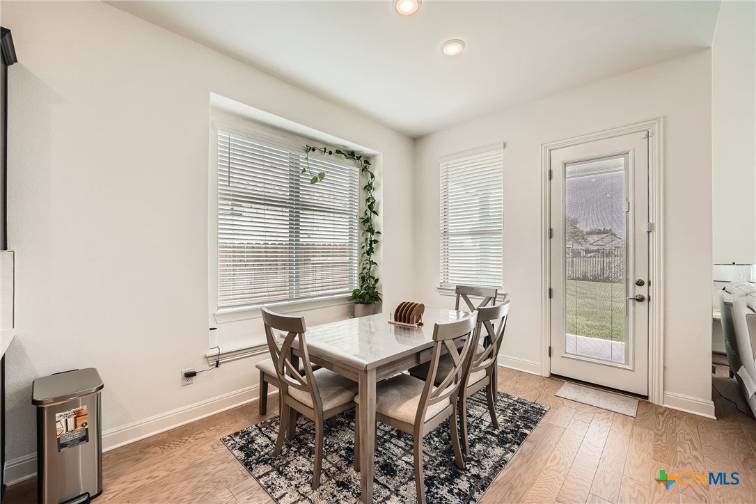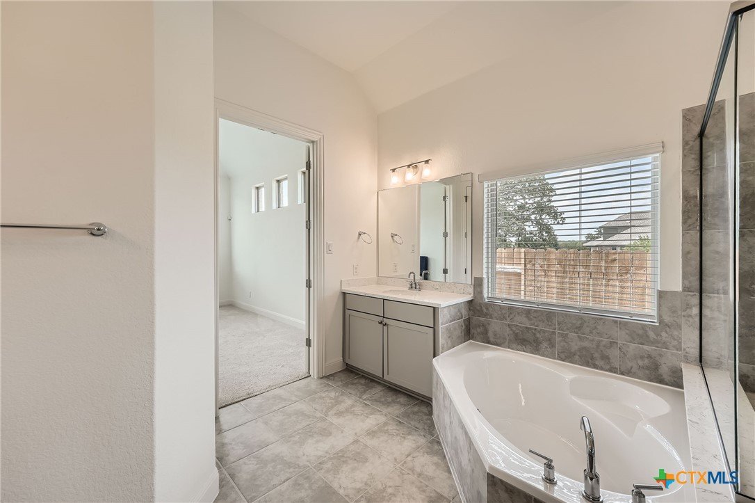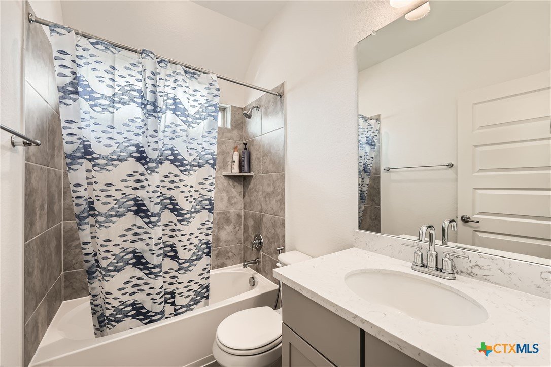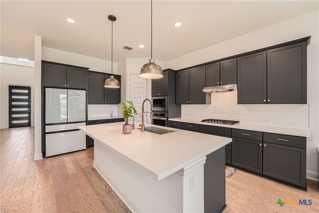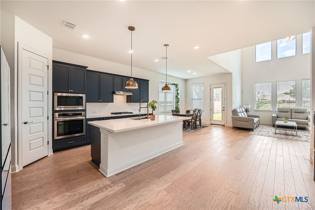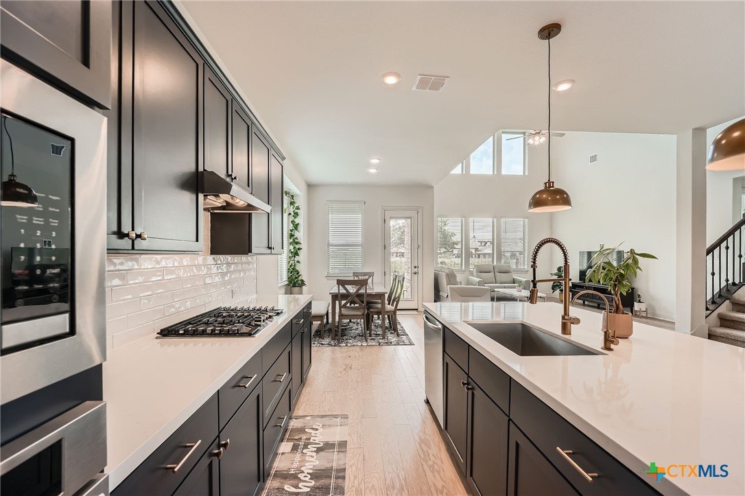 Located just minutes from TX-29, this stylish home sits in the desirable Oaks at San Gabriel community, offering top-tier amenities: a pool with sun deck, clubhouse, covered pavilion, playground, picnic areas, and over 7 miles of hiking/biking trails with outdoor workout stations. This move-in ready home features 4 bedrooms, 3.5 bathrooms, a dedicated home office, and a 2-car garage. Enjoy peaceful greenbelt sunsets from the fenced backyard and covered patio. The modern exterior provides great curb appeal, while the interior impresses with soaring ceilings, 8-foot doors throughout, hardwood floors in the main living areas, and plush high-cushion carpeting in the bedrooms. The designer kitchen boasts upgraded cabinetry, quartz countertops, a propane cooktop, and includes a luxury refrigerator. A washer and dryer, water softener system, and a propane tank are also included—premium features not typically found in inventory homes. The main-level primary suite offers a spa-like retreat with dual vanities, a soaking tub, and a separate walk-in shower. Also on the main floor are a half bath and laundry room. Upstairs, you'll find three spacious bedrooms, two full bathrooms with tub/shower combos, and a versatile loft overlooking the living area. With high-end finishes, a flexible floor plan, and resort-style community amenities, this home blends luxury and everyday comfort in a prime location. Discounted rate options and no lender fee future refinancing may be available for qualified buyers.