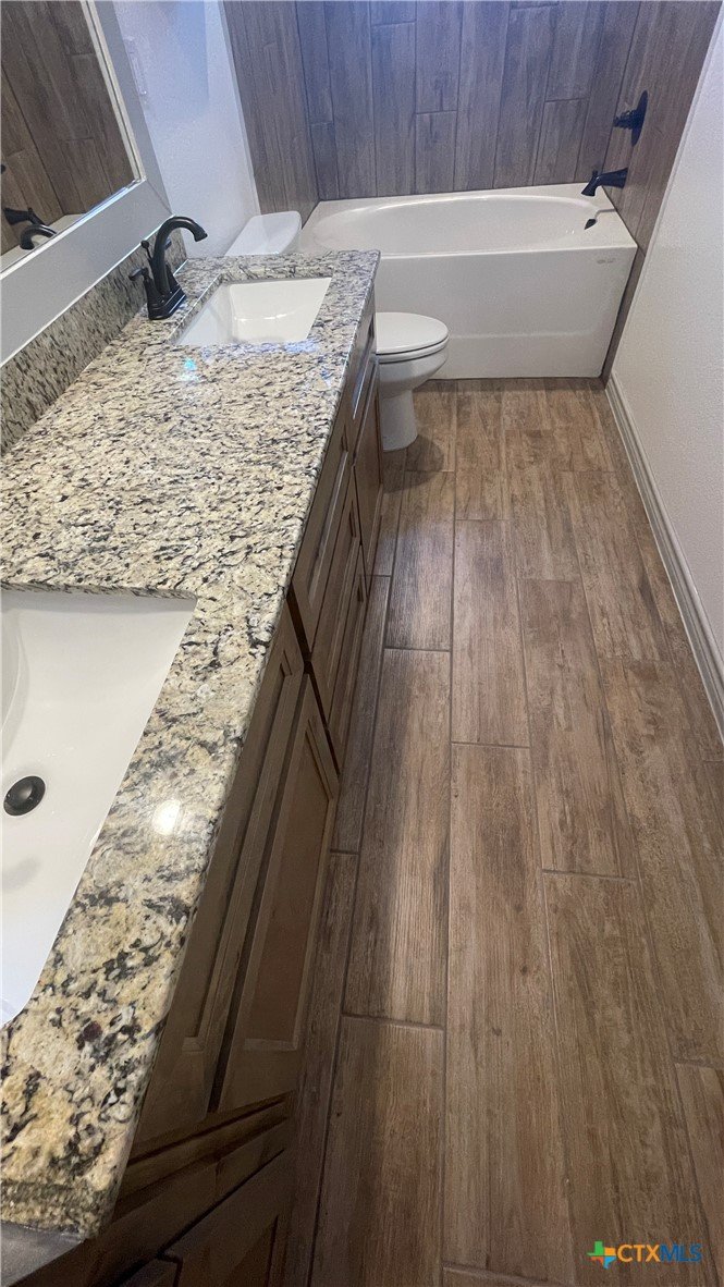 Beautifully maintained 3-bed, 2-bath duplex unit in an EXCELLENT LOCATION in Pecan Creek. Near Baylor Scott & White Medical Center, VA Hospital, and Temple College. Features wood-look tile flooring throughout, custom stained cabinets, granite countertops, large pantry, and extra hallway storage. Ceiling fans in living room and all bedrooms. Spacious primary suite with double vanities, garden tub, oversized custom mirror, and walk-in closet. Private full wood-fenced yard with sprinkler system, sod, and flowerbeds. 2" faux wood blinds. Stainless refrigerator with water & ice. Garage with Wi-Fi opener. Landlord pays HOA. Available now. Must see!
