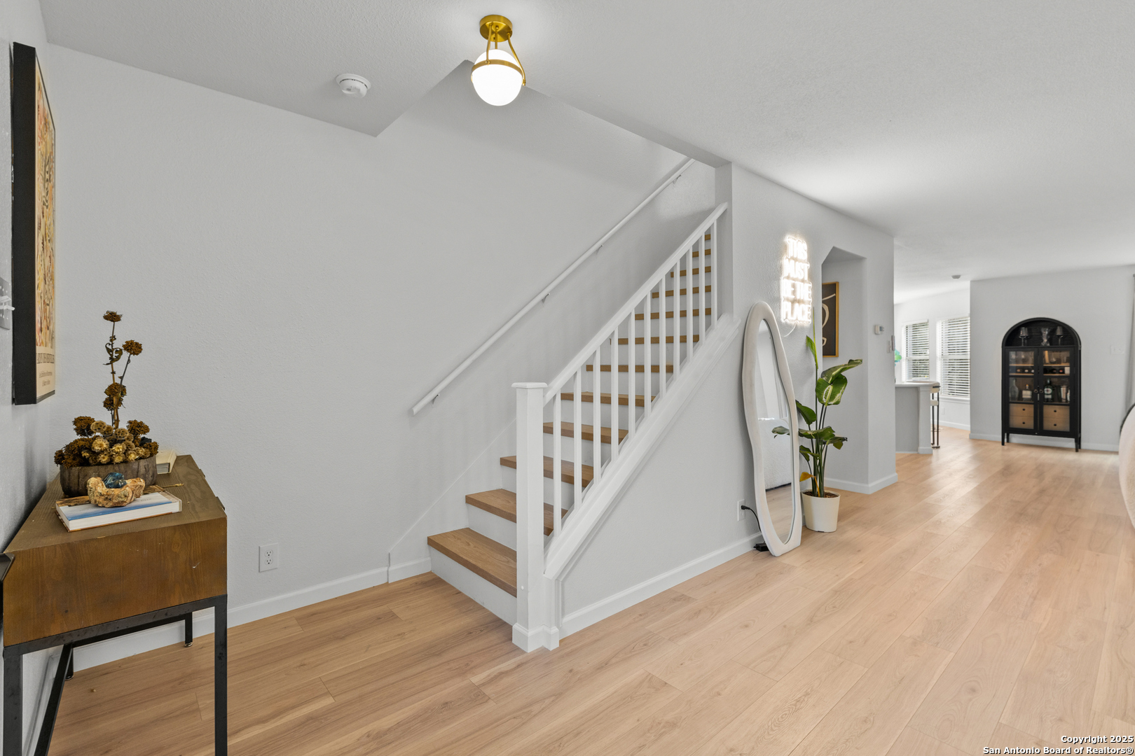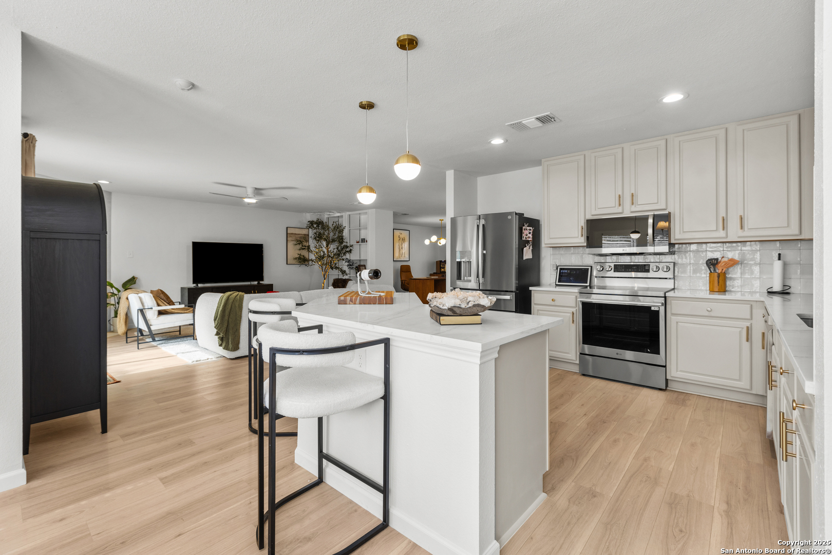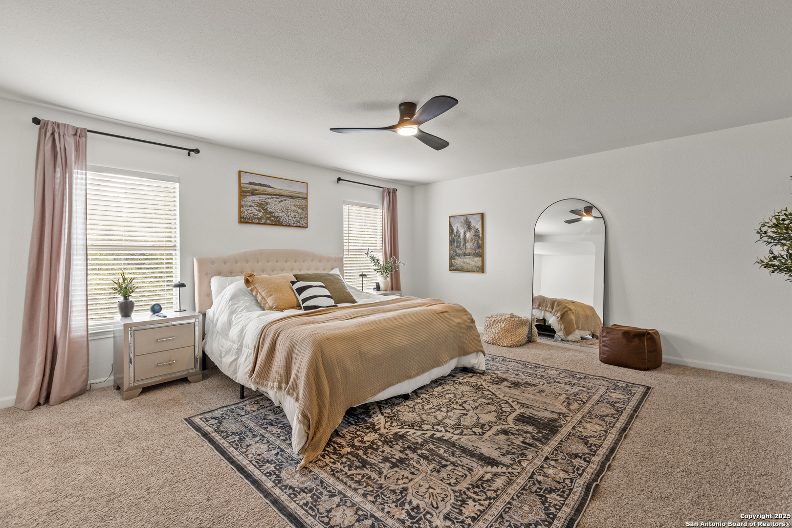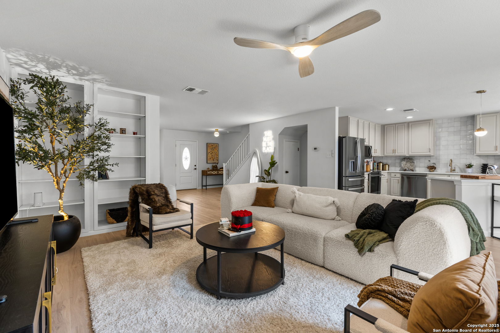 Take advantage of $5,000 closing cost assistance on 2414 Melrose Canyon, a stunning home in Canyon View! Ideal for buyers searching for value, modern features, and a prime location. Mature oak trees create a picturesque first impression as you arrive at this beautifully updated 3-bedroom, 2.5-bath home nestled on a peaceful greenbelt lot-offering both privacy and stunning natural views. Step inside to an inviting open-concept floor plan with gorgeous flooring throughout the main living and dining areas, perfect for both everyday living and entertaining. As you enter, the front flex space can easily be used as a home office, formal dining room, or additional living area to suit your lifestyle needs. The spacious living room features a beautiful fireplace and large glass doors that open to an elevated deck-ideal for relaxing and enjoying the lush, tree-filled backyard. The island kitchen flows seamlessly into the breakfast nook, providing a warm and functional space for casual dining. Upstairs, the expansive primary suite offers a tranquil retreat with a versatile sitting area-perfect for a home office, nursery, or reading corner. The updated primary bath showcases modern finishes, dual vanities, and a walk-in shower for ultimate comfort and style. Two additional bedrooms, a beautifully remodeled secondary bath, and a flexible game room-currently utilized as a media/theatre room-offer plenty of room for family and guests. Located just minutes from Loop 1604, this home provides quick access to top-rated schools, shopping, dining, and military bases. Experience the perfect balance of comfort, convenience, and natural beauty-schedule your private tour today and discover why Canyon View is one of San Antonio's most sought-after neighborhoods!