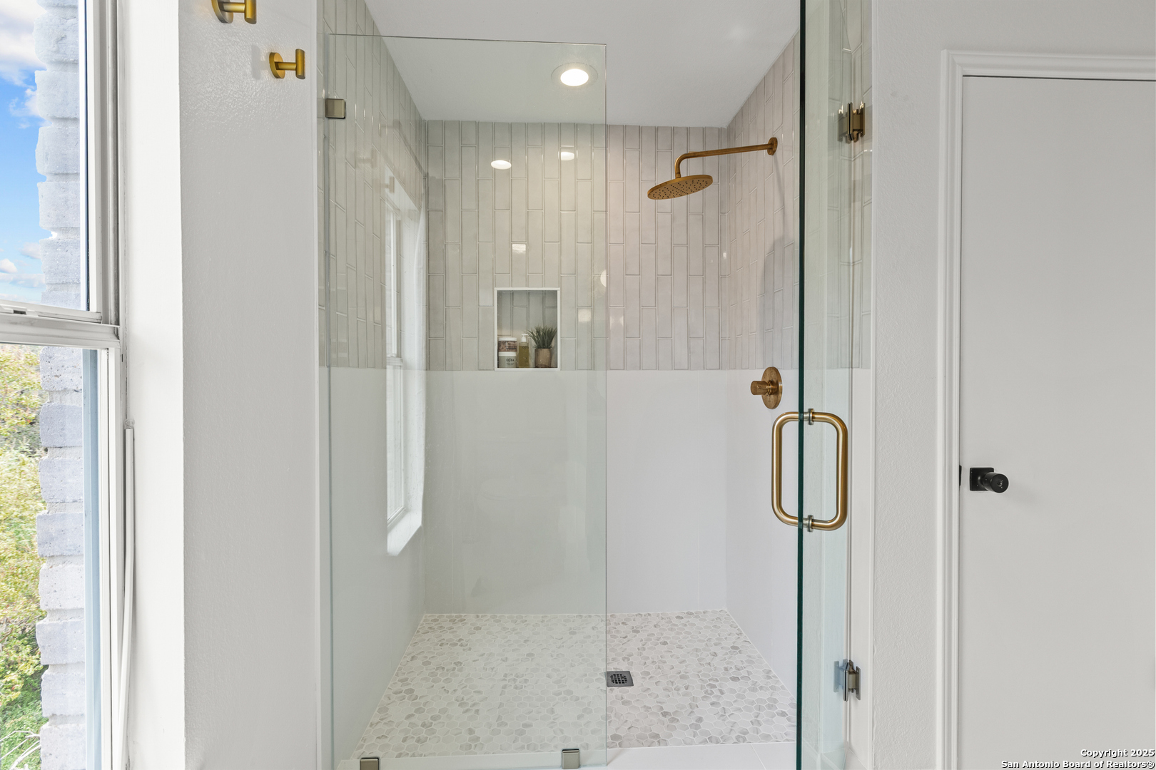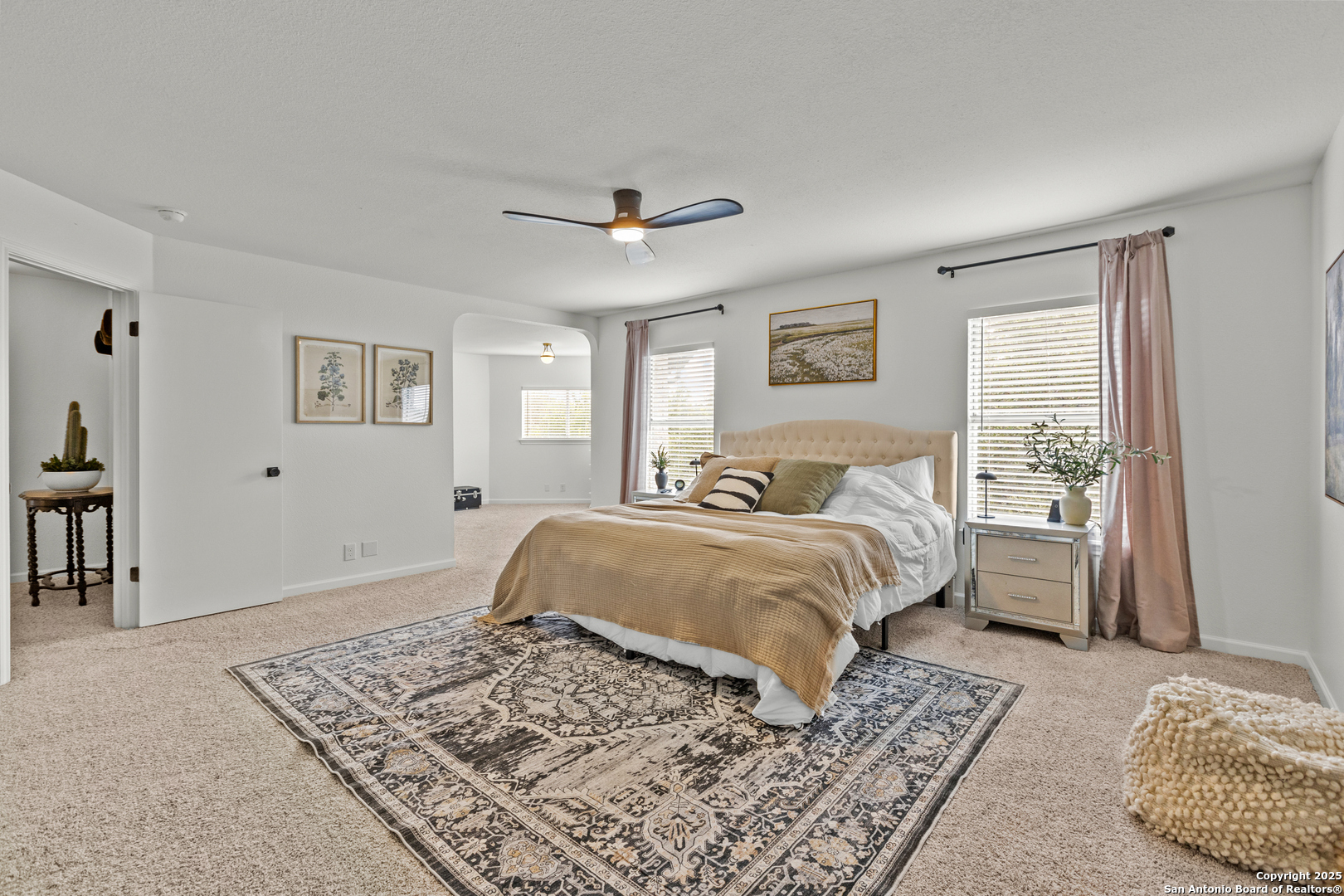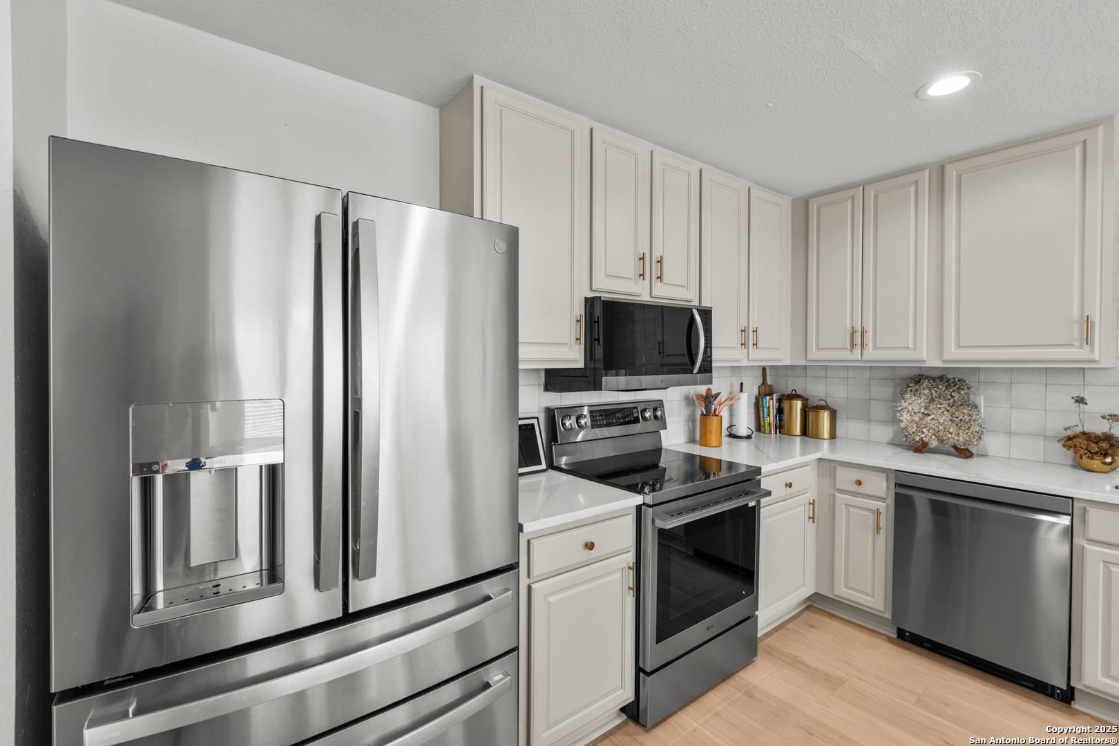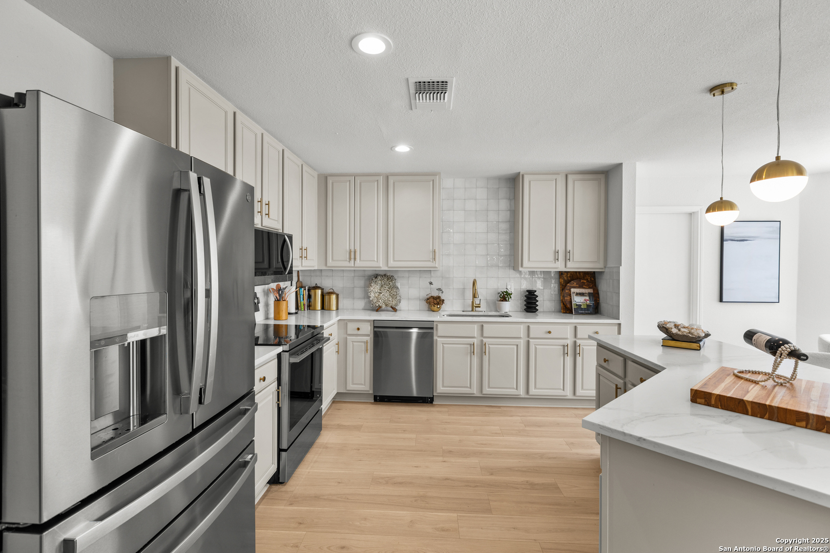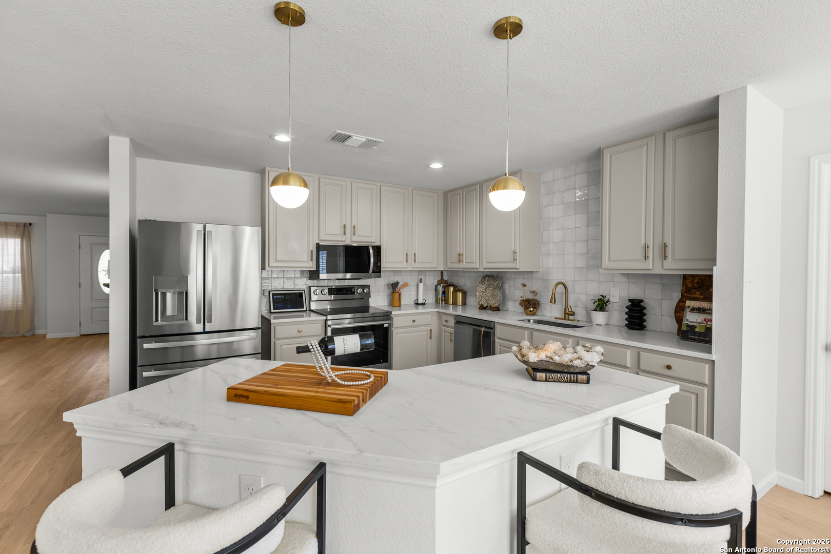Take advantage of $5,000 closing cost assistance on 2414 Melrose Canyon, a stunning home in Canyon View! Ideal for buyers searching for value, modern features, and a prime location. Mature oak trees create a picturesque first impression as you arrive at this beautifully updated 3-bedroom, 2.5-bath home nestled on a peaceful greenbelt lot-offering both privacy and stunning natural views. Step inside to an inviting open-concept floor plan with gorgeous flooring throughout the main living and dining areas, perfect for both everyday living and entertaining. As you enter, the front flex space can easily be used as a home office, formal dining room, or additional living area to suit your lifestyle needs. The spacious living room features a beautiful fireplace and large glass doors that open to an elevated deck-ideal for relaxing and enjoying the lush, tree-filled backyard. The island kitchen flows seamlessly into the breakfast nook, providing a warm and functional space for casual dining. Upstairs, the expansive primary suite offers a tranquil retreat with a versatile sitting area-perfect for a home office, nursery, or reading corner. The updated primary bath showcases modern finishes, dual vanities, and a walk-in shower for ultimate comfort and style. Two additional bedrooms, a beautifully remodeled secondary bath, and a flexible game room-currently utilized as a media/theatre room-offer plenty of room for family and guests. Located just minutes from Loop 1604, this home provides quick access to top-rated schools, shopping, dining, and military bases. Experience the perfect balance of comfort, convenience, and natural beauty-schedule your private tour today and discover why Canyon View is one of San Antonio's most sought-after neighborhoods!