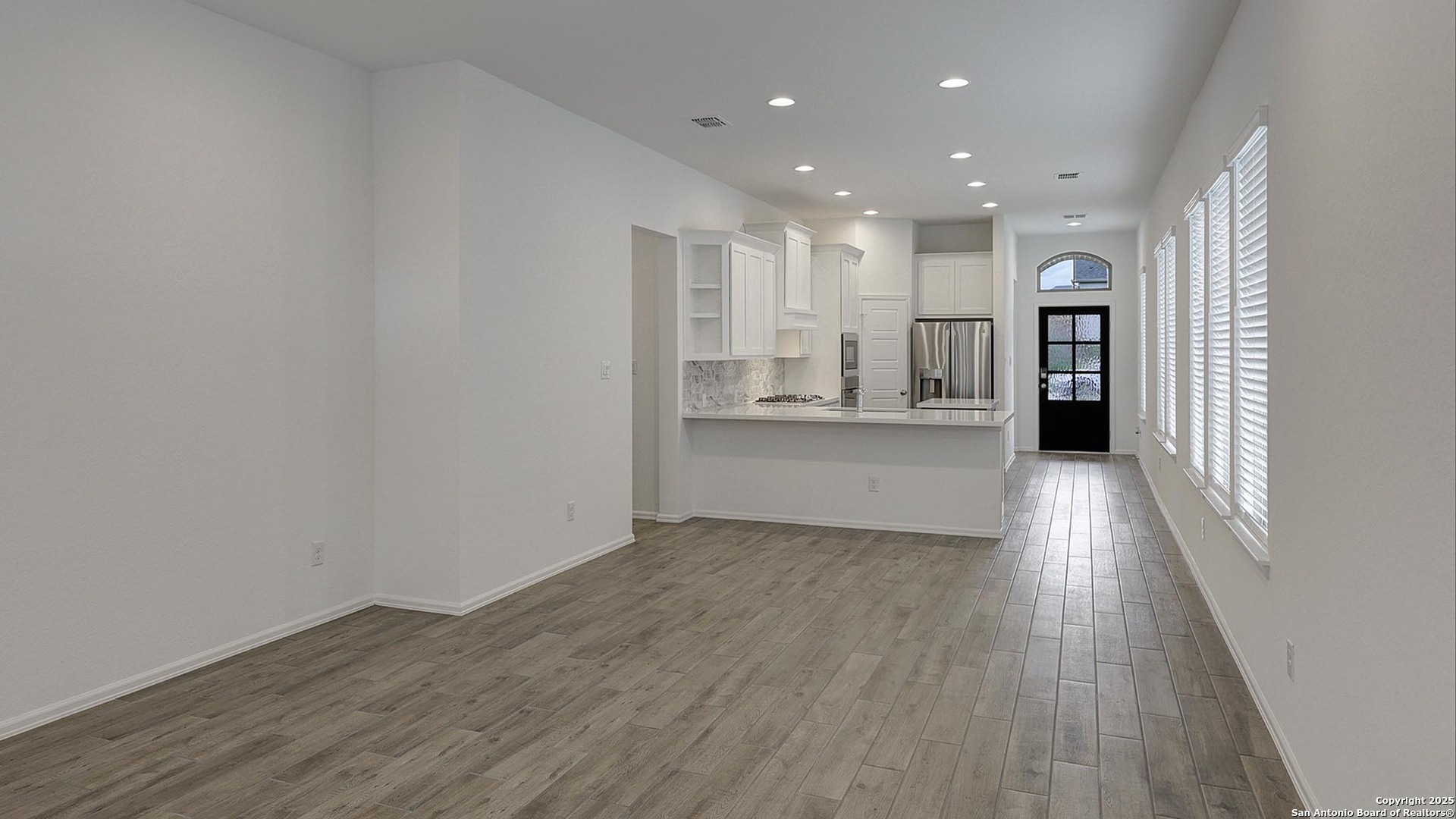 Entry leads to open kitchen, dining area and family room. Abundant natural light throughout. Kitchen features center island, 5-burner gas cooktop and corner walk-in pantry. Family room features wall of windows. Primary suite includes primary bath with dual vanities, separate glass-enclosed shower and large walk-in closet. Generous closet space adds to this three-bedroom home. Covered backyard patio. Mud room off two-car garage and multi-zone sprinkler system.