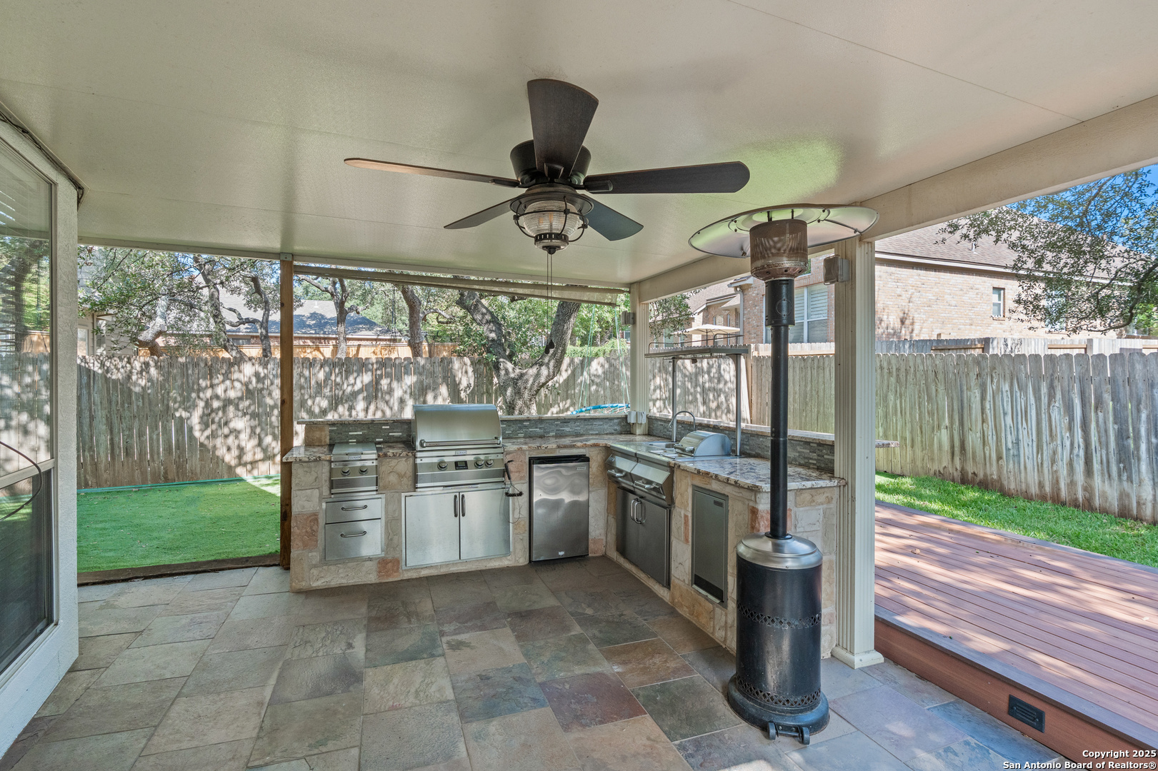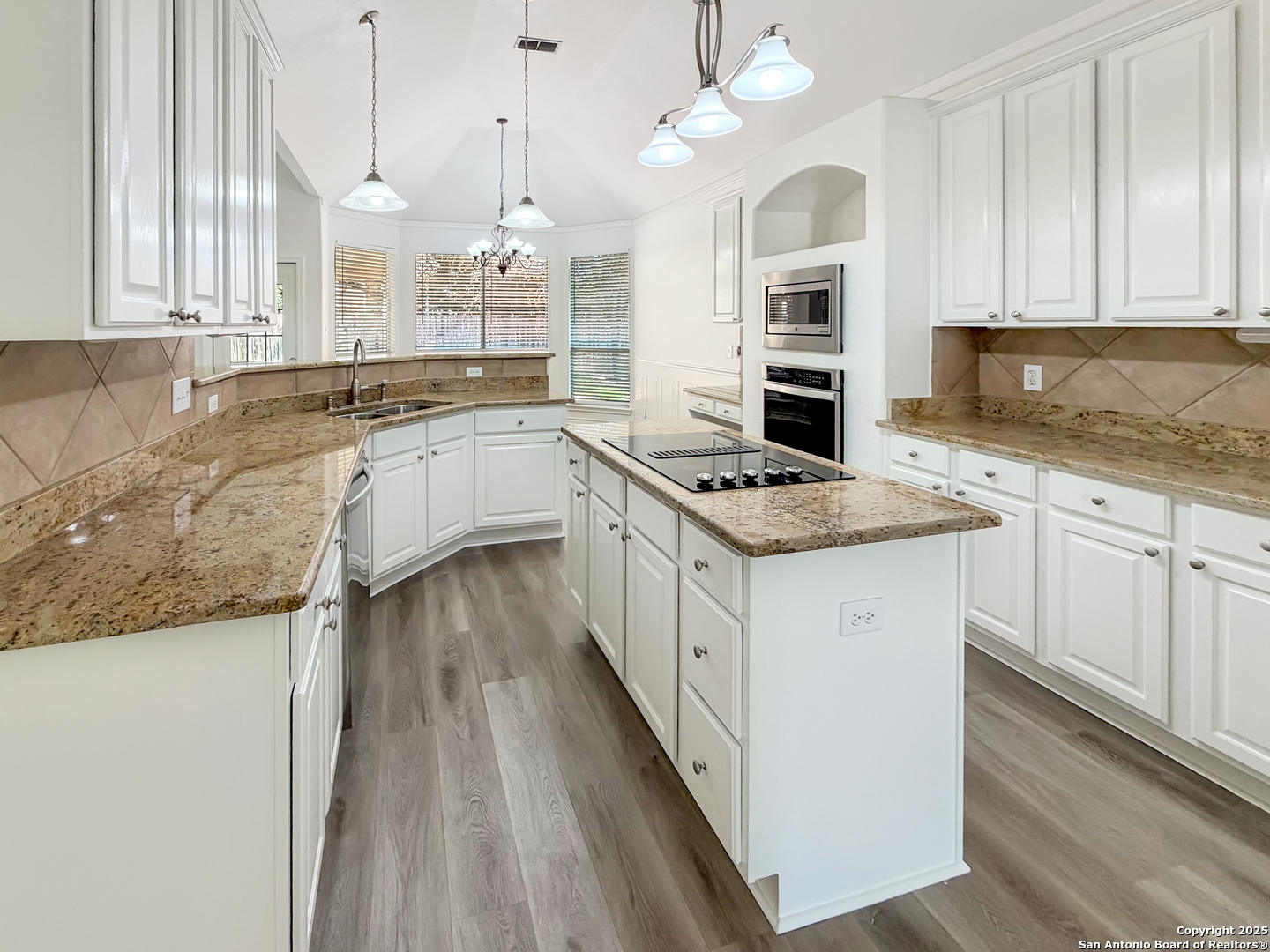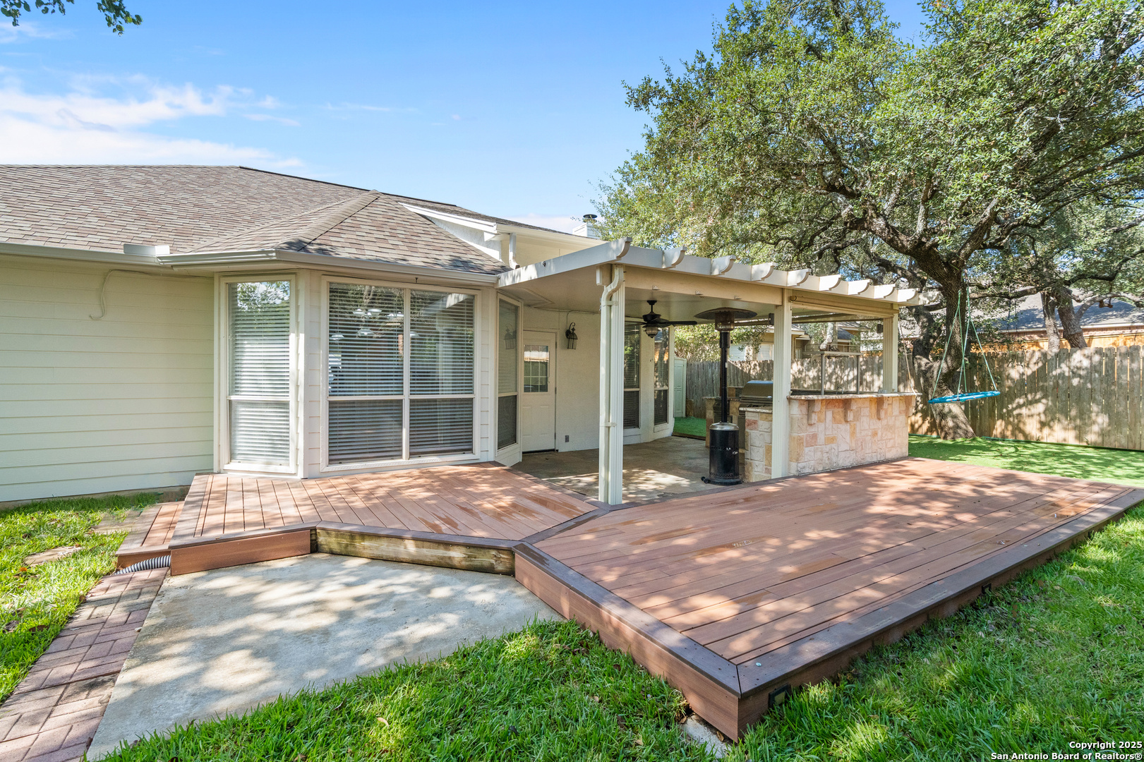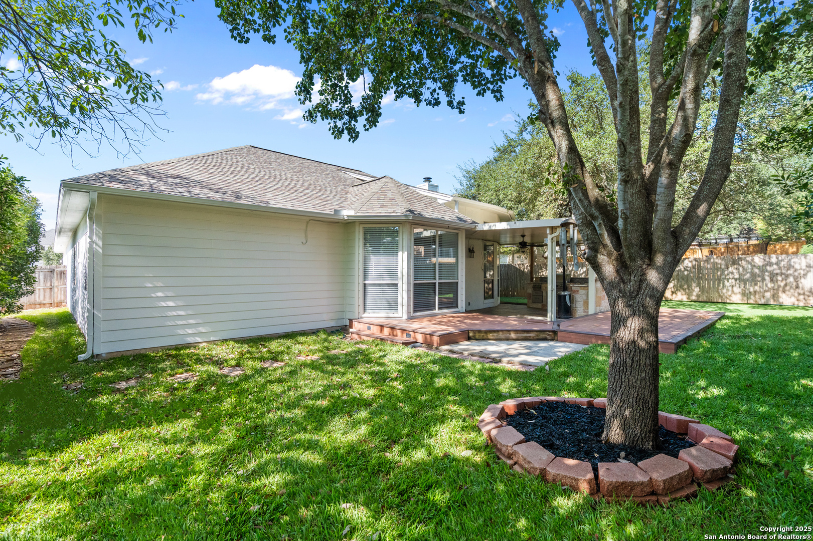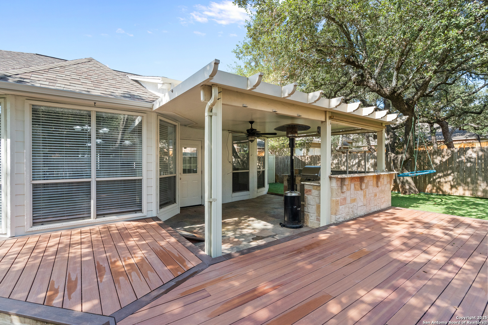 Step into the perfect blend of comfort and elegance in this beautifully upgraded custom home nestled inside the coveted Mountain Lodge community. Designed for effortless entertaining and everyday living, this light-filled residence impresses from the moment you arrive. This is not your average home. It features elevated upgrades throughout, including elegant tray ceilings and soaring 20ft, 12ft, and 10ft ceilings. The wide-open floor plan seamlessly flows from the formal dining room to a spacious living area with a cozy fireplace and walls of windows that bring the outdoors in. Fresh neutral paint inside, garage, & exterior in October 2025, durable vinyl plank flooring throughout (no carpet), newly resurfaced counters and bath tubs in the secondary bathrooms, brand-new front and back doors, new front landscaping, new sod in the backyard, full sprinklers with a new control panel, & so much more. The island kitchen is the heart of the home with granite countertops, bar seating, crisp white cabinetry, and stainless steel appliances that are only three years old. The luxurious & spacious primary retreat features a clawfoot soaking tub, oversized mudset shower with frameless door, upgraded vanities, & large walk-in closet. Three generous secondary bedrooms are tucked away on the opposite side of the home with a Jack and Jill bath and an additional hallway bath for extra comfort and convenience. Step outside to a backyard built for year-round enjoyment with fresh sod, mature trees, storage shed, a covered patio, and a full outdoor kitchen with a gas grill, two burners, blender, sink, refrigerator, & sun shades. The large composite deck and artificially turfed shaded area creates the perfect setting for relaxing or entertaining. Ideally situated at the quiet back of the neighborhood with minimal traffic, this home is zoned to award-winning North East ISD schools including Tuscany Heights Elementary within walking distance, Tejeda Middle School, and Johnson High School. Mountain Lodge is a gated community and offers two pools, two shaded baby pools, a basketball court, and a neighborhood park. After years of construction, HWY 281 is now open northbound & southbound making the drive to and from 1604 quick & easy. Conveniently located close to JW Marriott's TPC golf course, Stone Oak shopping & dining, hospitals, and major employers. This is more than a house, it is a lifestyle. Welcome home to Mountain Lodge!