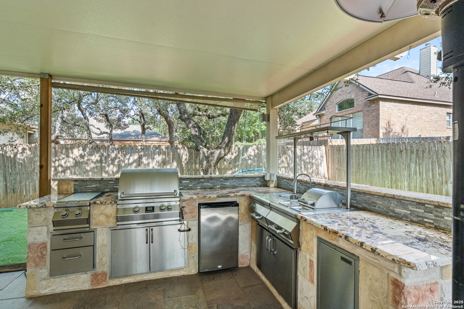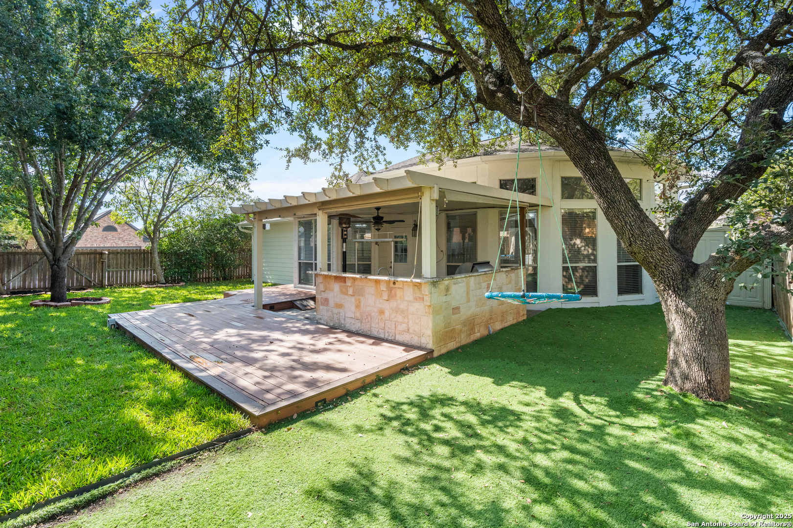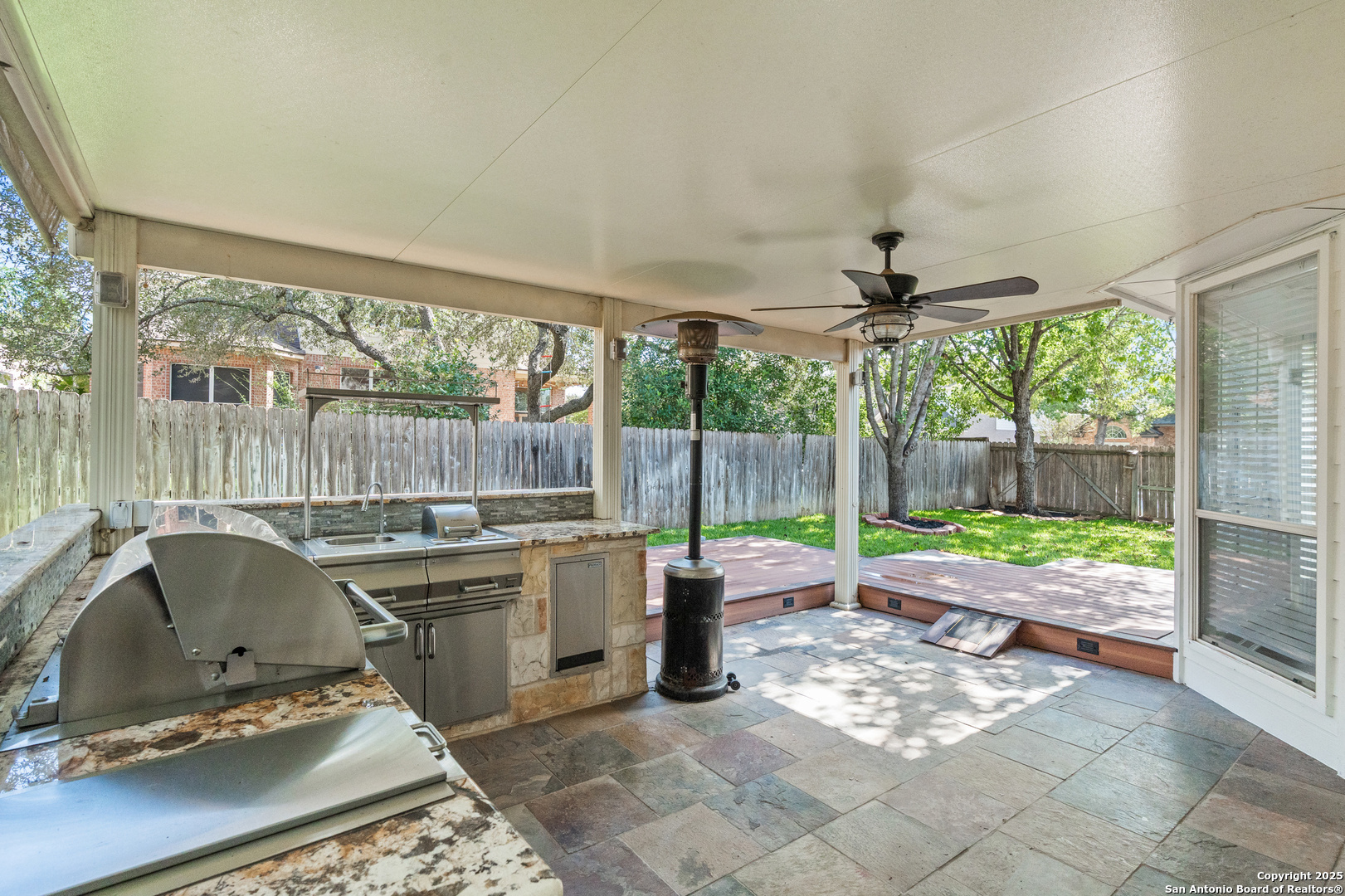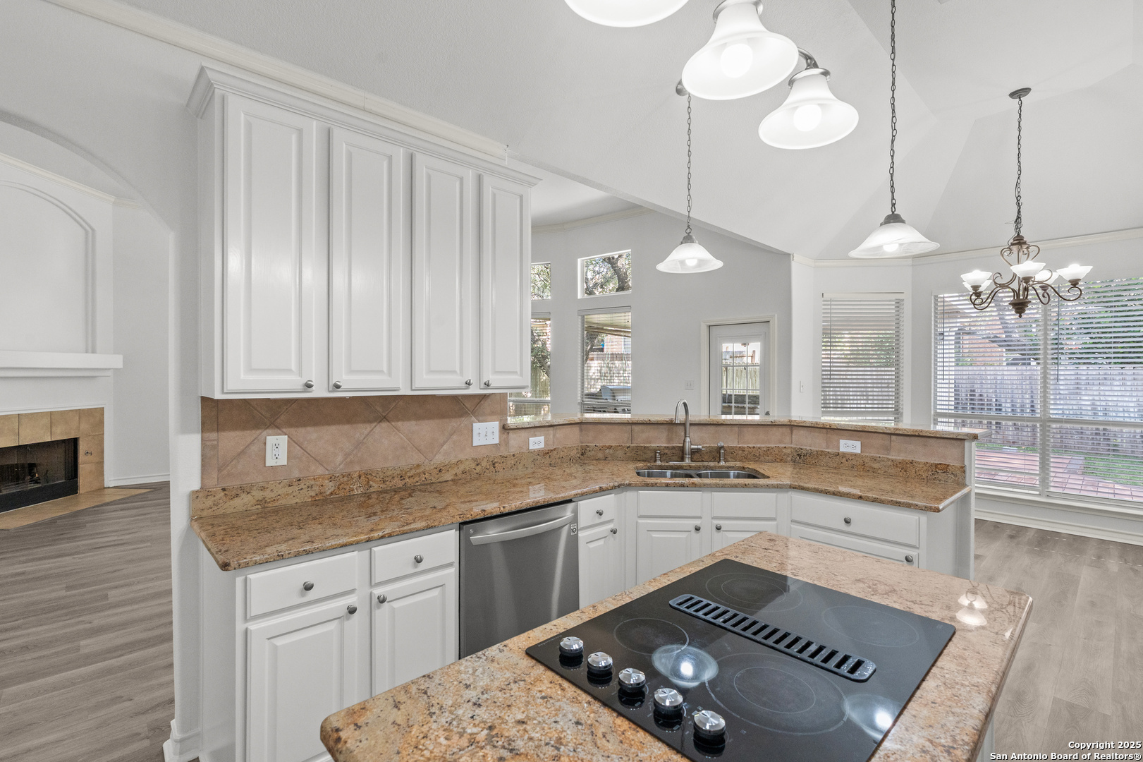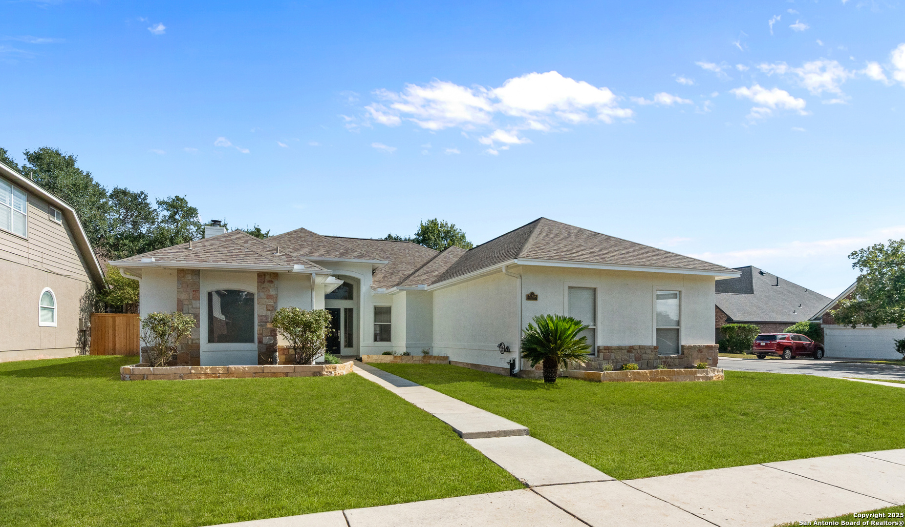 Step into the perfect blend of comfort and elegance in this beautifully upgraded custom home nestled inside the coveted Mountain Lodge community. Designed for effortless entertaining and everyday living, this light-filled residence impresses from the moment you arrive. This is not your average home. It features elevated upgrades throughout, including elegant tray ceilings and soaring 20ft, 12ft, and 10ft ceilings. The wide-open floor plan seamlessly flows from the formal dining room to a spacious living area with a cozy fireplace and walls of windows that bring the outdoors in. Fresh neutral paint inside, garage, & exterior in October 2025, durable vinyl plank flooring throughout (no carpet), newly resurfaced counters and bath tubs in the secondary bathrooms, brand-new front and back doors, new front landscaping, new sod in the backyard, full sprinklers with a new control panel, & so much more. The island kitchen is the heart of the home with granite countertops, bar seating, crisp white cabinetry, and stainless steel appliances that are only three years old. The luxurious & spacious primary retreat features a clawfoot soaking tub, oversized mudset shower with frameless door, upgraded vanities, & large walk-in closet. Three generous secondary bedrooms are tucked away on the opposite side of the home with a Jack and Jill bath and an additional hallway bath for extra comfort and convenience. Step outside to a backyard built for year-round enjoyment with fresh sod, mature trees, storage shed, a covered patio, and a full outdoor kitchen with a gas grill, two burners, blender, sink, refrigerator, & sun shades. The large composite deck and artificially turfed shaded area creates the perfect setting for relaxing or entertaining. Ideally situated at the quiet back of the neighborhood with minimal traffic, this home is zoned to award-winning North East ISD schools including Tuscany Heights Elementary within walking distance, Tejeda Middle School, and Johnson High School. Mountain Lodge is a gated community and offers two pools, two shaded baby pools, a basketball court, and a neighborhood park. After years of construction, HWY 281 is now open northbound & southbound making the drive to and from 1604 quick & easy. Conveniently located close to JW Marriott's TPC golf course, Stone Oak shopping & dining, hospitals, and major employers. This is more than a house, it is a lifestyle. Welcome home to Mountain Lodge!