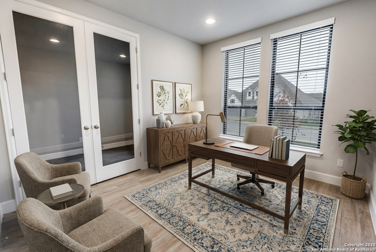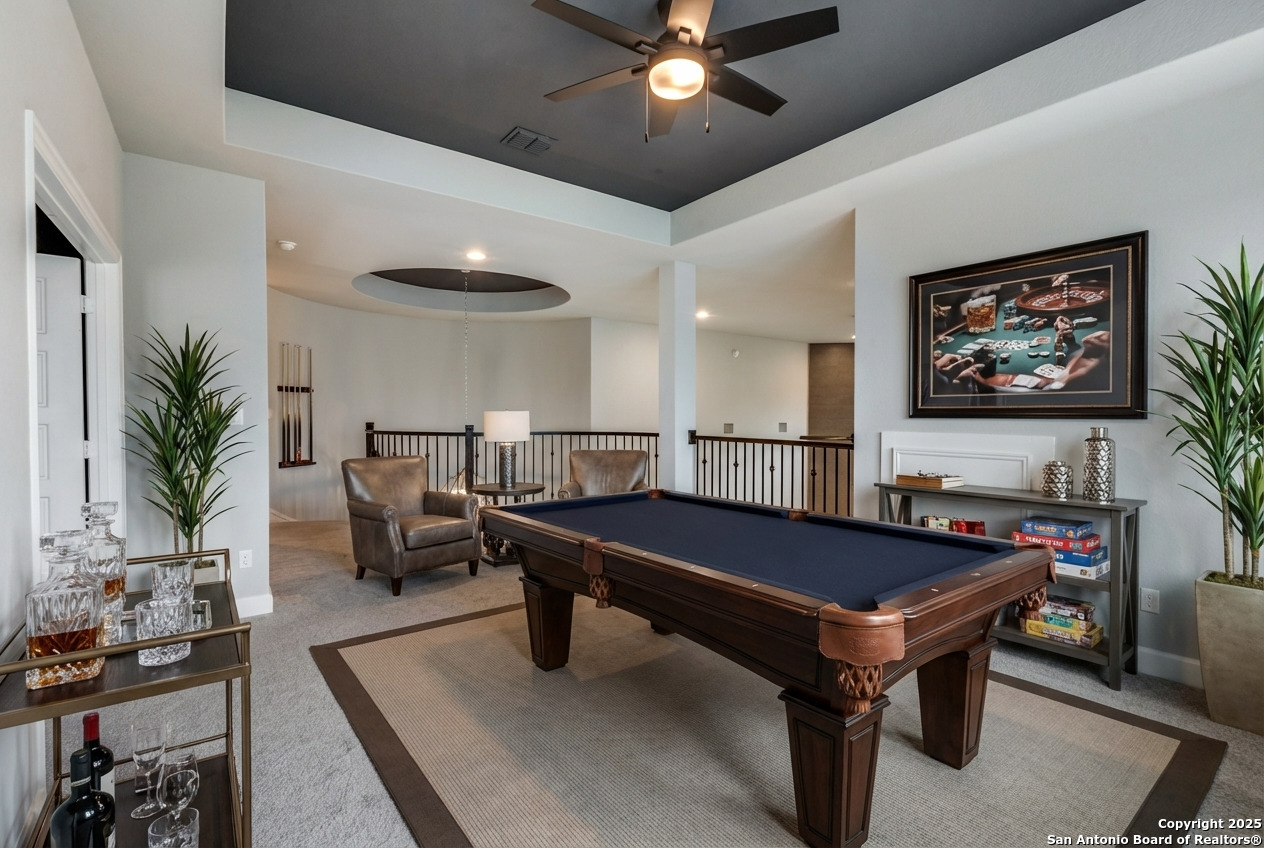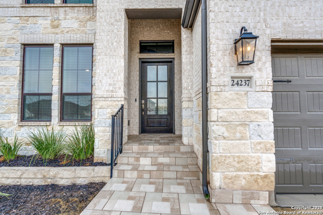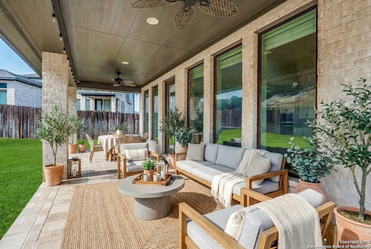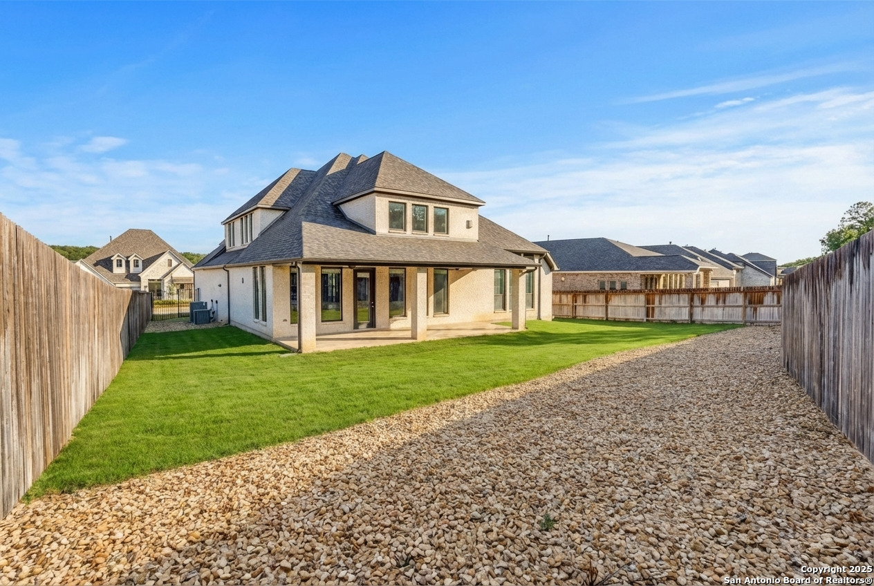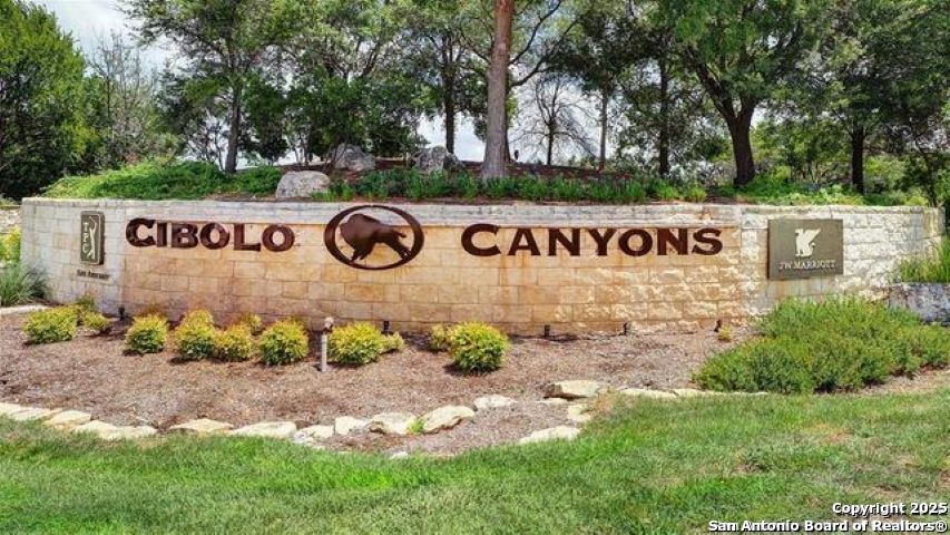 Experience luxury Hill Country living in the highly sought-after Cibolo Canyons community, just minutes from the renowned JW Marriott TPC Golf Resort. This exceptional two-story home offers elegance, comfort, and thoughtful upgrades throughout. A breathtaking curved staircase welcomes you into the grand entryway, with glass French doors leading to a private home office. The formal dining room features a stylish accent wall, adding sophistication and warmth. The spacious family room showcases a soaring two-story ceiling, a striking accent wall, expansive picture windows that fill the home with natural light, a wood-mantel fireplace, and sliding glass doors that create seamless indoor-outdoor living. The chef's kitchen is designed for both beauty and function, featuring a large island with breakfast bar, upgraded countertops, and a 5-burner gas cooktop. Retreat to the luxurious primary suite with a 12-foot ceiling and a spa-inspired bath offering dual vanities, a garden tub, a separate glass-enclosed shower, and a walk-in closet upgraded with custom shelving and direct access to the utility room. A secondary bedroom with full bath serves as a convenient downstairs guest suite. Every room in the home is enhanced with added ceiling fans, ensuring comfort year-round. Step outside to an upgraded patio with stunning pavers, perfect for relaxation or entertaining. Additional exterior features include added gutters and access to over 6 miles of dog-friendly walking paths throughout the community-ideal for morning walks or evening strolls. The property also includes a functional mud room off the spacious 3-car garage with extra storage space, and the added benefit of no city taxes. Located in the beauty of the Hill Country with incredible views, exceptional amenities, and proximity to world-class golf and resort living, this home offers an unmatched lifestyle. Don't miss this opportunity-upgrades, comfort, and elegance abound in every corner.