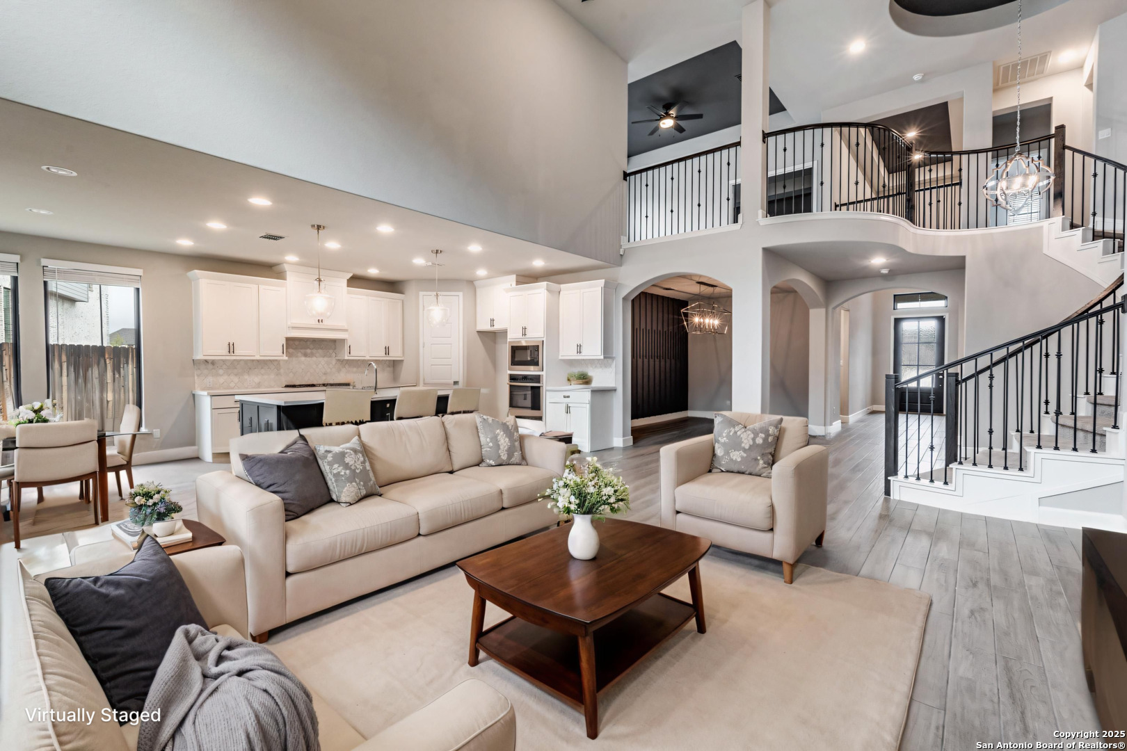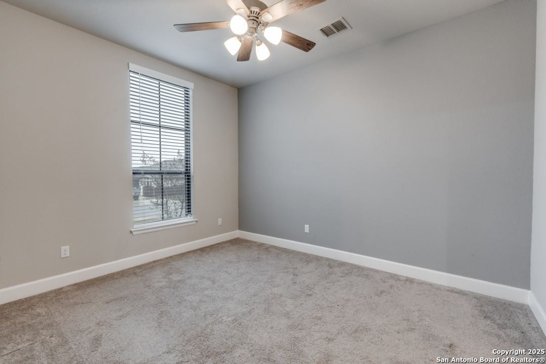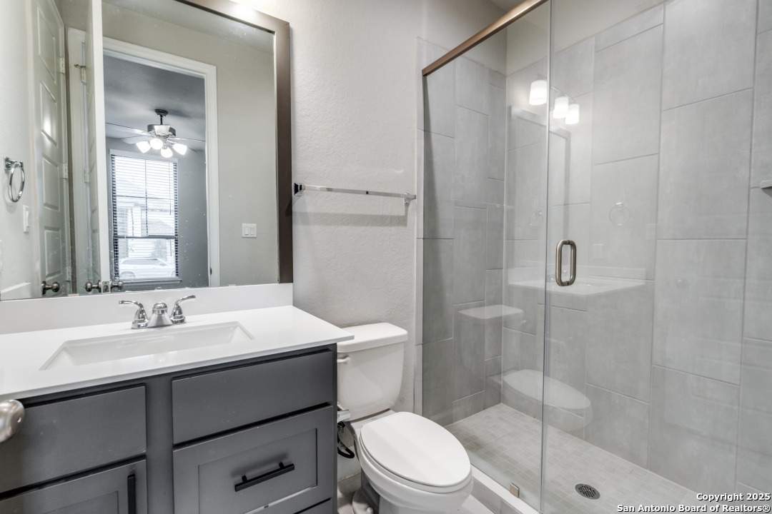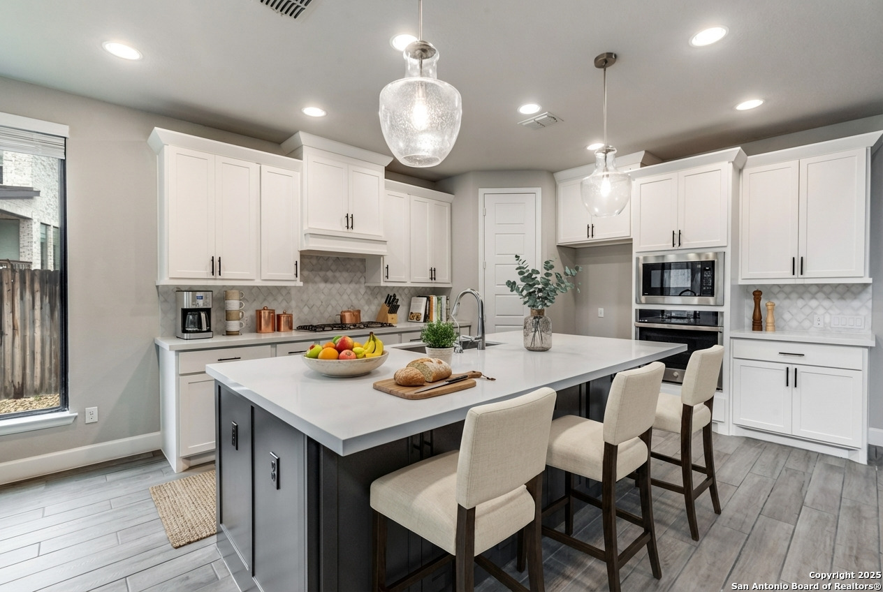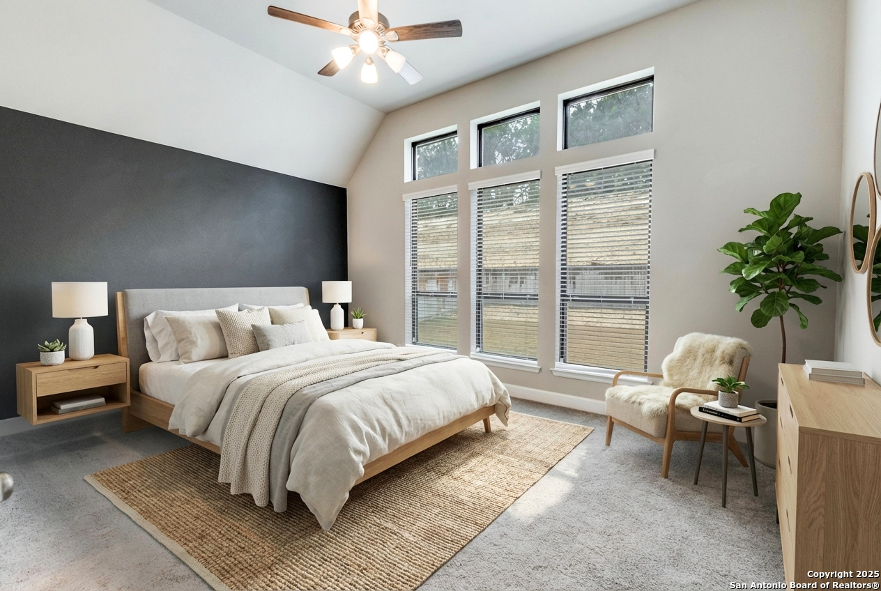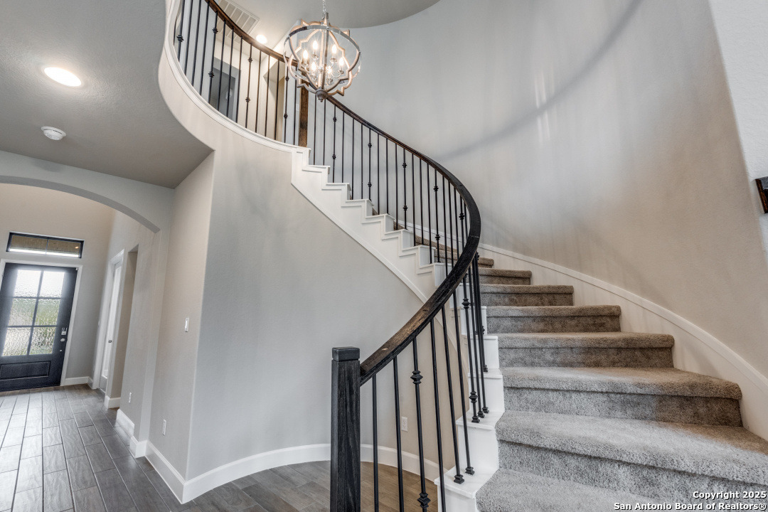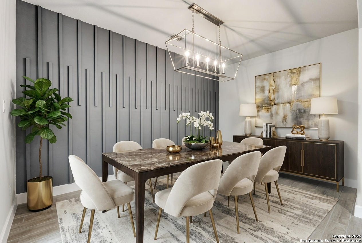 Experience luxury Hill Country living in the highly sought-after Cibolo Canyons community, just minutes from the renowned JW Marriott TPC Golf Resort. This exceptional two-story home offers elegance, comfort, and thoughtful upgrades throughout. A breathtaking curved staircase welcomes you into the grand entryway, with glass French doors leading to a private home office. The formal dining room features a stylish accent wall, adding sophistication and warmth. The spacious family room showcases a soaring two-story ceiling, a striking accent wall, expansive picture windows that fill the home with natural light, a wood-mantel fireplace, and sliding glass doors that create seamless indoor-outdoor living. The chef's kitchen is designed for both beauty and function, featuring a large island with breakfast bar, upgraded countertops, and a 5-burner gas cooktop. Retreat to the luxurious primary suite with a 12-foot ceiling and a spa-inspired bath offering dual vanities, a garden tub, a separate glass-enclosed shower, and a walk-in closet upgraded with custom shelving and direct access to the utility room. A secondary bedroom with full bath serves as a convenient downstairs guest suite. Every room in the home is enhanced with added ceiling fans, ensuring comfort year-round. Step outside to an upgraded patio with stunning pavers, perfect for relaxation or entertaining. Additional exterior features include added gutters and access to over 6 miles of dog-friendly walking paths throughout the community-ideal for morning walks or evening strolls. The property also includes a functional mud room off the spacious 3-car garage with extra storage space, and the added benefit of no city taxes. Located in the beauty of the Hill Country with incredible views, exceptional amenities, and proximity to world-class golf and resort living, this home offers an unmatched lifestyle. Don't miss this opportunity-upgrades, comfort, and elegance abound in every corner.