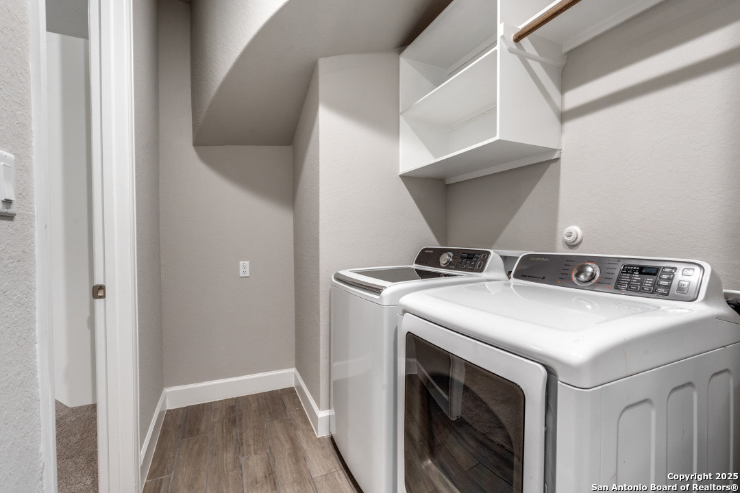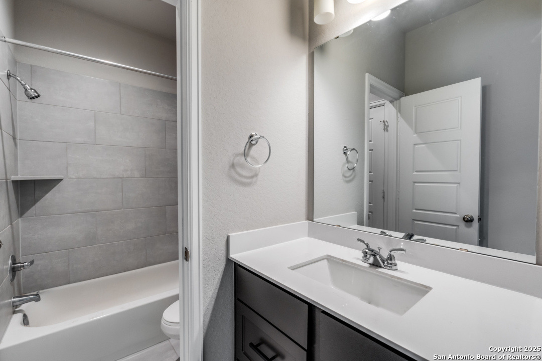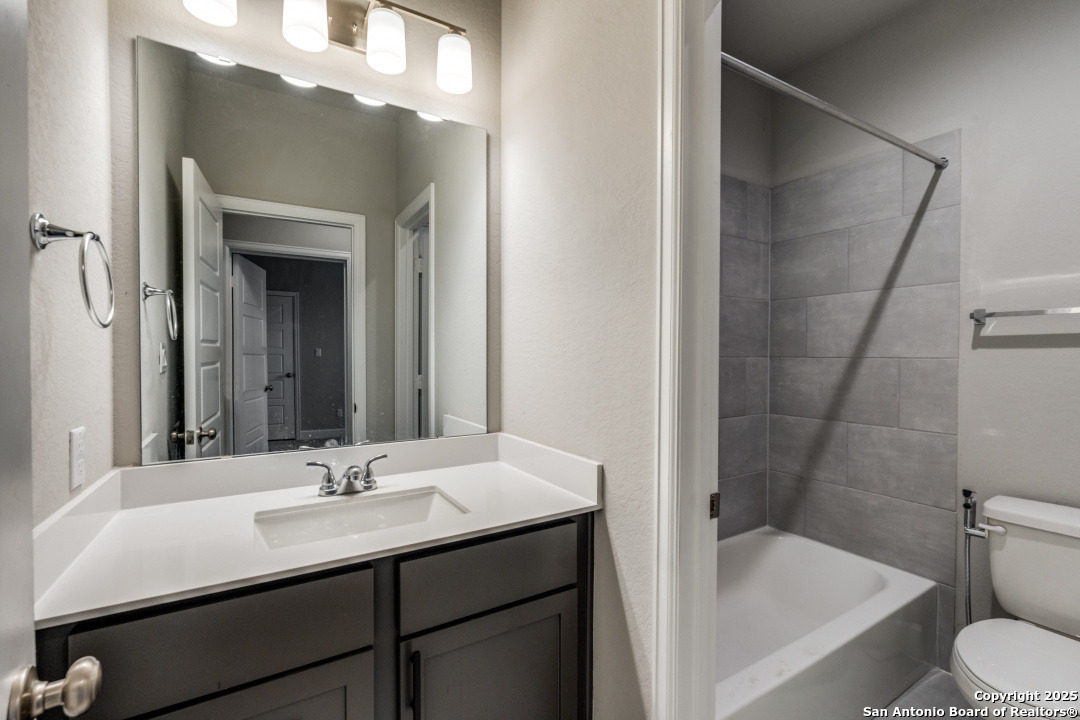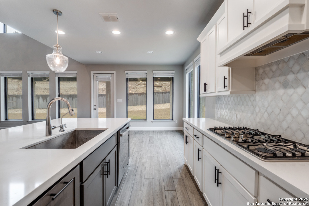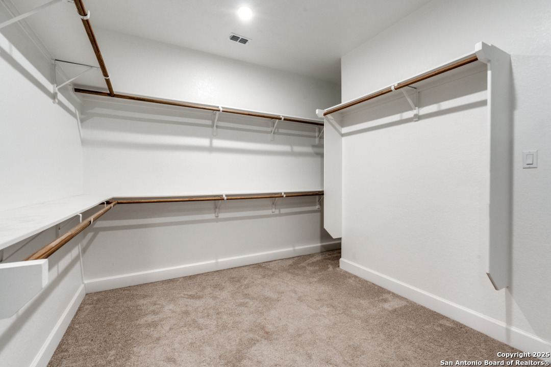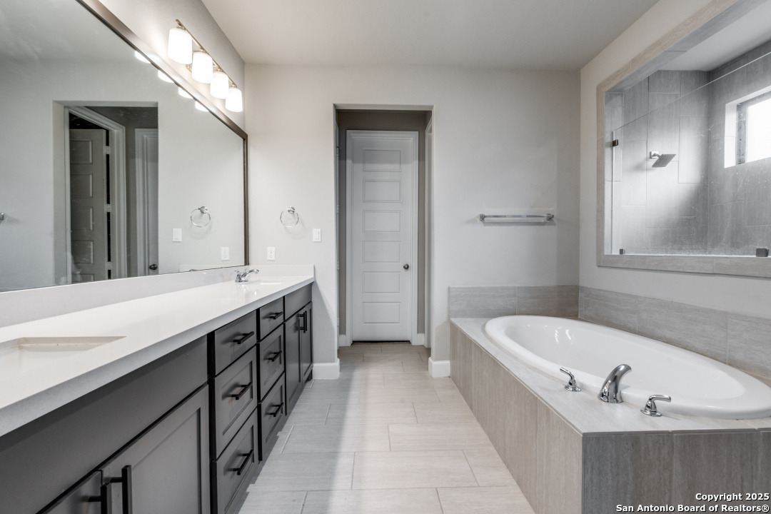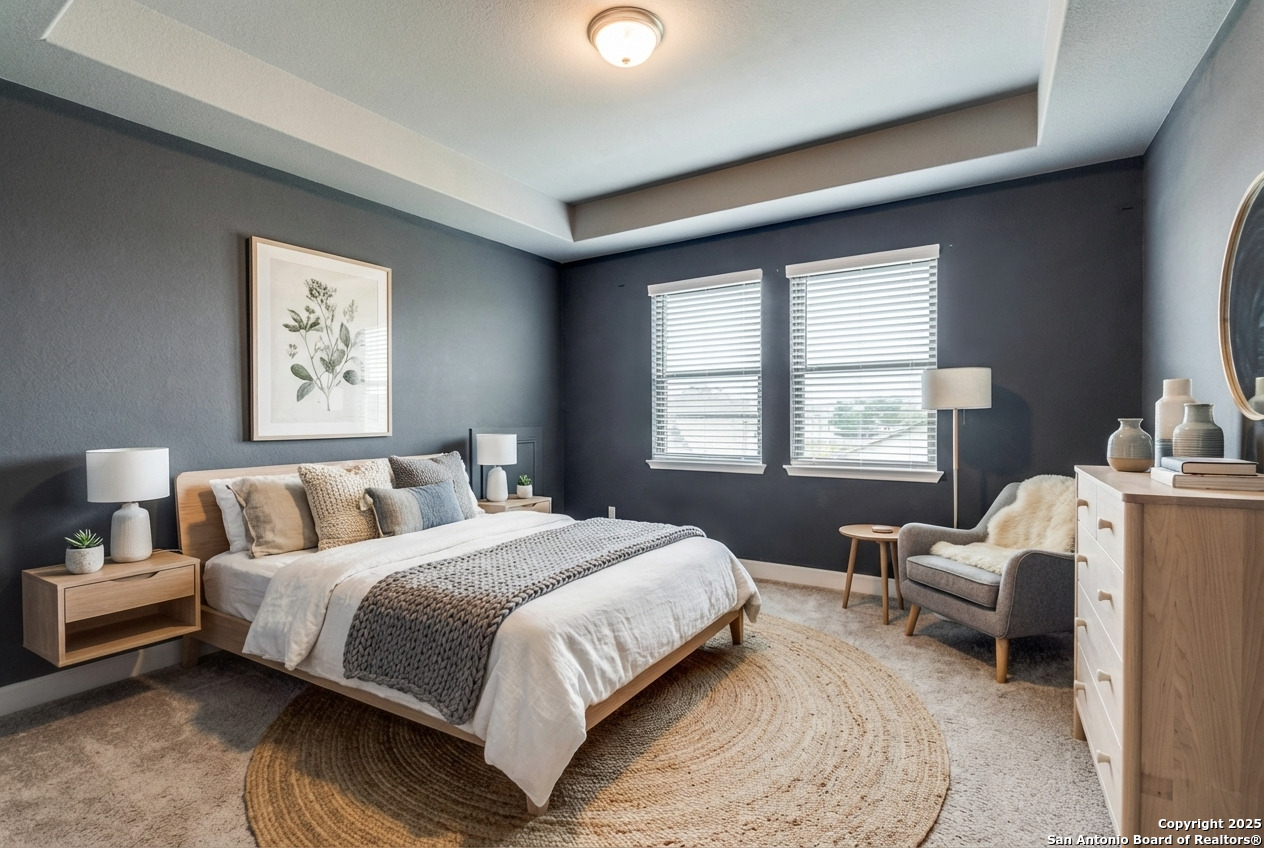 Experience luxury Hill Country living in the highly sought-after Cibolo Canyons community, just minutes from the renowned JW Marriott TPC Golf Resort. This exceptional two-story home offers elegance, comfort, and thoughtful upgrades throughout. A breathtaking curved staircase welcomes you into the grand entryway, with glass French doors leading to a private home office. The formal dining room features a stylish accent wall, adding sophistication and warmth. The spacious family room showcases a soaring two-story ceiling, a striking accent wall, expansive picture windows that fill the home with natural light, a wood-mantel fireplace, and sliding glass doors that create seamless indoor-outdoor living. The chef's kitchen is designed for both beauty and function, featuring a large island with breakfast bar, upgraded countertops, and a 5-burner gas cooktop. Retreat to the luxurious primary suite with a 12-foot ceiling and a spa-inspired bath offering dual vanities, a garden tub, a separate glass-enclosed shower, and a walk-in closet upgraded with custom shelving and direct access to the utility room. A secondary bedroom with full bath serves as a convenient downstairs guest suite. Every room in the home is enhanced with added ceiling fans, ensuring comfort year-round. Step outside to an upgraded patio with stunning pavers, perfect for relaxation or entertaining. Additional exterior features include added gutters and access to over 6 miles of dog-friendly walking paths throughout the community-ideal for morning walks or evening strolls. The property also includes a functional mud room off the spacious 3-car garage with extra storage space, and the added benefit of no city taxes. Located in the beauty of the Hill Country with incredible views, exceptional amenities, and proximity to world-class golf and resort living, this home offers an unmatched lifestyle. Don't miss this opportunity-upgrades, comfort, and elegance abound in every corner.
