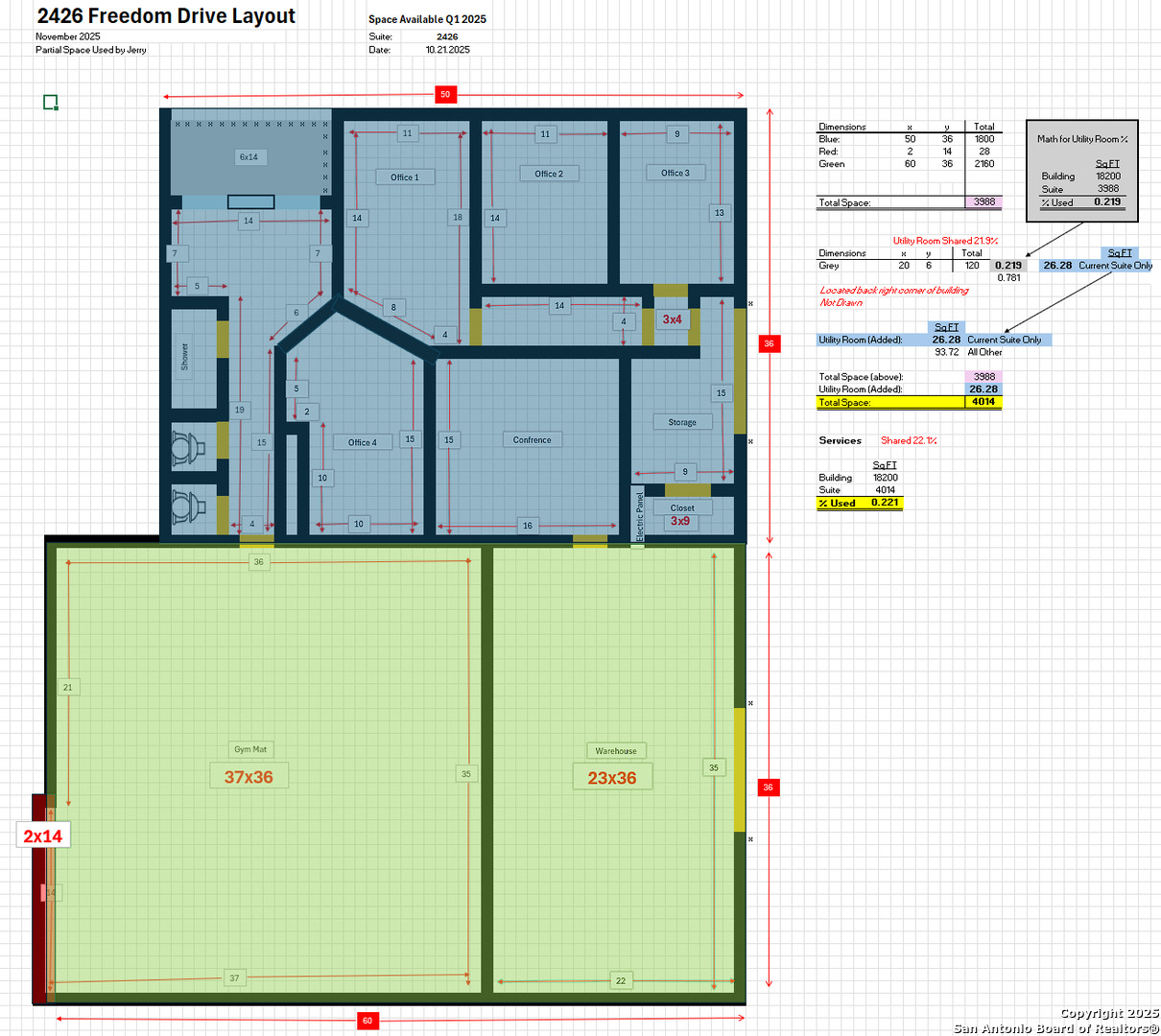Office and air conditioned warehouse space with bay door available near San Antonio Airport. i-1 zoning with three phase electrical power. 1800 square feet of office in four individual offices with a conference room, storage, two bathrooms and 2188 square feet of air conditioned warehouse space with 10x8 bay door and 22 inch raised loading dock. 2025 NNN are $1204/month Building utilities allocated