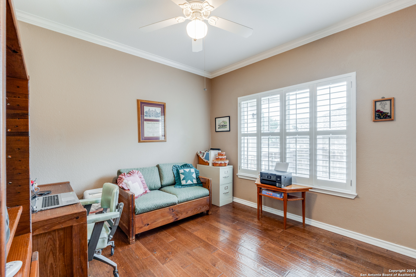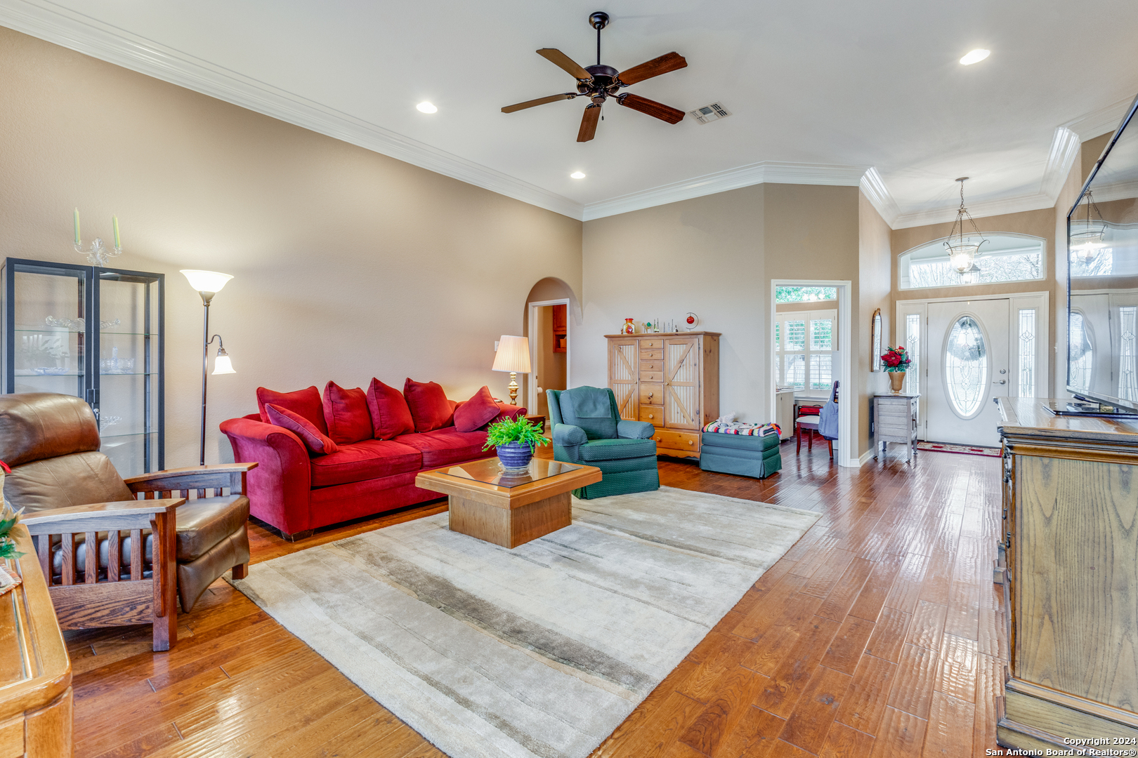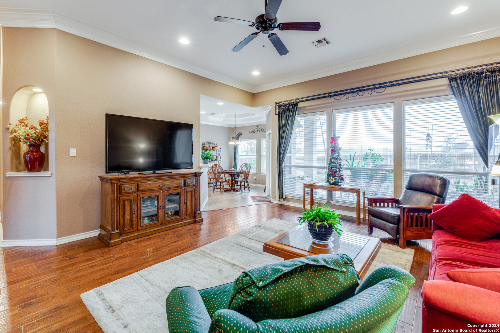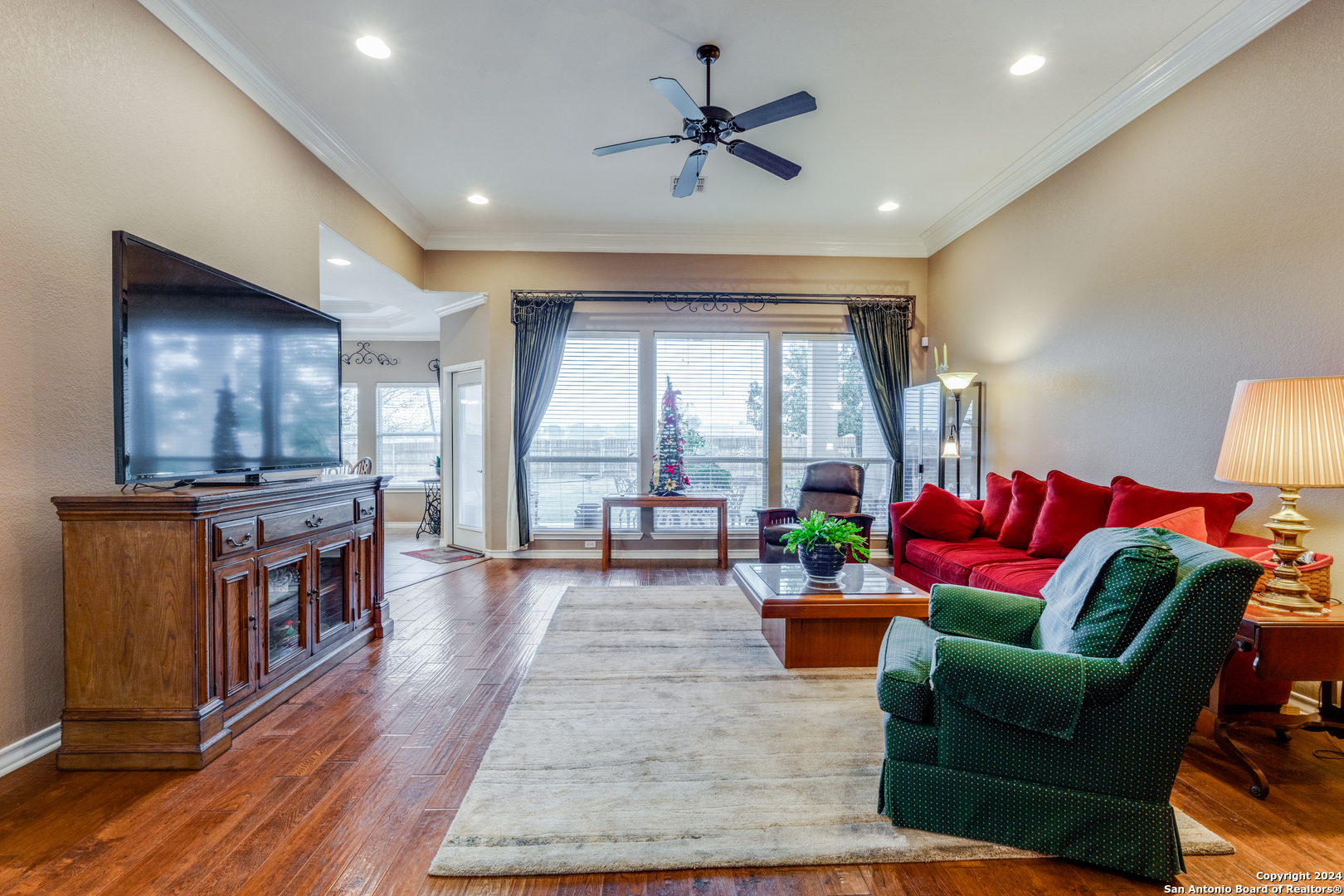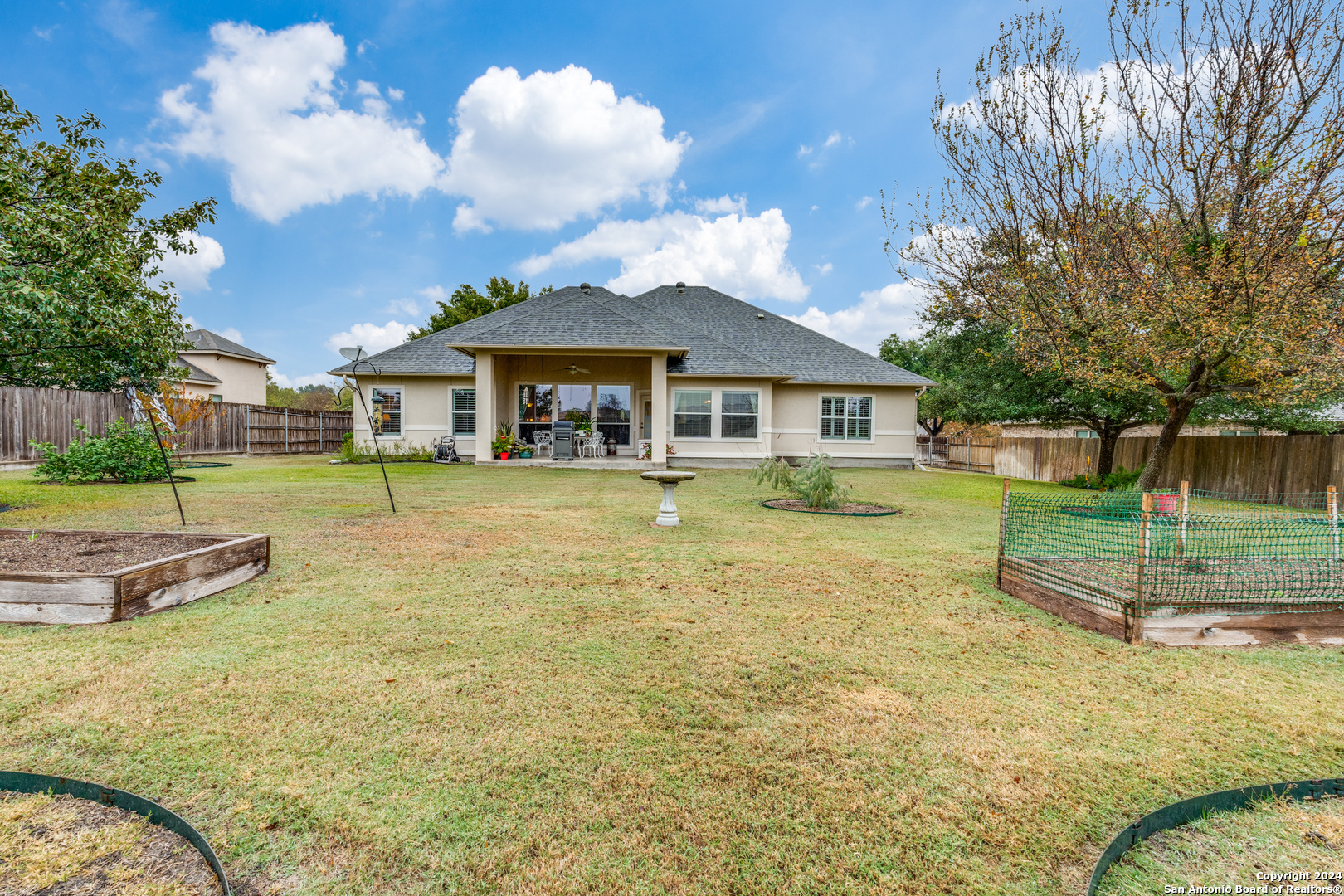 Check this beauty out!!! This quality custom 4 bedroom, 2.5 bath 2142sqft home is very well maintained and ready to move into!! This oasis has so many extras including an open plan with high ceilings, triple crown molding, recessed lighting, cove molding in all rooms, plantation shudders, only hardwood and ceramic flooring, and arches throughout. There are so many options on how to use all the extra space. The home boasts 2 large eating areas which can be converted into an office or a craft room. The kitchen features upgraded silestone countertops, custom oak cabinetry, breakfast bar, and stainless built-in appliances. The primary suite is great, opening up to a large bathroom and good-sized walk-in closet. The curb appeal is amazing!! From the circular driveway to the park-like feel in the huge backyard, this property has everything you are looking for. The neighborhood has private Guadalupe waterfront access and a great amenity center including pool, tennis courts, playground and clubhouse.