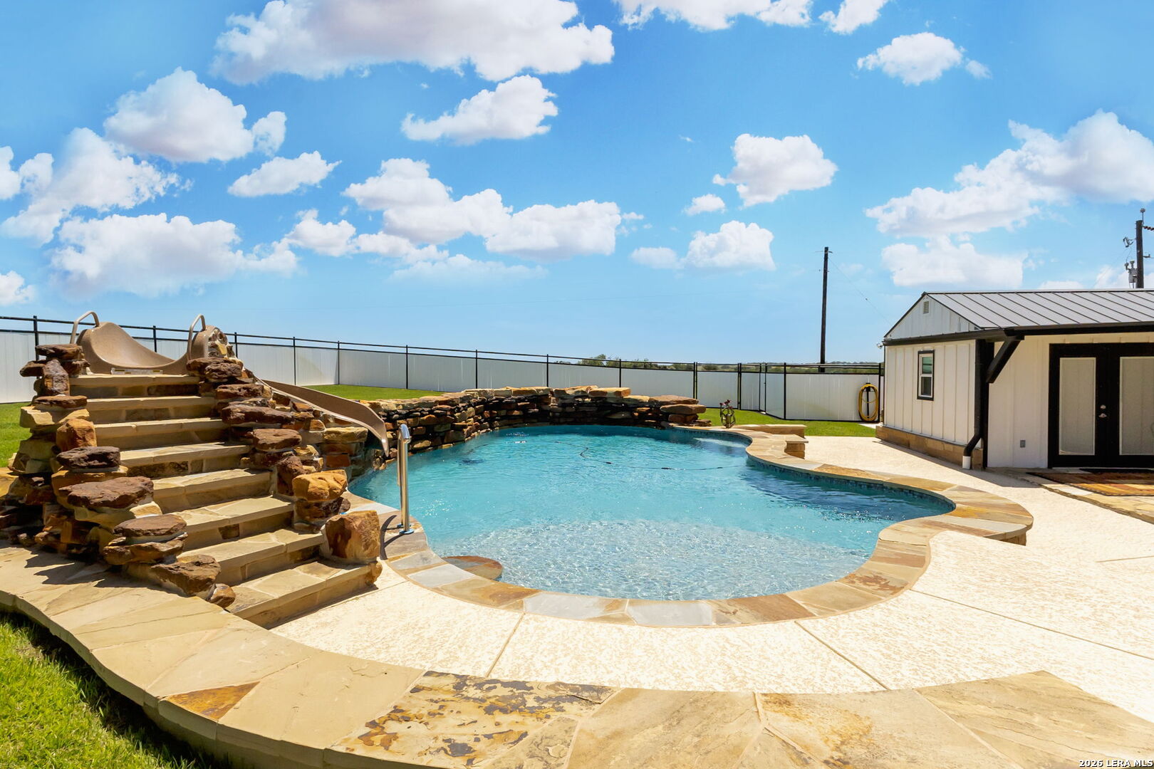 Turnkey 3-bedroom, 3-bath horse property just minutes from Seguin-fully set up, clean, and ready to use-this is truly a showplace. Behind a gated entrance, this 23.28-acre tract is built for function first, featuring a horse barn with stalls, disced riding area, turnout trap, Priefert 4-horse walker, and a complete working setup that's ready from day one. The land is improved coastal pasture with mature pecan trees and a layout that actually works for horses and livestock. A full working metal shop with storage, water well, and additional meter onsite provides the infrastructure buyers are looking for. The home offers an expanded living room with vaulted ceilings, reconfigured pantry and utility space, updated finishes, and a spacious primary suite with a large closet-creating an open, comfortable feel without overcomplicating it. Out back, the property shifts into full lifestyle mode with a recently added backyard, pool, irrigation, fencing, and outdoor living space designed to unwind and entertain. Under 10 minutes to Seguin-clean land, solid setup, and ready to use and enjoy.