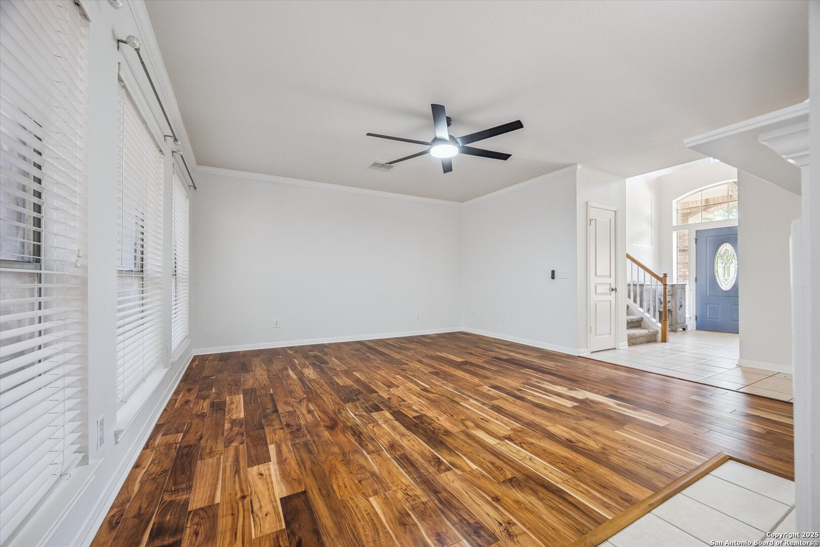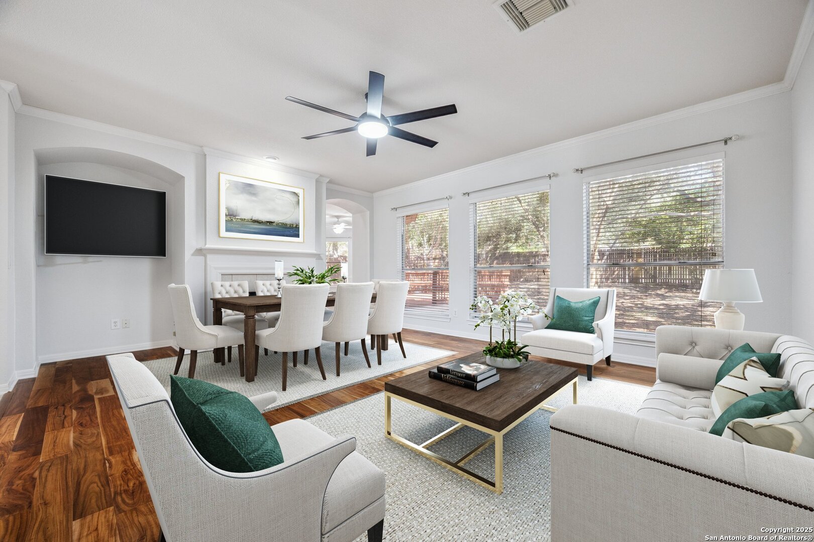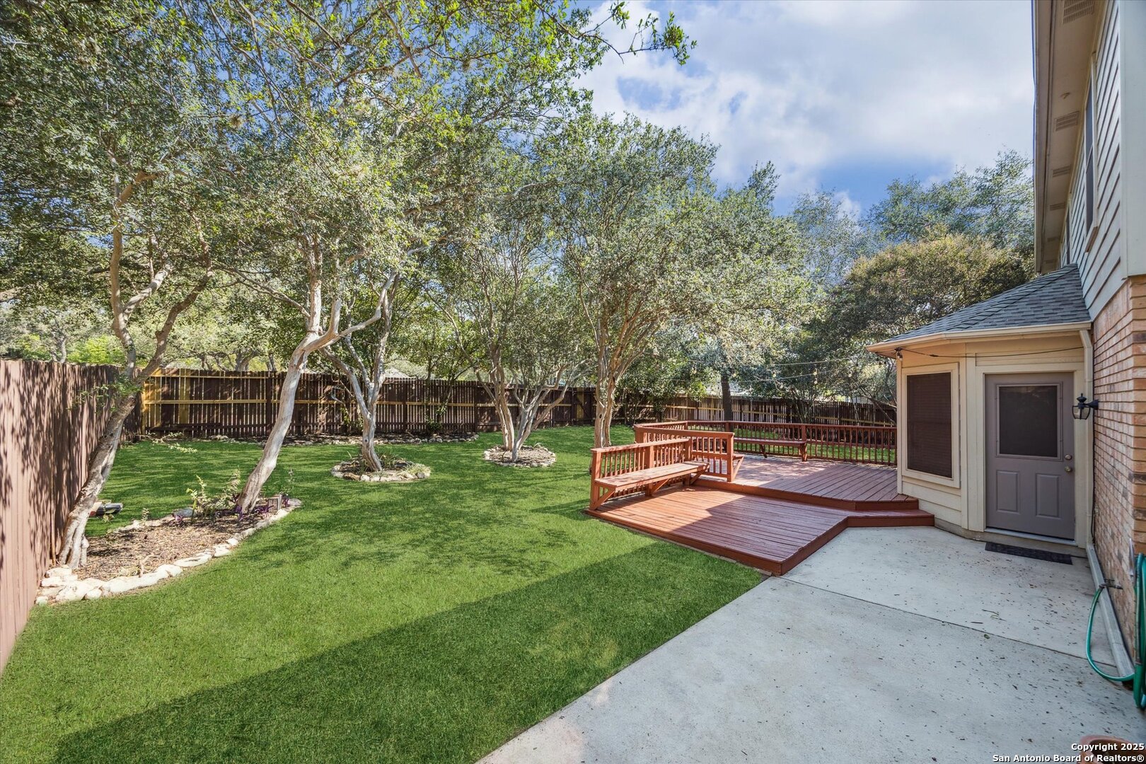 Smashing! Jewel Box of a home located in a charming and oh so convenient right off Schertz Parkway in between 1-10, 78, and I-35. Everything you could want, or need is minutes away! This great neighborhood is surrounded by parks and jogging trails. A beautiful park for the children to play or Fido to walk in is right behind! Pride of ownership and a huge sense of style is quite evident as soon as you drive up! A great floorplan awaits! Large 2-story entry, gorgeous hardwoods both in the living and formal dining. Pinterest worthy crown molding, wainscotting, and picture frame trim molding Turn the corner and visit a family room, kitchen and breakfast area you have never seen before! All open to each other with a two-sided fireplace into the family room. Each room views the great deck and heavily wooded back yard. The master is big spacious and light. The primary bath is everything you would expect. Big vanities, mirrors, garden tub, separate shower, walk in closet, separate water closet. The study could double as a fourth bedroom or upstairs den. It has great windows and prime for zoom meetings! The secondary bedrooms are large and have great closets. This home is turnkey and looks and feels like new! Tucked on a small hill, framed by old growth trees, all on a quiet cul-de-sac. Perfect home for someone who commutes to work and wants to rest and relax on weekends! San Antonio is 10 minutes away as is the Air Force Base.