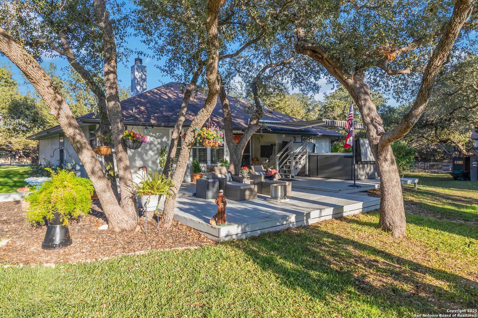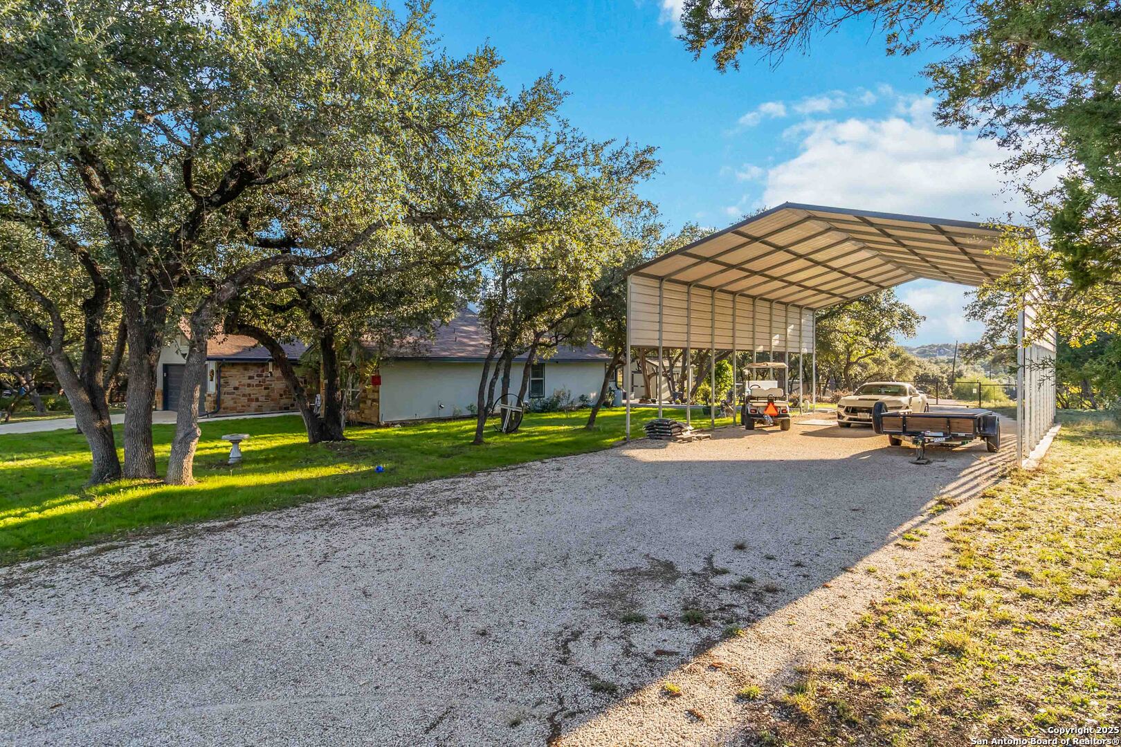 Welcome to a well-kept 3 bedroom, 2 bath home set on a rare triple lot in Canyon Lake. The property runs street to street from Grandview to Fairway and is fully fenced with two electric gates, each with remote access. The pull-through covered parking makes day-to-day living simple, with ample space for a pontoon boat, trailer, or an RV and includes a 50 amp plug. Inside, the home feels warm and inviting with an open floor plan, arches, rounded corners and quality craftsmanship, ceiling fans throughout, and plantation shutters. The kitchen offers generous cabinet storage, tilt-out windows, a water softener, a deionized water faucet and all new windows along the south side of the home. The backyard is a true retreat with mature shade trees, two storage buildings, wide open space and a swim spa for year-round relaxation on the covered patio. Located near Boat Ramp 5 and close to groceries, dining and Hill Country recreation, this property delivers space, privacy and a well-designed layout inside and out. A standout find in a quiet pocket of Canyon Lake.