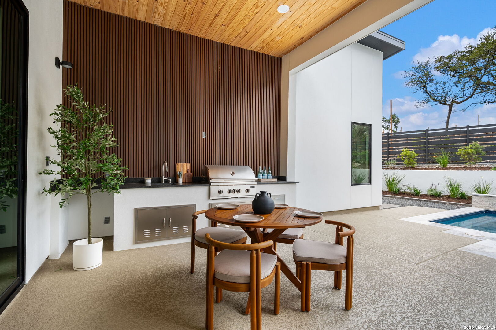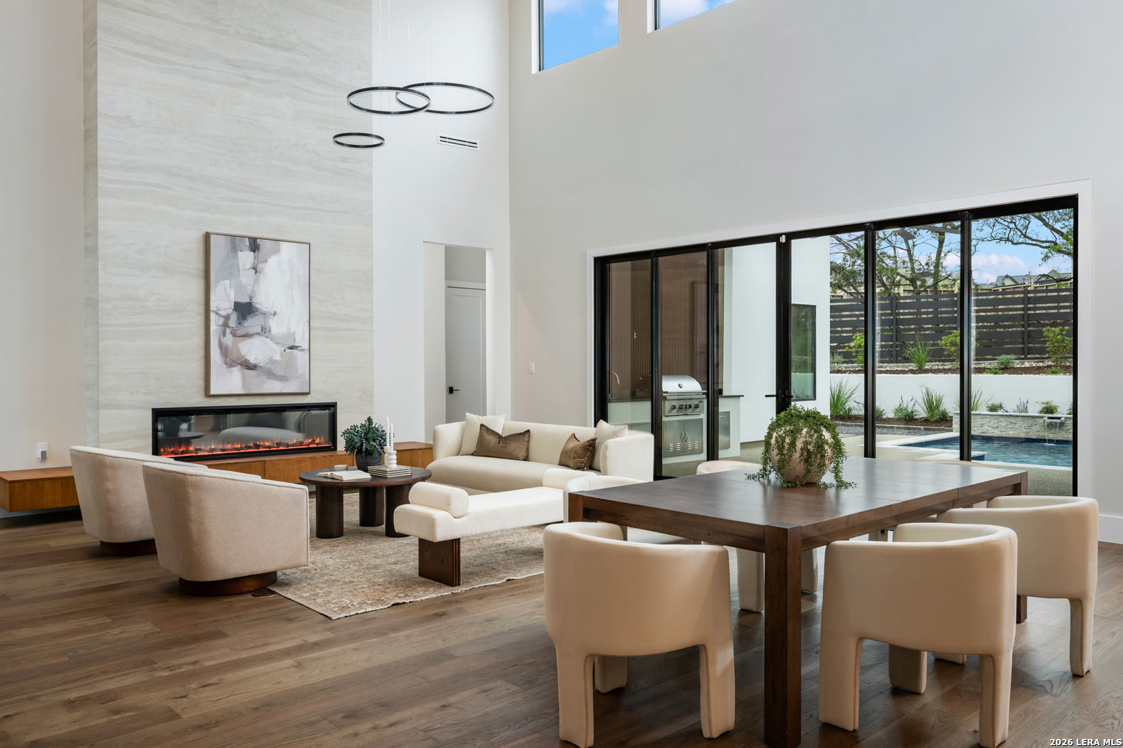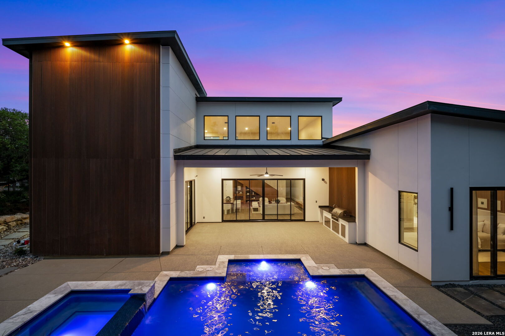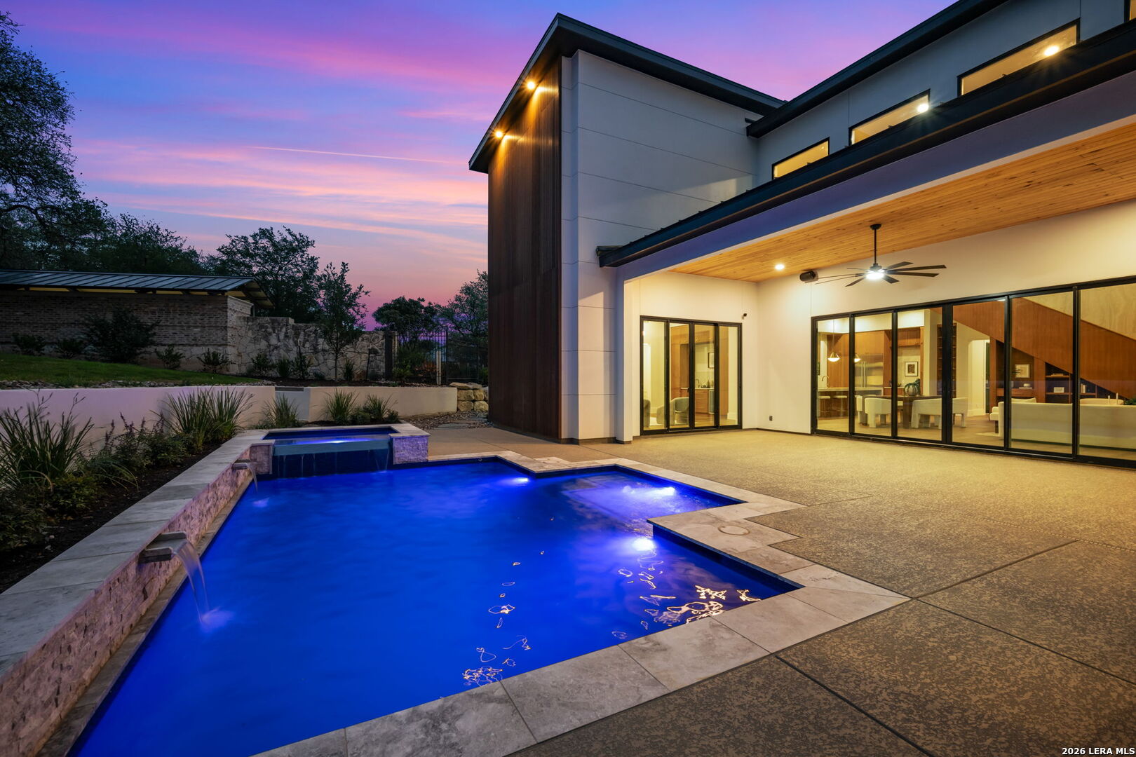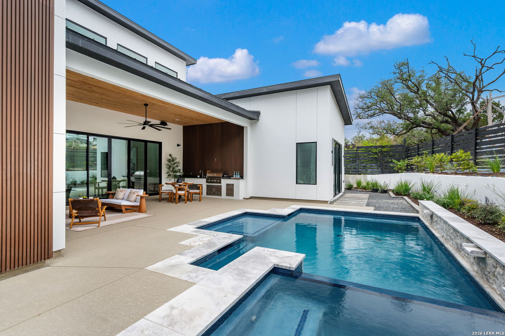 Positioned on the iconic Cliff Line street within The Dominion, this architectural masterpiece is a commanding expression of modern luxury-surrounded by San Antonio's most prestigious $3M+ estates and designed to captivate at every turn. The home makes an unforgettable first impression with a striking 12-foot metal-and-glass pivot door-an introduction to the refined design and elevated craftsmanship that unfolds throughout its 5,200 square feet. Inside, a symphony of white oak and natural stone defines the interiors, from wide-plank flooring to rift-cut custom cabinetry and built-ins that create a warm yet sophisticated palette. Towering 22-foot ceilings anchor the grand living space, while expansive 20-foot sliding glass walls dissolve the boundary between indoors and out-flooding the home with natural light and framing the resort-style backyard beyond. A designer kitchen appointed with Taj Mahal quartzite, a dramatic waterfall island, and a full suite of JennAir appliances-including a 48-inch brass-accented six-burner range with griddle and double ovens, built-in refrigeration and freezer towers, dishwasher and wall oven. Every detail is curated for both elevated entertaining and everyday indulgence. Five luxurious bedrooms, each with their own ensuite bath, offer privacy and comfort, with three generously scaled suites located on the main level. The primary suite is a retreat of its own-featuring a coffered ceiling with custom lighting, bespoke white oak paneling, private outdoor access, and custom built-ins. The spa-inspired bath is equally captivating, complete with quartzite vanities, a floating soaking tub, two private water closets, and an expansive walk-in shower with dual rain heads wrapped in floor-to-ceiling tile. Designed for both relaxation and entertaining, the home offers multiple living spaces-including a secondary downstairs lounge with a wet bar and half bath, an upstairs retreat, and seamless indoor-outdoor flow to a covered patio with a full outdoor kitchen. Beyond, a heated pool and spa with water features create a private resort experience, all set within a lush, usable yard ideal for both play and leisure. Additional highlights include surround sound throughout, a three-car side-entry garage with modern glass doors, and a sleek metal roof paired with a timeless stucco exterior-delivering both durability and design excellence. Located within the guarded gates of The Dominion-one of San Antonio's most sought-after golf course communities-residents enjoy access to a world-class country club, championship golf, and an unmatched lifestyle of privacy, prestige, and convenience. This is more than a home-it's a statement.