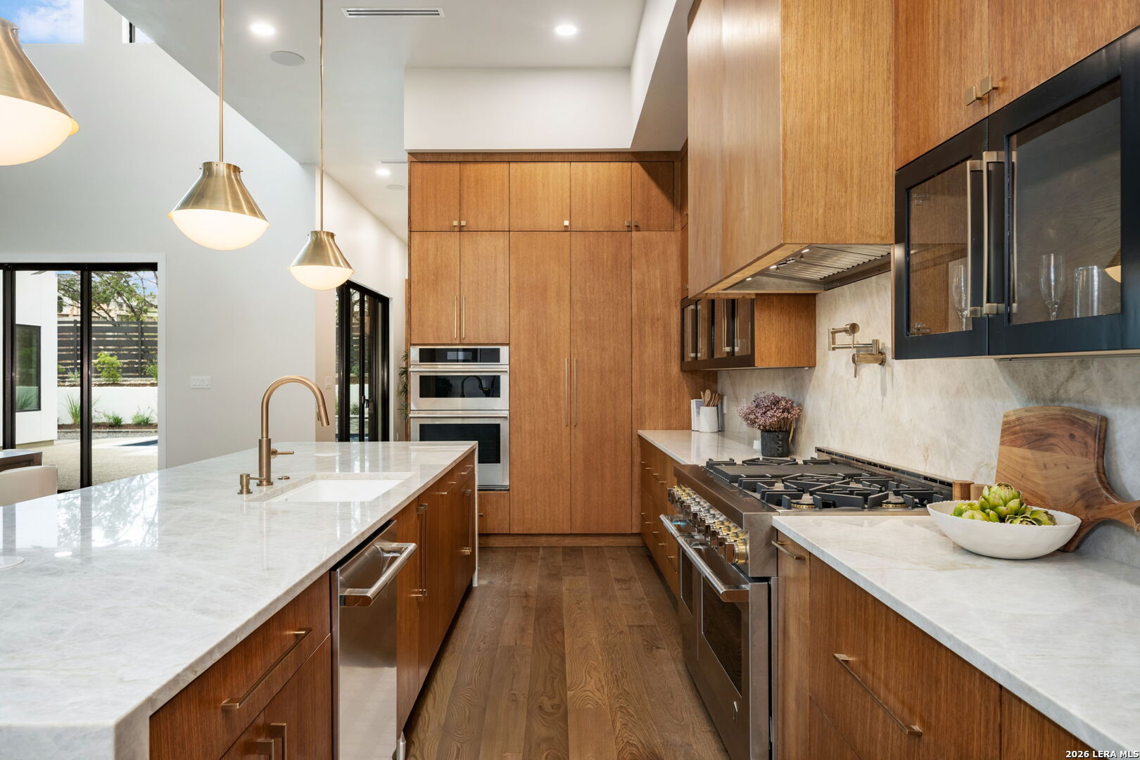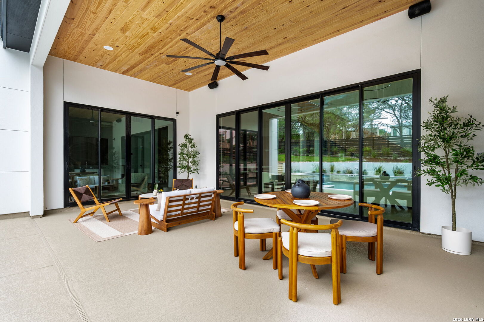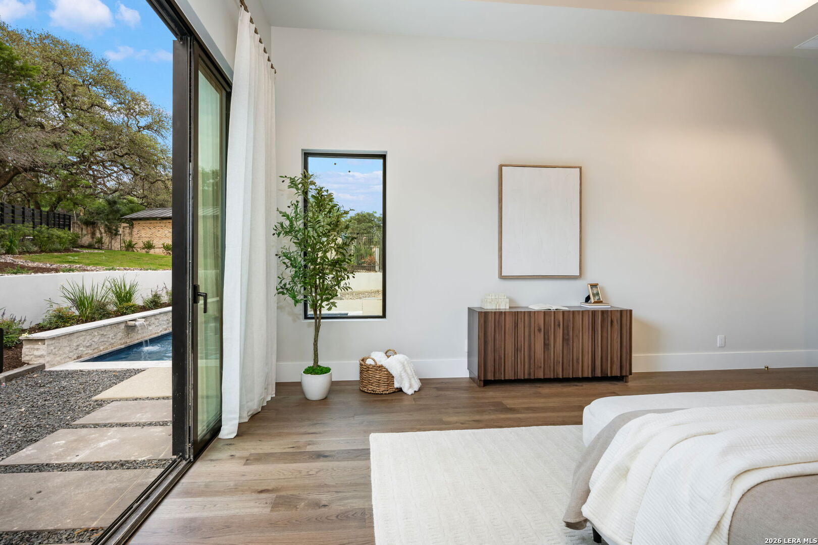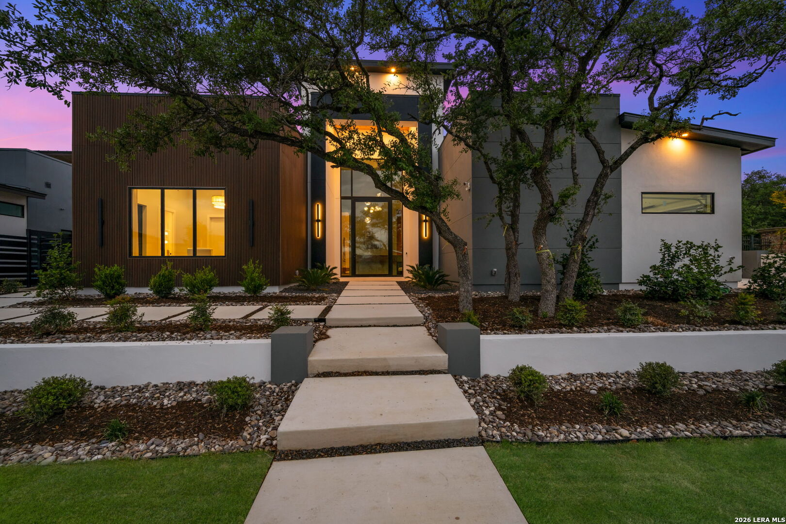 Positioned on the iconic Cliff Line street within The Dominion, this architectural masterpiece is a commanding expression of modern luxury-surrounded by San Antonio's most prestigious $3M+ estates and designed to captivate at every turn. The home makes an unforgettable first impression with a striking 12-foot metal-and-glass pivot door-an introduction to the refined design and elevated craftsmanship that unfolds throughout its 5,200 square feet. Inside, a symphony of white oak and natural stone defines the interiors, from wide-plank flooring to rift-cut custom cabinetry and built-ins that create a warm yet sophisticated palette. Towering 22-foot ceilings anchor the grand living space, while expansive 20-foot sliding glass walls dissolve the boundary between indoors and out-flooding the home with natural light and framing the resort-style backyard beyond. A designer kitchen appointed with Taj Mahal quartzite, a dramatic waterfall island, and a full suite of JennAir appliances-including a 48-inch brass-accented six-burner range with griddle and double ovens, built-in refrigeration and freezer towers, dishwasher and wall oven. Every detail is curated for both elevated entertaining and everyday indulgence. Five luxurious bedrooms, each with their own ensuite bath, offer privacy and comfort, with three generously scaled suites located on the main level. The primary suite is a retreat of its own-featuring a coffered ceiling with custom lighting, bespoke white oak paneling, private outdoor access, and custom built-ins. The spa-inspired bath is equally captivating, complete with quartzite vanities, a floating soaking tub, two private water closets, and an expansive walk-in shower with dual rain heads wrapped in floor-to-ceiling tile. Designed for both relaxation and entertaining, the home offers multiple living spaces-including a secondary downstairs lounge with a wet bar and half bath, an upstairs retreat, and seamless indoor-outdoor flow to a covered patio with a full outdoor kitchen. Beyond, a heated pool and spa with water features create a private resort experience, all set within a lush, usable yard ideal for both play and leisure. Additional highlights include surround sound throughout, a three-car side-entry garage with modern glass doors, and a sleek metal roof paired with a timeless stucco exterior-delivering both durability and design excellence. Located within the guarded gates of The Dominion-one of San Antonio's most sought-after golf course communities-residents enjoy access to a world-class country club, championship golf, and an unmatched lifestyle of privacy, prestige, and convenience. This is more than a home-it's a statement.
