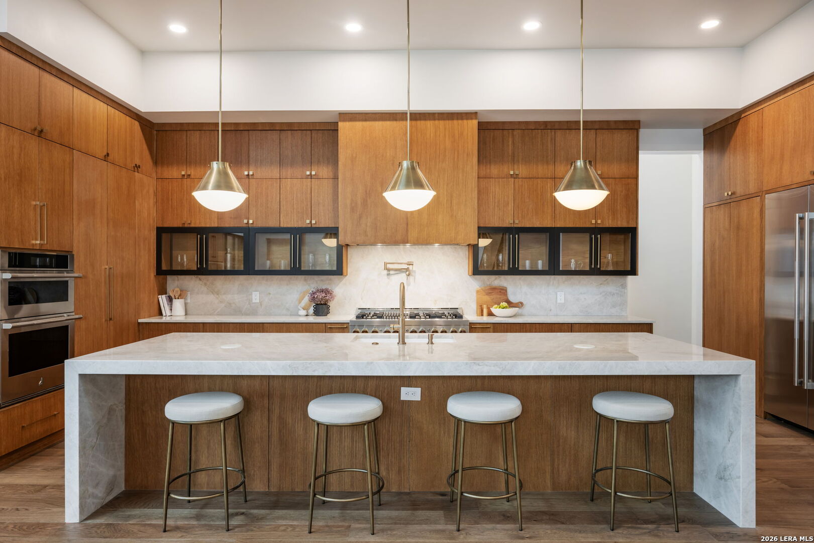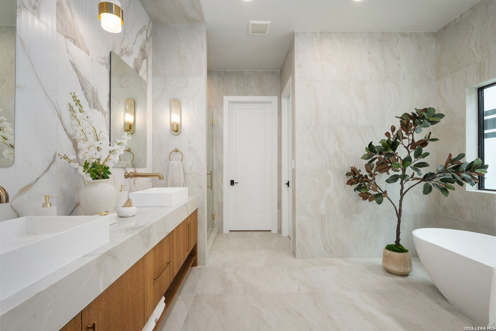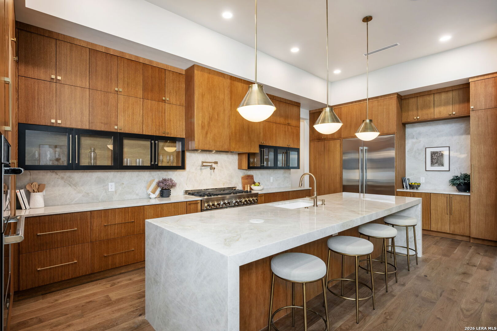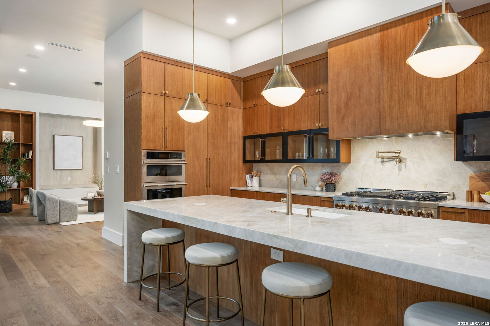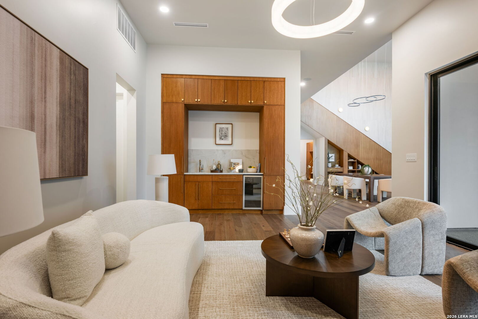 Positioned on the iconic Cliff Line street within The Dominion, this architectural masterpiece is a commanding expression of modern luxury-surrounded by San Antonio's most prestigious $3M+ estates and designed to captivate at every turn. The home makes an unforgettable first impression with a striking 12-foot metal-and-glass pivot door-an introduction to the refined design and elevated craftsmanship that unfolds throughout its 5,200 square feet. Inside, a symphony of white oak and natural stone defines the interiors, from wide-plank flooring to rift-cut custom cabinetry and built-ins that create a warm yet sophisticated palette. Towering 22-foot ceilings anchor the grand living space, while expansive 20-foot sliding glass walls dissolve the boundary between indoors and out-flooding the home with natural light and framing the resort-style backyard beyond. A designer kitchen appointed with Taj Mahal quartzite, a dramatic waterfall island, and a full suite of JennAir appliances-including a 48-inch brass-accented six-burner range with griddle and double ovens, built-in refrigeration and freezer towers, dishwasher and wall oven. Every detail is curated for both elevated entertaining and everyday indulgence. Five luxurious bedrooms, each with their own ensuite bath, offer privacy and comfort, with three generously scaled suites located on the main level. The primary suite is a retreat of its own-featuring a coffered ceiling with custom lighting, bespoke white oak paneling, private outdoor access, and custom built-ins. The spa-inspired bath is equally captivating, complete with quartzite vanities, a floating soaking tub, two private water closets, and an expansive walk-in shower with dual rain heads wrapped in floor-to-ceiling tile. Designed for both relaxation and entertaining, the home offers multiple living spaces-including a secondary downstairs lounge with a wet bar and half bath, an upstairs retreat, and seamless indoor-outdoor flow to a covered patio with a full outdoor kitchen. Beyond, a heated pool and spa with water features create a private resort experience, all set within a lush, usable yard ideal for both play and leisure. Additional highlights include surround sound throughout, a three-car side-entry garage with modern glass doors, and a sleek metal roof paired with a timeless stucco exterior-delivering both durability and design excellence. Located within the guarded gates of The Dominion-one of San Antonio's most sought-after golf course communities-residents enjoy access to a world-class country club, championship golf, and an unmatched lifestyle of privacy, prestige, and convenience. This is more than a home-it's a statement.