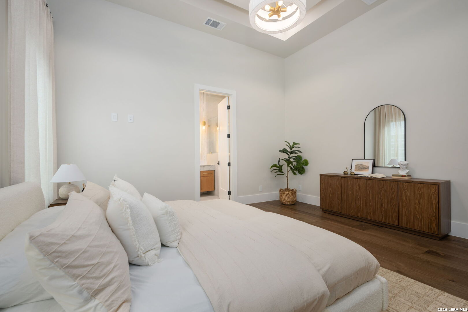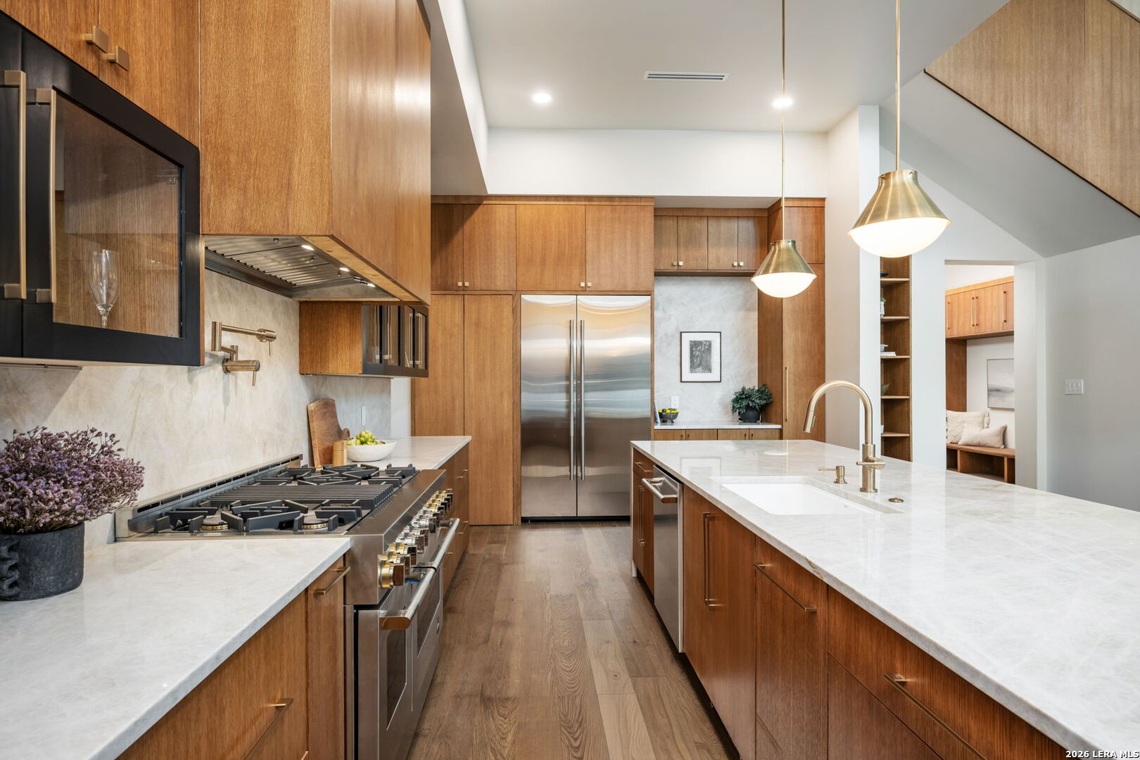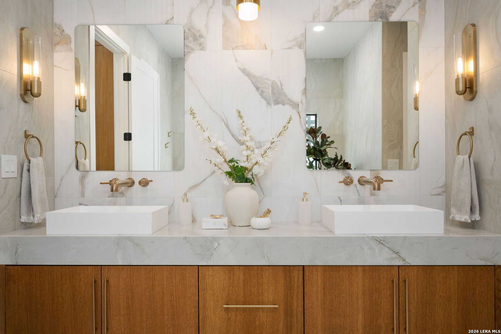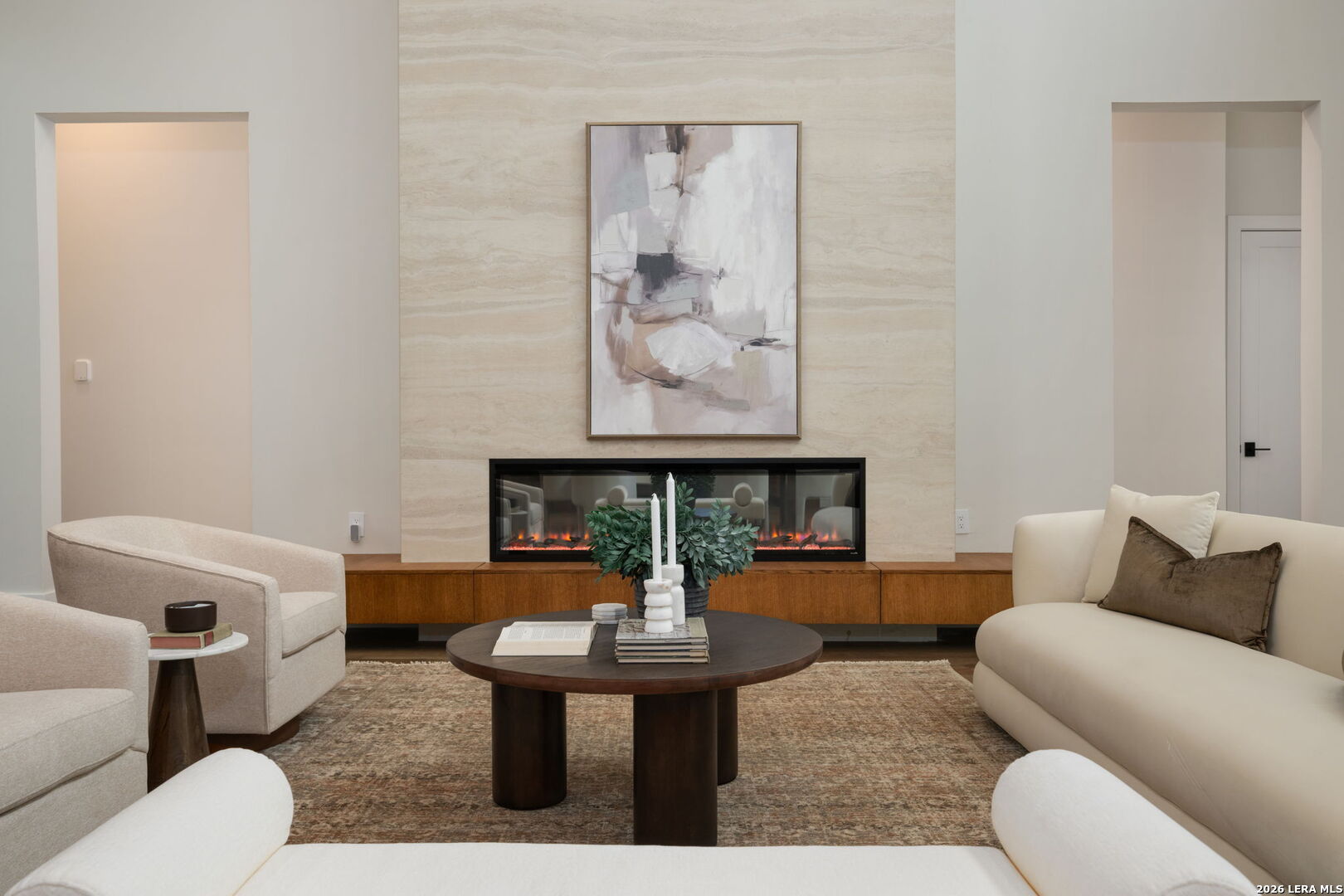 Positioned on the iconic Cliff Line street within The Dominion, this architectural masterpiece is a commanding expression of modern luxury-surrounded by San Antonio's most prestigious $3M+ estates and designed to captivate at every turn. The home makes an unforgettable first impression with a striking 12-foot metal-and-glass pivot door-an introduction to the refined design and elevated craftsmanship that unfolds throughout its 5,200 square feet. Inside, a symphony of white oak and natural stone defines the interiors, from wide-plank flooring to rift-cut custom cabinetry and built-ins that create a warm yet sophisticated palette. Towering 22-foot ceilings anchor the grand living space, while expansive 20-foot sliding glass walls dissolve the boundary between indoors and out-flooding the home with natural light and framing the resort-style backyard beyond. A designer kitchen appointed with Taj Mahal quartzite, a dramatic waterfall island, and a full suite of JennAir appliances-including a 48-inch brass-accented six-burner range with griddle and double ovens, built-in refrigeration and freezer towers, dishwasher and wall oven. Every detail is curated for both elevated entertaining and everyday indulgence. Five luxurious bedrooms, each with their own ensuite bath, offer privacy and comfort, with three generously scaled suites located on the main level. The primary suite is a retreat of its own-featuring a coffered ceiling with custom lighting, bespoke white oak paneling, private outdoor access, and custom built-ins. The spa-inspired bath is equally captivating, complete with quartzite vanities, a floating soaking tub, two private water closets, and an expansive walk-in shower with dual rain heads wrapped in floor-to-ceiling tile. Designed for both relaxation and entertaining, the home offers multiple living spaces-including a secondary downstairs lounge with a wet bar and half bath, an upstairs retreat, and seamless indoor-outdoor flow to a covered patio with a full outdoor kitchen. Beyond, a heated pool and spa with water features create a private resort experience, all set within a lush, usable yard ideal for both play and leisure. Additional highlights include surround sound throughout, a three-car side-entry garage with modern glass doors, and a sleek metal roof paired with a timeless stucco exterior-delivering both durability and design excellence. Located within the guarded gates of The Dominion-one of San Antonio's most sought-after golf course communities-residents enjoy access to a world-class country club, championship golf, and an unmatched lifestyle of privacy, prestige, and convenience. This is more than a home-it's a statement.