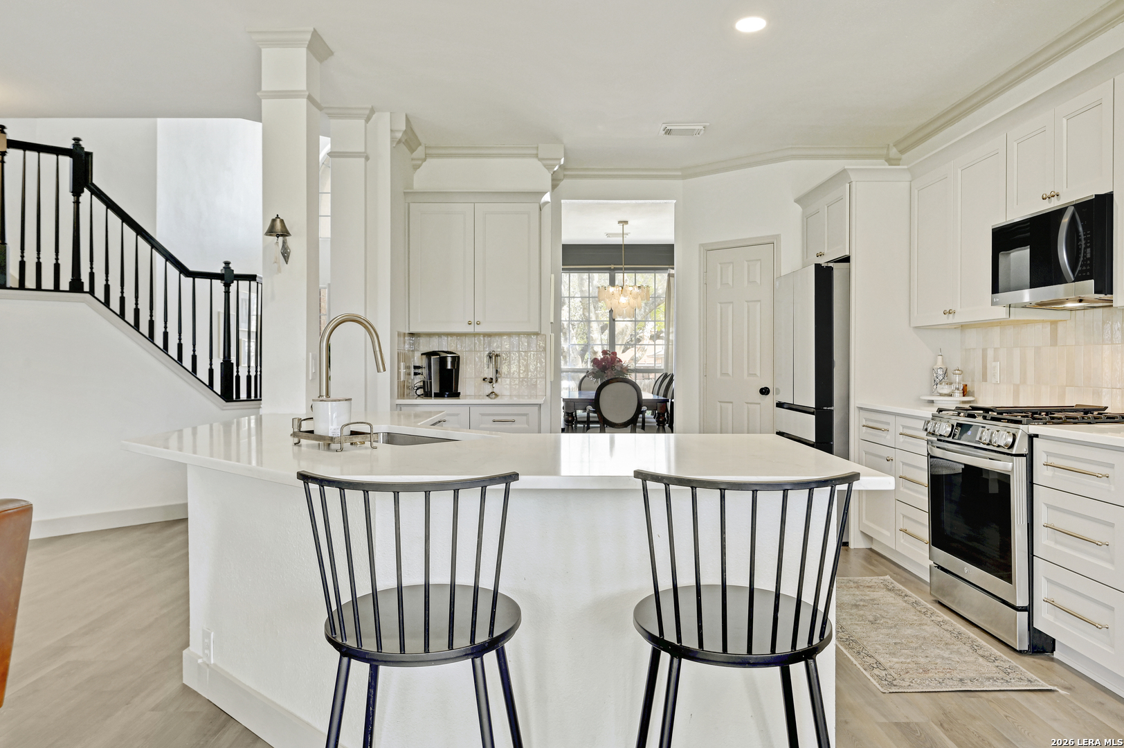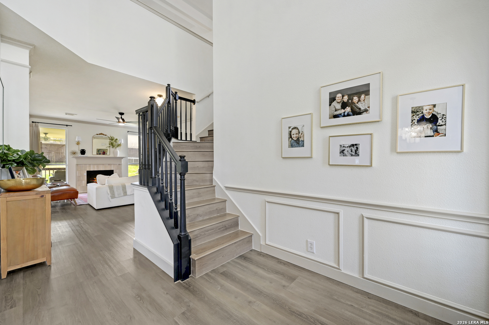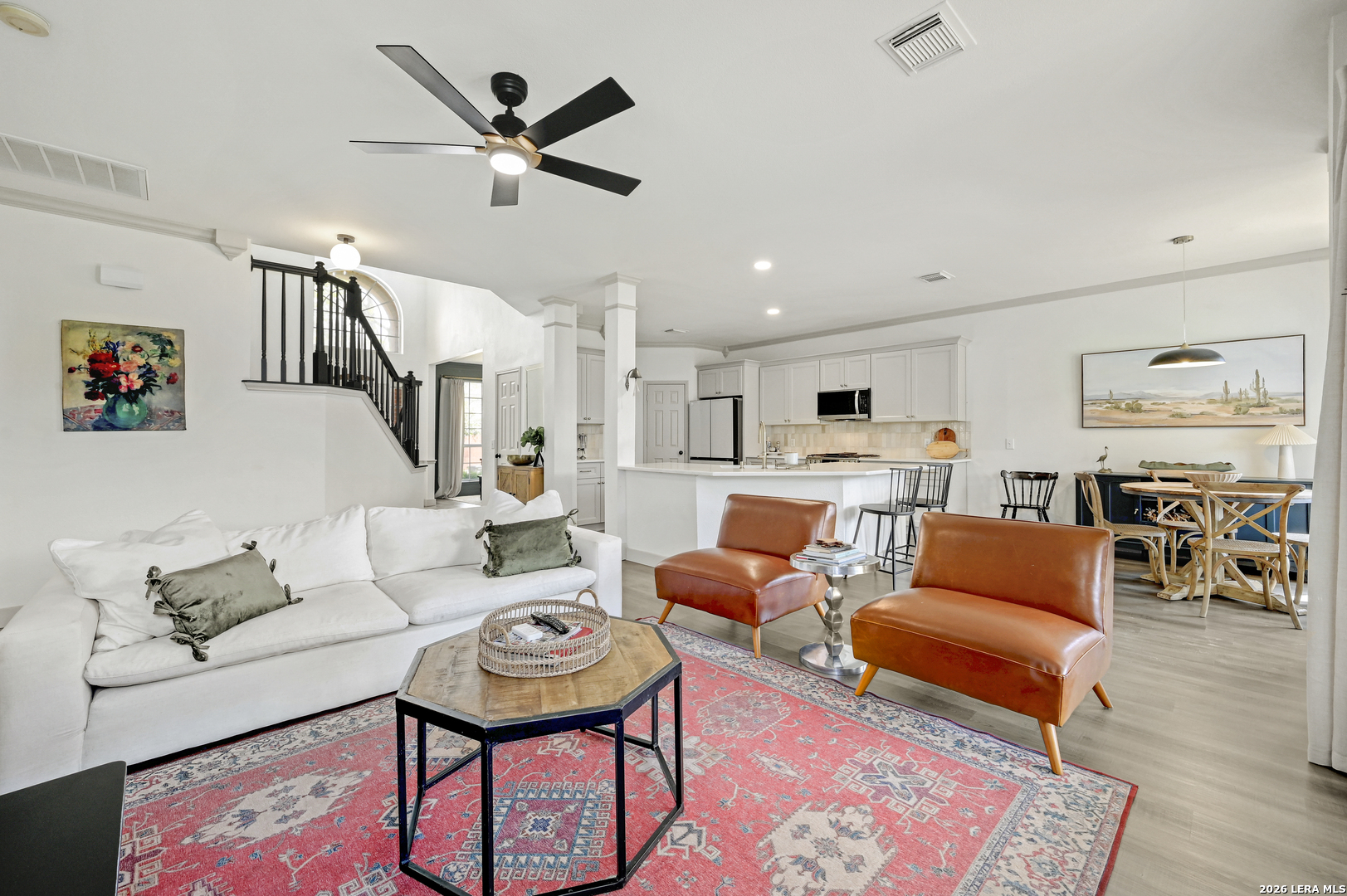 Welcome to this beautifully updated 2 story home in the highly sought-after Stone Oak area, offering 4 bedrooms, 3 bathrooms, and 3,000 SF of comfortable living space. The home is filled with stylish upgrades, including luxury vinyl flooring throughout the entire first floor and updated light fixtures in every room. The fully remodeled kitchen is a standout, featuring custom soft-close cabinetry, quartz countertops, designer backsplash, and modern hardware. The first floor offers a formal dining room, a spacious living area with a cozy retiled fireplace, and a convenient secondary bedroom with a full bath, perfect for guests or multigenerational living. Upstairs, the oversized primary suite features an updated ensuite bath and a large walk-in closet. Two additional bedrooms with walk-in closets and two versatile loft spaces provide endless possibilities for a game room, office, media area, or flex space. Step outside to enjoy the large covered patio overlooking the backyard-ideal for relaxing evenings or entertaining family and friends.