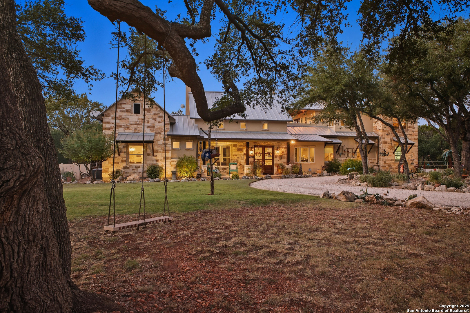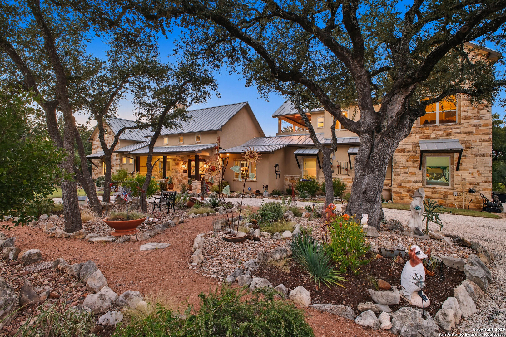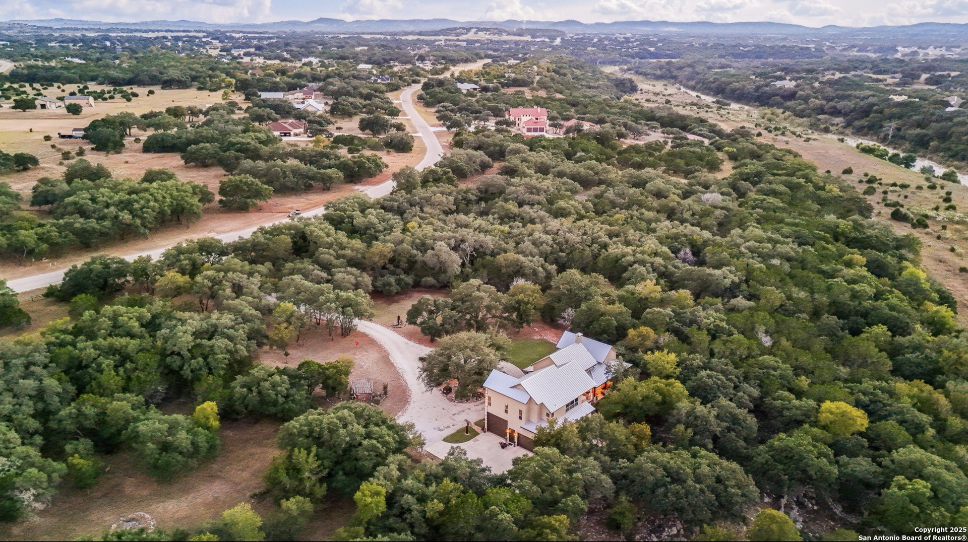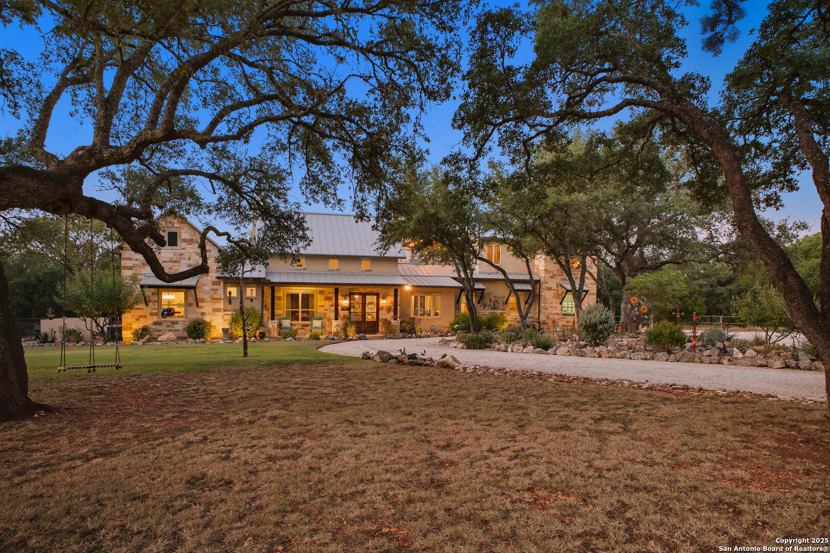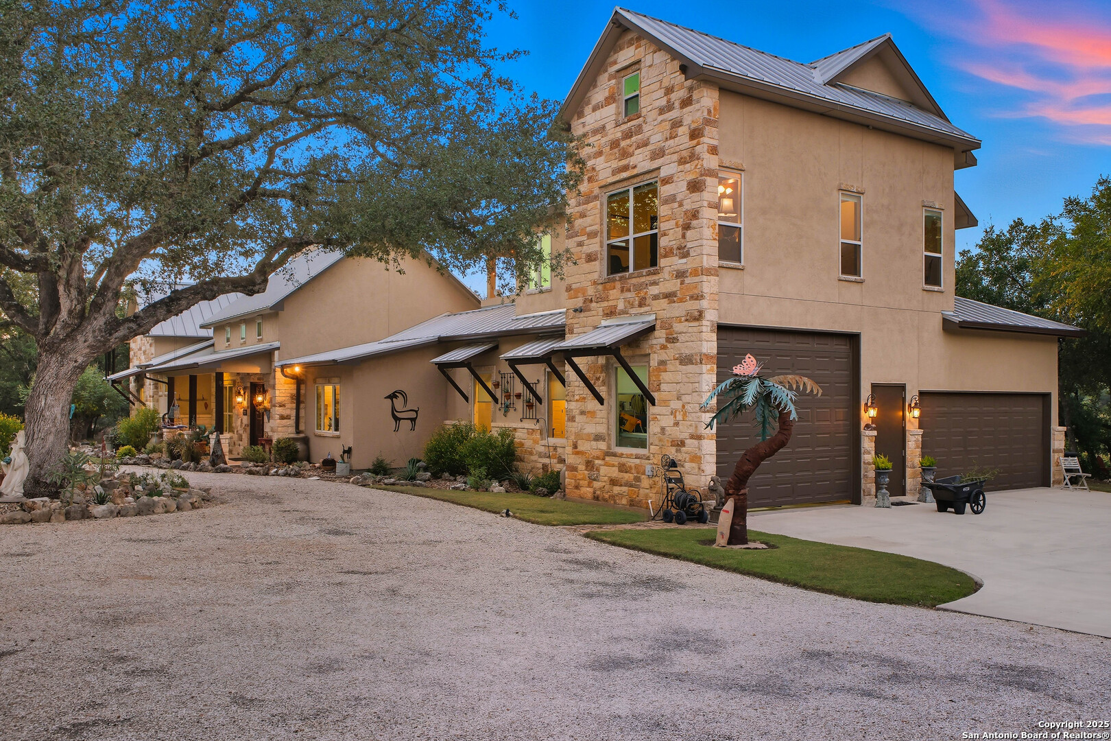 Welcome to this stunning 2,731 sq. ft. custom home on 2.83 acres, perfectly located just outside Bandera, the "Cowboy Capital of the World." This property offers the best of both worlds-peaceful Medina River frontage and breathtaking Hill Country views that stretch for miles. Set in an equestrian-friendly neighborhood, the grounds are beautifully landscaped with manicured trees, creating a private retreat where deer and wildlife frequently visit. Inside, you'll find soaring ceilings, oversized windows that capture the views, and a spacious open layout designed for modern living. The gourmet kitchen is the heart of the home, featuring a large granite island, stainless steel appliances, and abundant storage. Enjoy multiple outdoor living spaces including a front covered patios, a covered back patio, and an upstairs covered patio-all perfect for entertaining or relaxing while watching Hill Country sunsets. The floor plan is thoughtfully designed with a second living quarters upstairs, complete with its own bedroom, living area, full kitchen, and private patio-ideal for hosting guests, extended family, or in-laws. Beyond the home, the community amenities add even more value with basketball courts, a rodeo arena, swimming pools, and additional guest lodging available for visitors plus so much more. Additional highlights include a 4-car garage, abundant storage, and plenty of space for both relaxation and recreation. This one-of-a-kind property blends elegance, comfort, and Hill Country charm-don't miss your opportunity to make it yours.