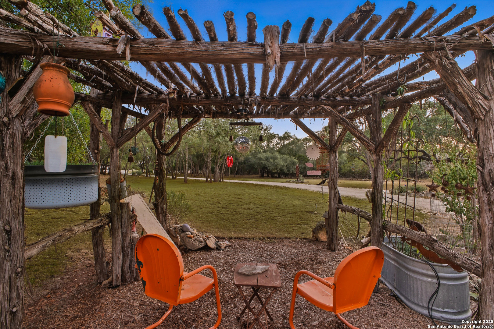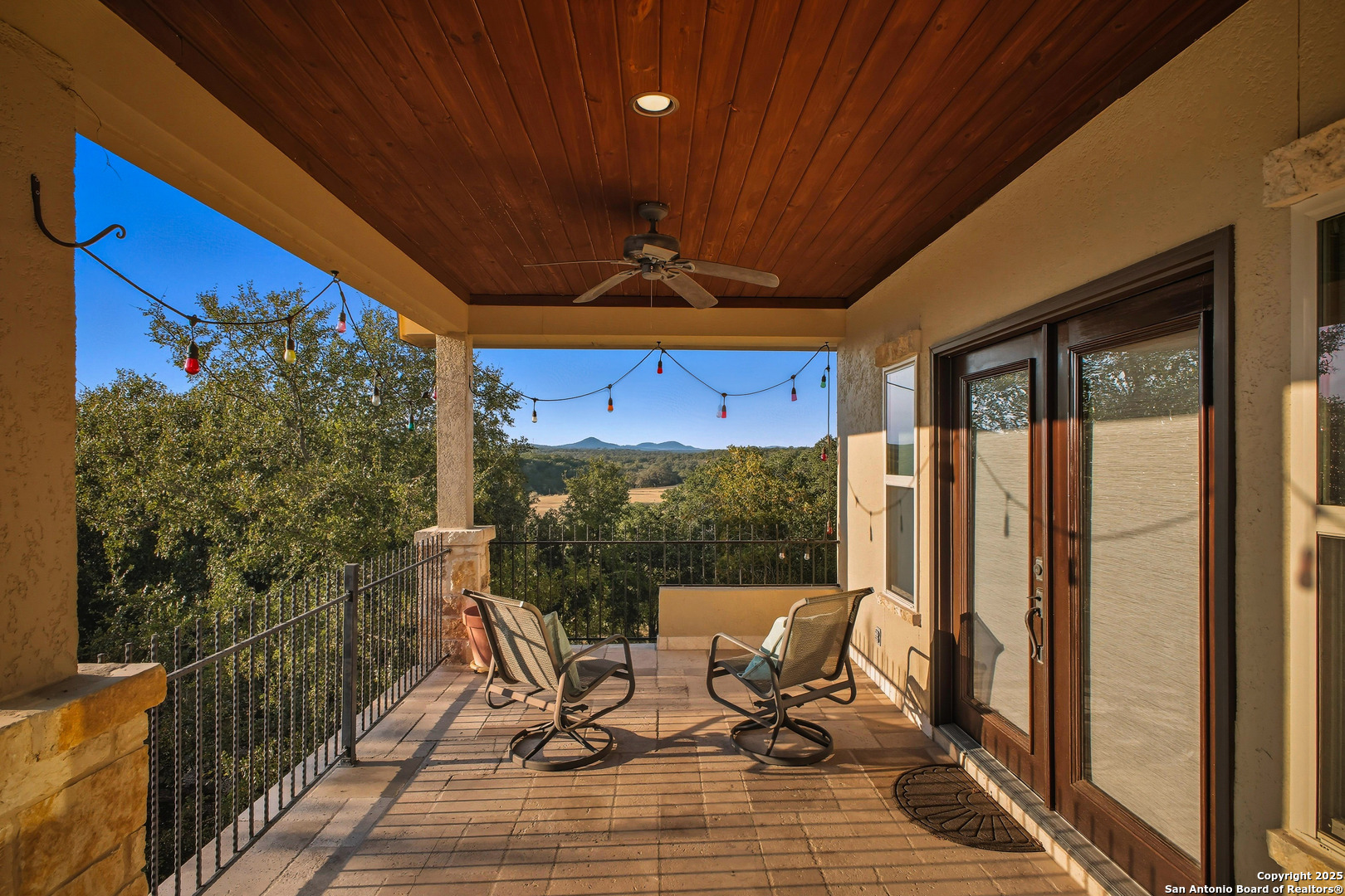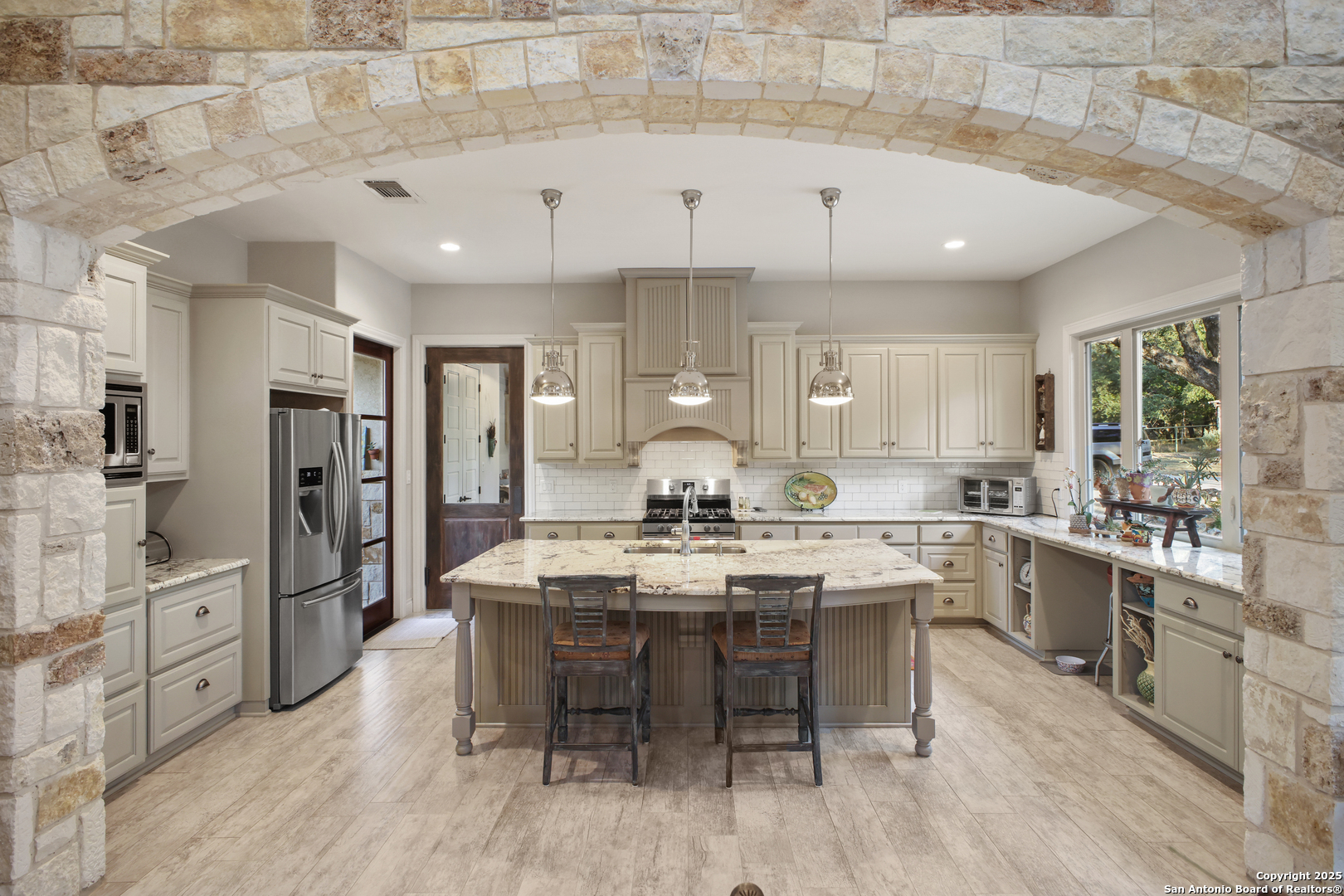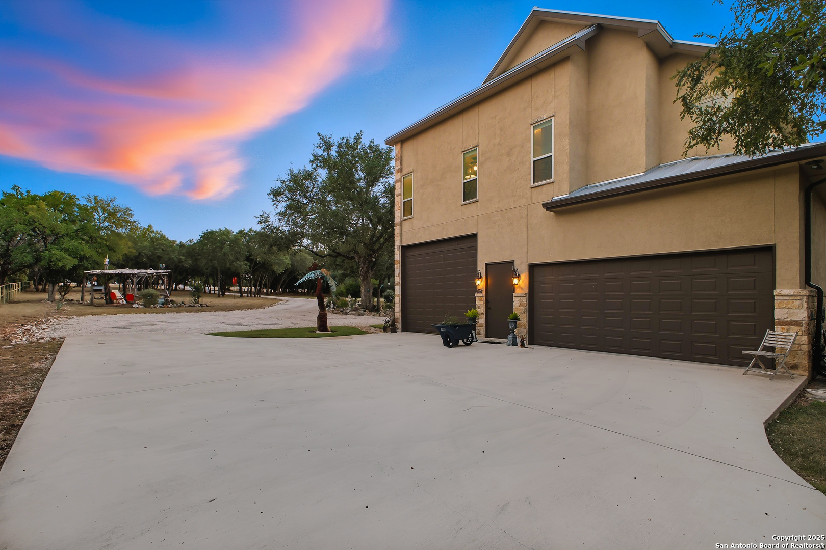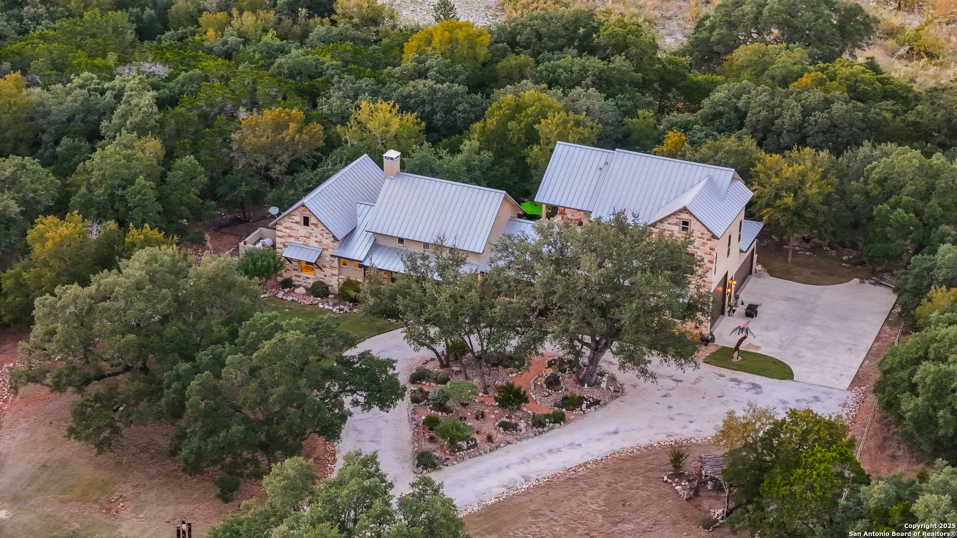 Welcome to this stunning 2,731 sq. ft. custom home on 2.83 acres, perfectly located just outside Bandera, the "Cowboy Capital of the World." This property offers the best of both worlds-peaceful Medina River frontage and breathtaking Hill Country views that stretch for miles. Set in an equestrian-friendly neighborhood, the grounds are beautifully landscaped with manicured trees, creating a private retreat where deer and wildlife frequently visit. Inside, you'll find soaring ceilings, oversized windows that capture the views, and a spacious open layout designed for modern living. The gourmet kitchen is the heart of the home, featuring a large granite island, stainless steel appliances, and abundant storage. Enjoy multiple outdoor living spaces including a front covered patios, a covered back patio, and an upstairs covered patio-all perfect for entertaining or relaxing while watching Hill Country sunsets. The floor plan is thoughtfully designed with a second living quarters upstairs, complete with its own bedroom, living area, full kitchen, and private patio-ideal for hosting guests, extended family, or in-laws. Beyond the home, the community amenities add even more value with basketball courts, a rodeo arena, swimming pools, and additional guest lodging available for visitors plus so much more. Additional highlights include a 4-car garage, abundant storage, and plenty of space for both relaxation and recreation. This one-of-a-kind property blends elegance, comfort, and Hill Country charm-don't miss your opportunity to make it yours.