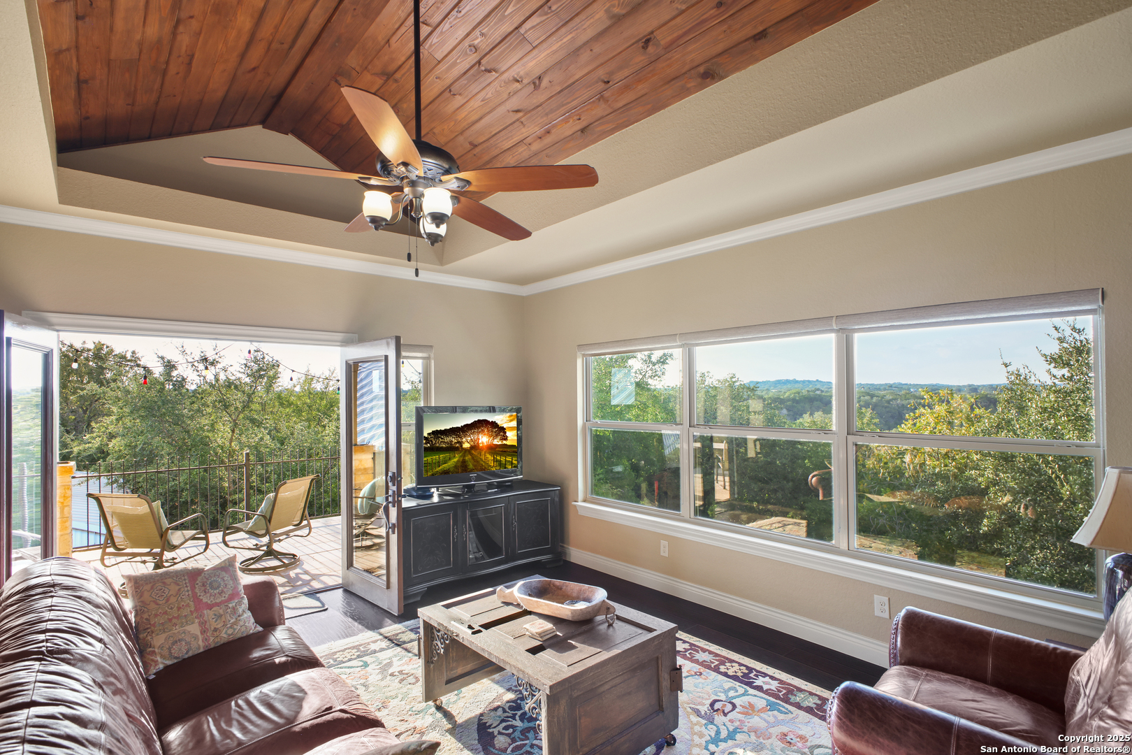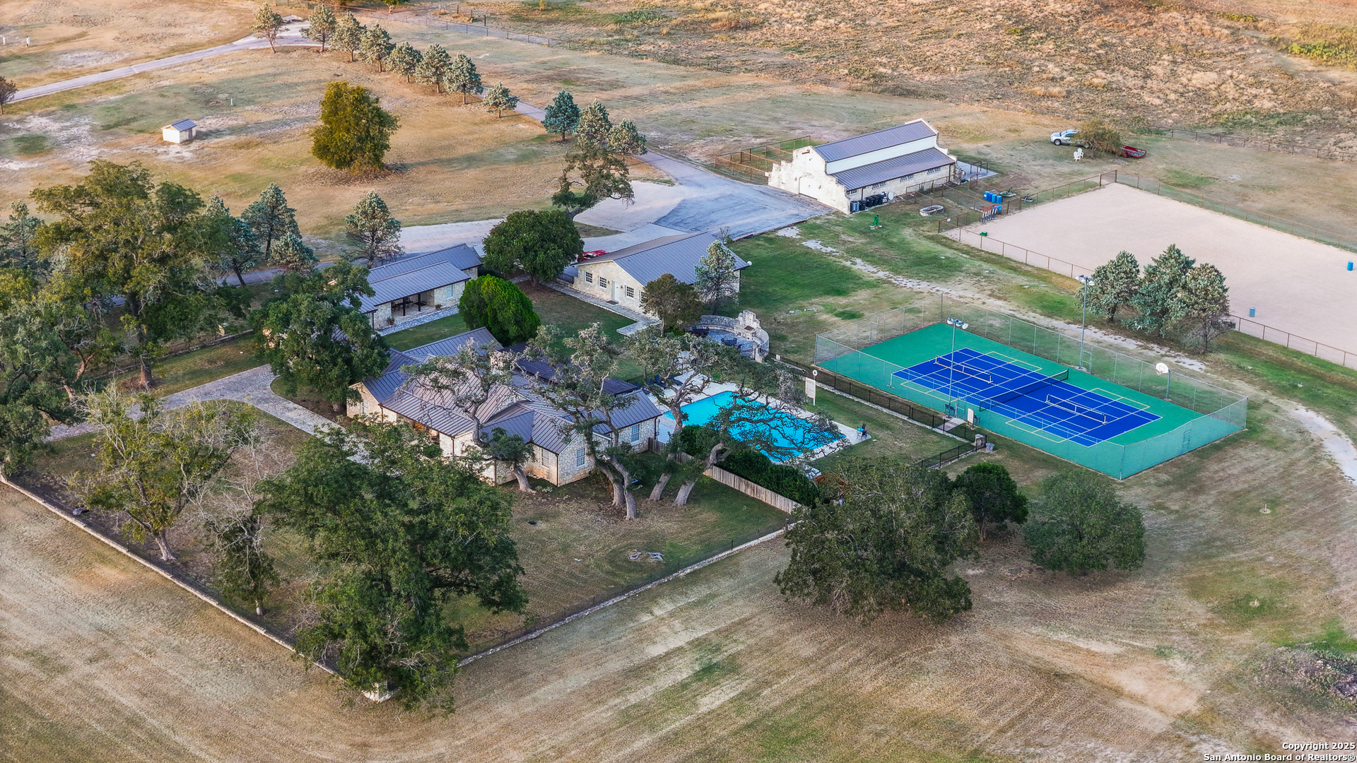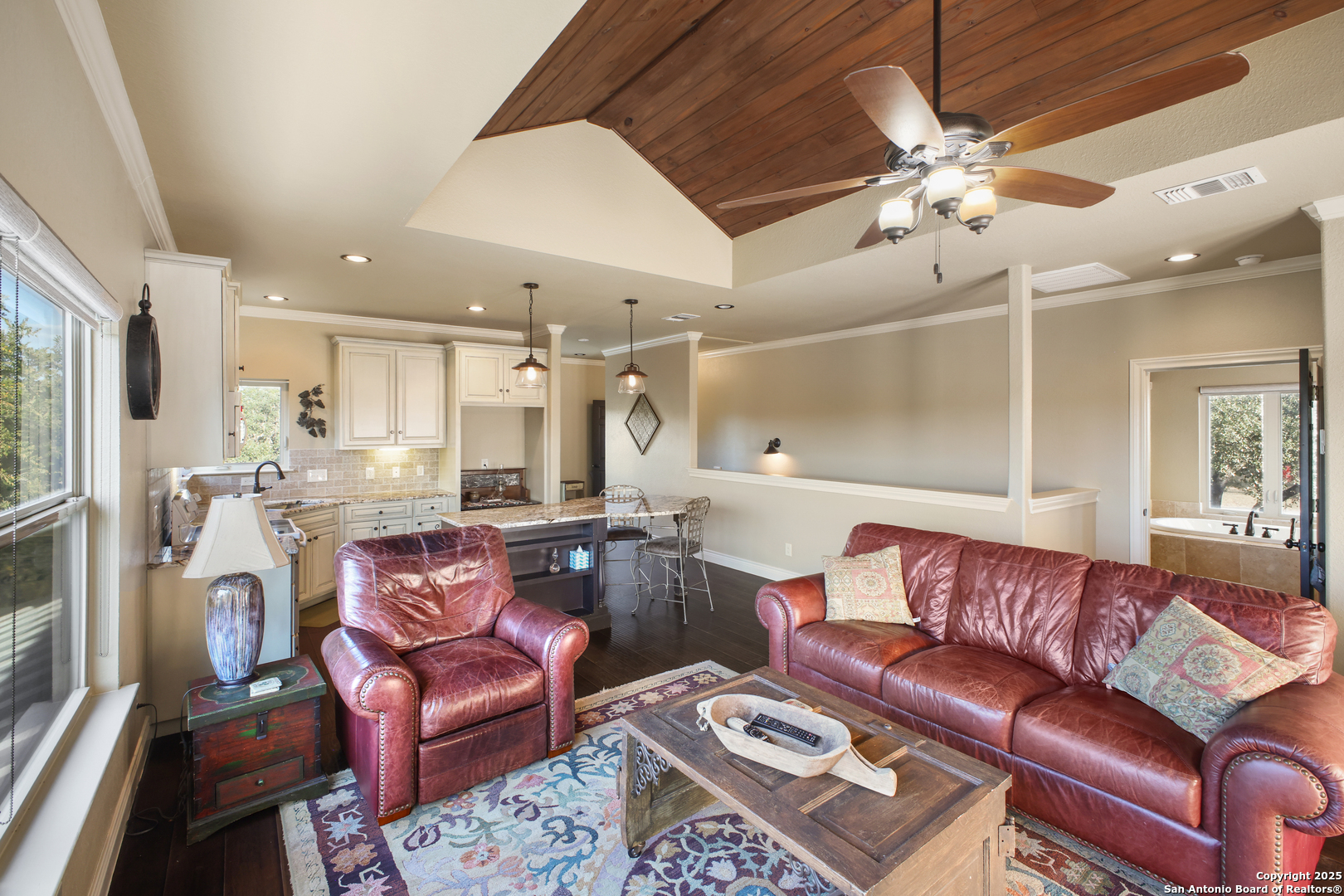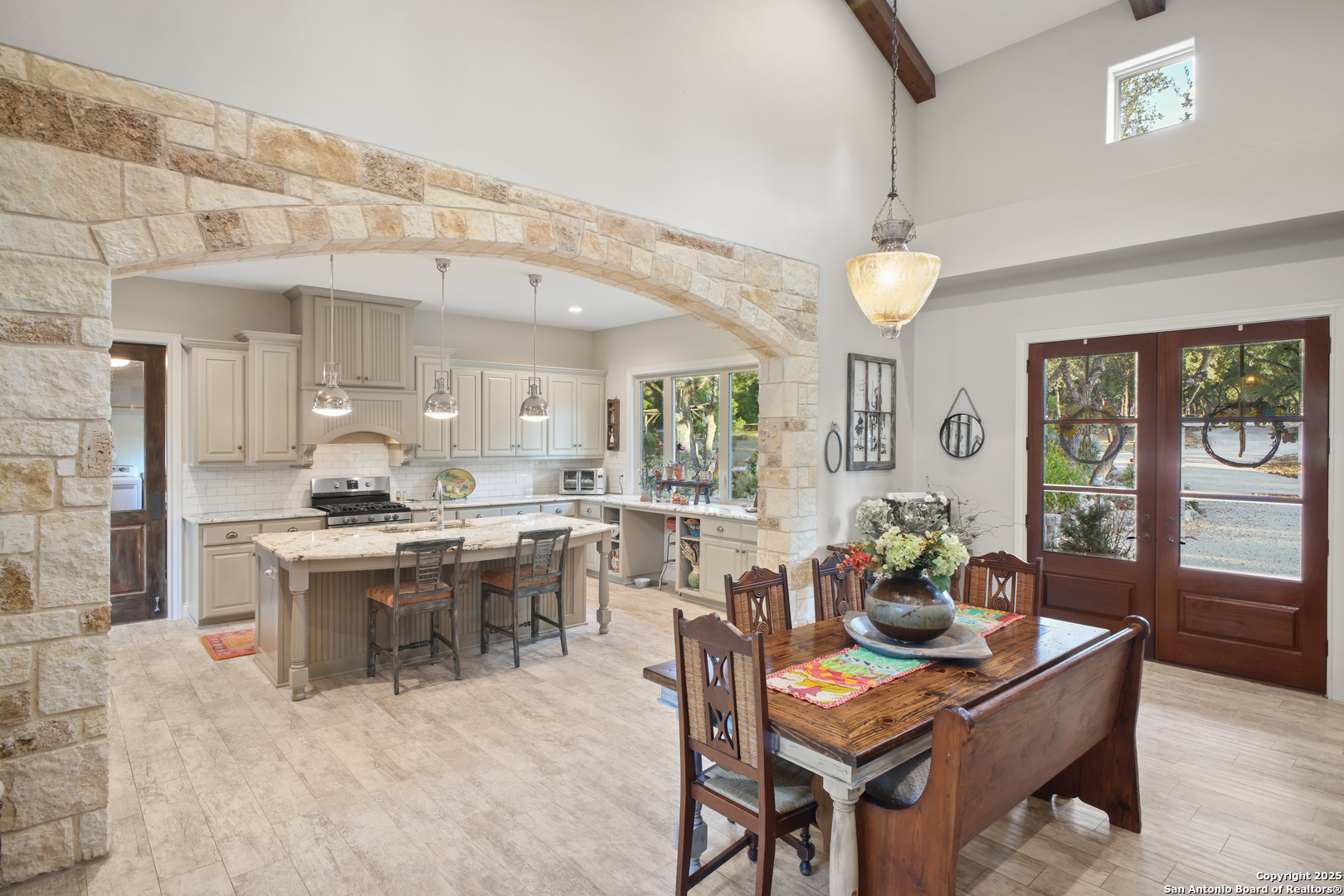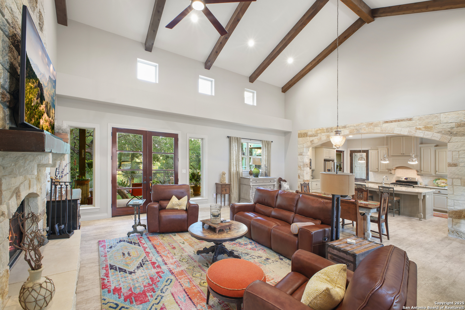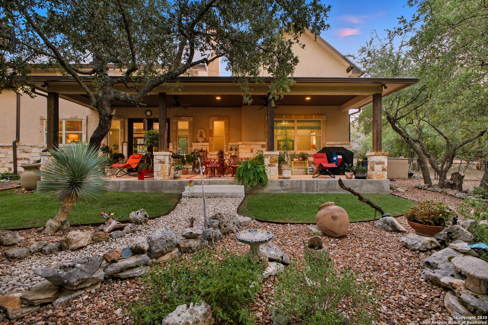 Welcome to this stunning 2,731 sq. ft. custom home on 2.83 acres, perfectly located just outside Bandera, the "Cowboy Capital of the World." This property offers the best of both worlds-peaceful Medina River frontage and breathtaking Hill Country views that stretch for miles. Set in an equestrian-friendly neighborhood, the grounds are beautifully landscaped with manicured trees, creating a private retreat where deer and wildlife frequently visit. Inside, you'll find soaring ceilings, oversized windows that capture the views, and a spacious open layout designed for modern living. The gourmet kitchen is the heart of the home, featuring a large granite island, stainless steel appliances, and abundant storage. Enjoy multiple outdoor living spaces including a front covered patios, a covered back patio, and an upstairs covered patio-all perfect for entertaining or relaxing while watching Hill Country sunsets. The floor plan is thoughtfully designed with a second living quarters upstairs, complete with its own bedroom, living area, full kitchen, and private patio-ideal for hosting guests, extended family, or in-laws. Beyond the home, the community amenities add even more value with basketball courts, a rodeo arena, swimming pools, and additional guest lodging available for visitors plus so much more. Additional highlights include a 4-car garage, abundant storage, and plenty of space for both relaxation and recreation. This one-of-a-kind property blends elegance, comfort, and Hill Country charm-don't miss your opportunity to make it yours.