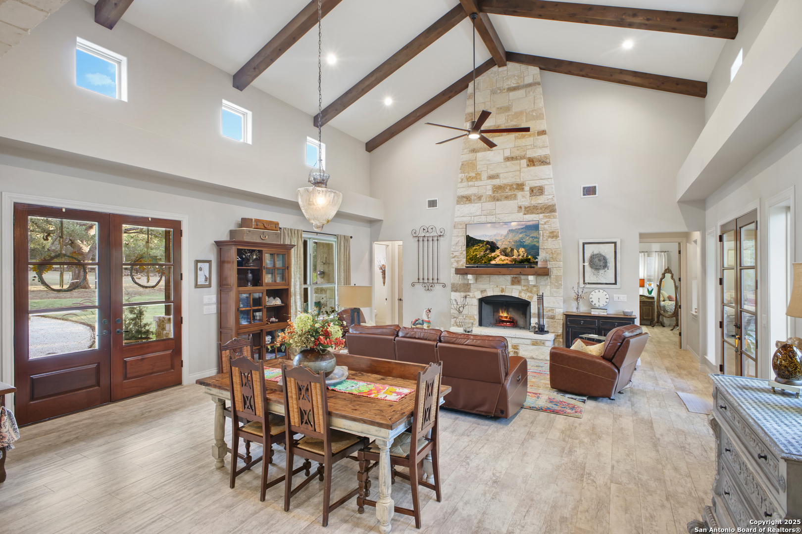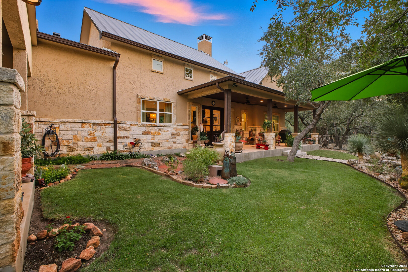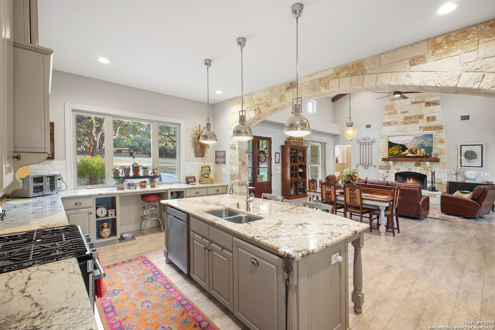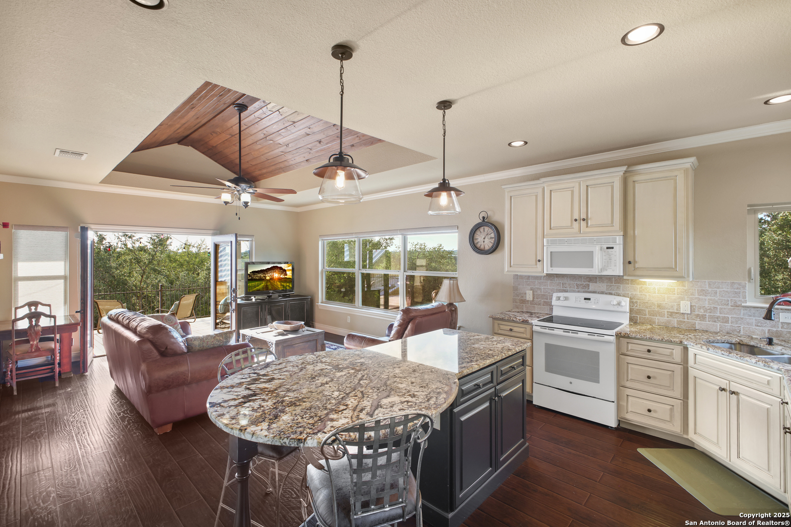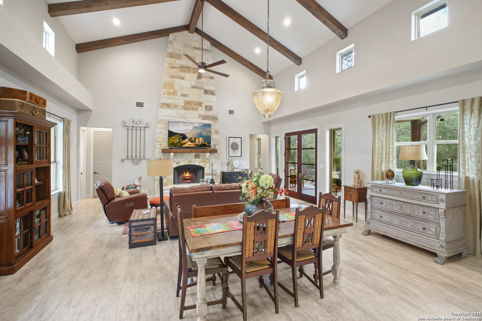 Welcome to this stunning 2,731 sq. ft. custom home on 2.83 acres, perfectly located just outside Bandera, the "Cowboy Capital of the World." This property offers the best of both worlds-peaceful Medina River frontage and breathtaking Hill Country views that stretch for miles. Set in an equestrian-friendly neighborhood, the grounds are beautifully landscaped with manicured trees, creating a private retreat where deer and wildlife frequently visit. Inside, you'll find soaring ceilings, oversized windows that capture the views, and a spacious open layout designed for modern living. The gourmet kitchen is the heart of the home, featuring a large granite island, stainless steel appliances, and abundant storage. Enjoy multiple outdoor living spaces including a front covered patios, a covered back patio, and an upstairs covered patio-all perfect for entertaining or relaxing while watching Hill Country sunsets. The floor plan is thoughtfully designed with a second living quarters upstairs, complete with its own bedroom, living area, full kitchen, and private patio-ideal for hosting guests, extended family, or in-laws. Beyond the home, the community amenities add even more value with basketball courts, a rodeo arena, swimming pools, and additional guest lodging available for visitors plus so much more. Additional highlights include a 4-car garage, abundant storage, and plenty of space for both relaxation and recreation. This one-of-a-kind property blends elegance, comfort, and Hill Country charm-don't miss your opportunity to make it yours.