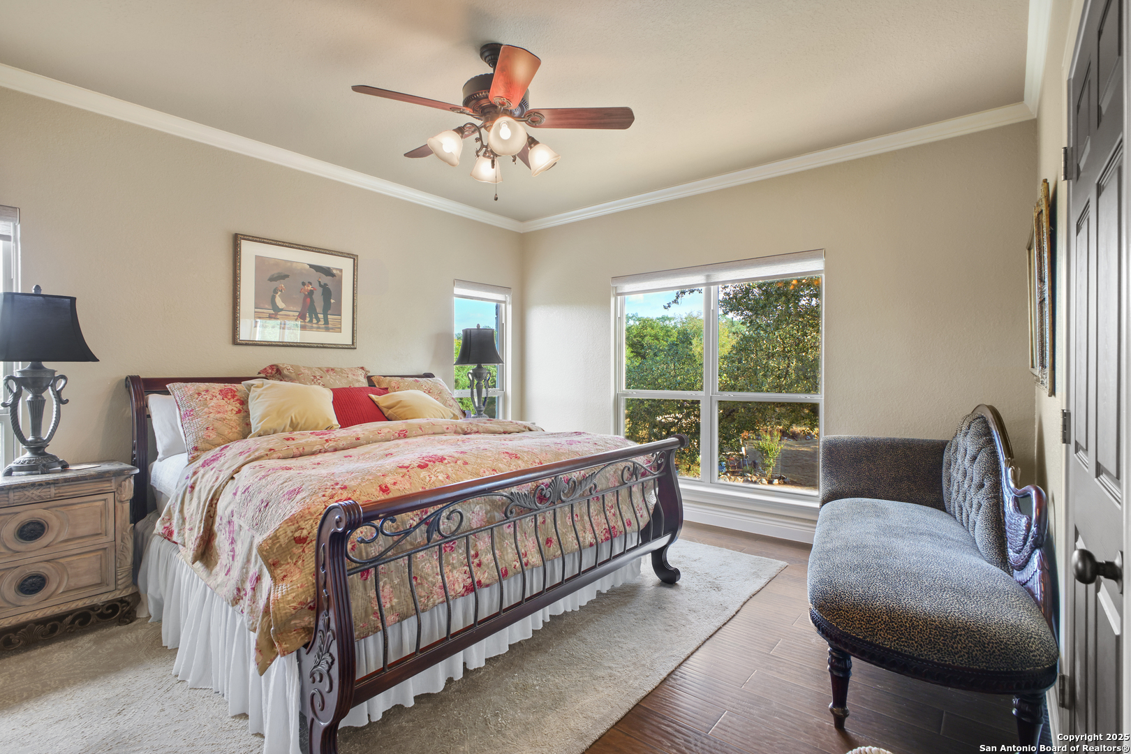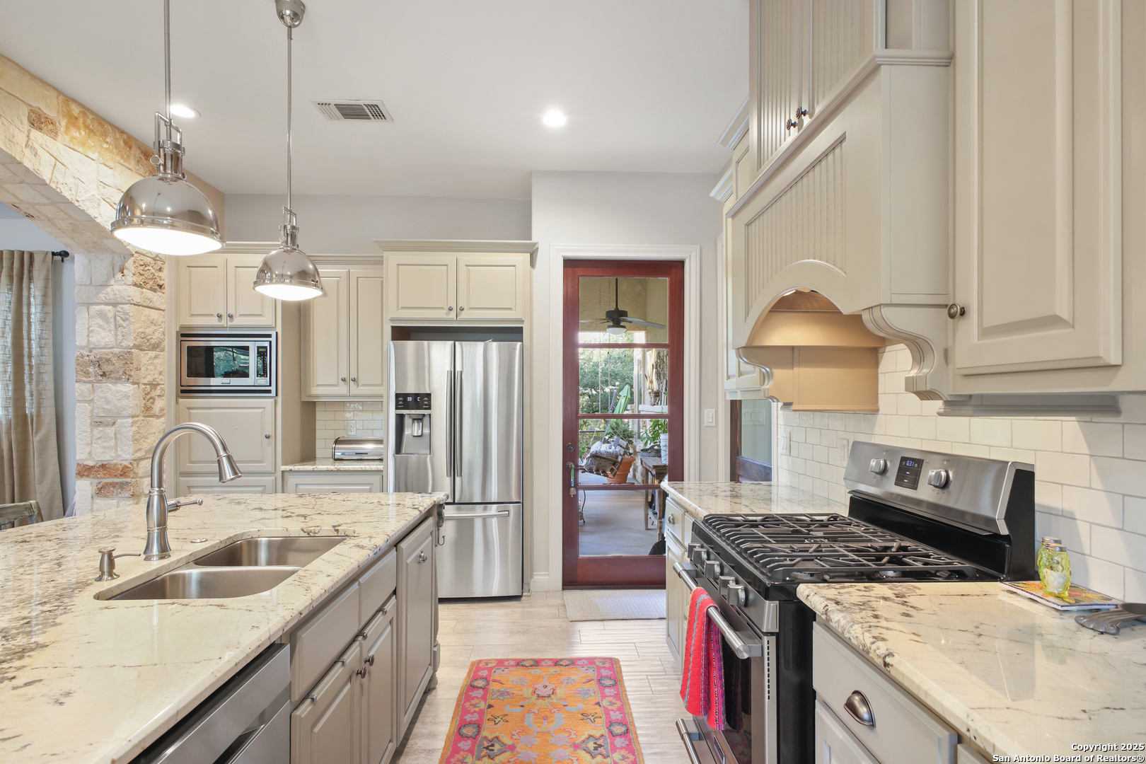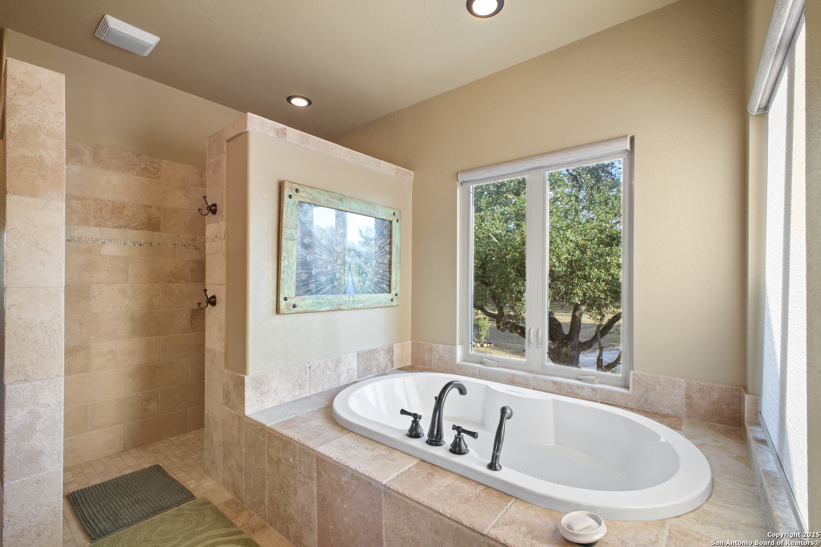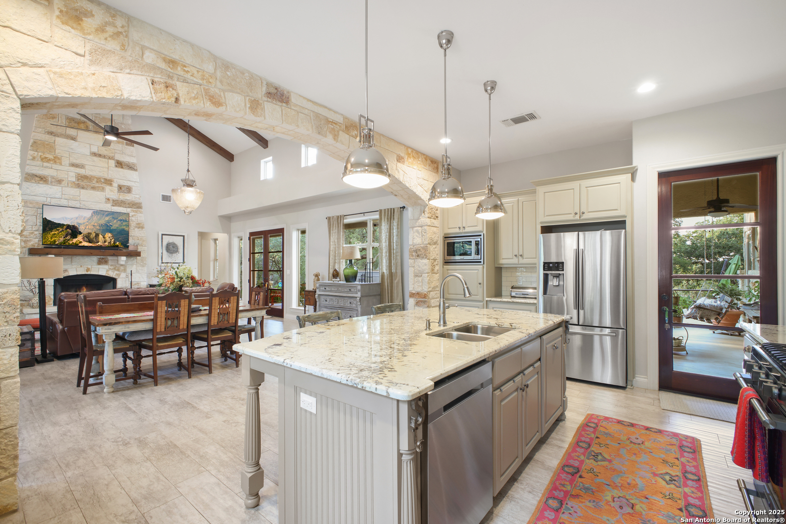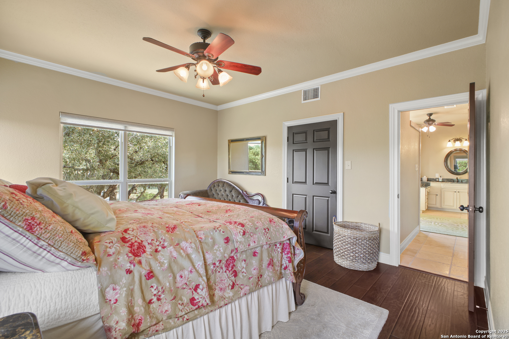 Welcome to this stunning 2,731 sq. ft. custom home on 2.83 acres, perfectly located just outside Bandera, the "Cowboy Capital of the World." This property offers the best of both worlds-peaceful Medina River frontage and breathtaking Hill Country views that stretch for miles. Set in an equestrian-friendly neighborhood, the grounds are beautifully landscaped with manicured trees, creating a private retreat where deer and wildlife frequently visit. Inside, you'll find soaring ceilings, oversized windows that capture the views, and a spacious open layout designed for modern living. The gourmet kitchen is the heart of the home, featuring a large granite island, stainless steel appliances, and abundant storage. Enjoy multiple outdoor living spaces including a front covered patios, a covered back patio, and an upstairs covered patio-all perfect for entertaining or relaxing while watching Hill Country sunsets. The floor plan is thoughtfully designed with a second living quarters upstairs, complete with its own bedroom, living area, full kitchen, and private patio-ideal for hosting guests, extended family, or in-laws. Beyond the home, the community amenities add even more value with basketball courts, a rodeo arena, swimming pools, and additional guest lodging available for visitors plus so much more. Additional highlights include a 4-car garage, abundant storage, and plenty of space for both relaxation and recreation. This one-of-a-kind property blends elegance, comfort, and Hill Country charm-don't miss your opportunity to make it yours.
