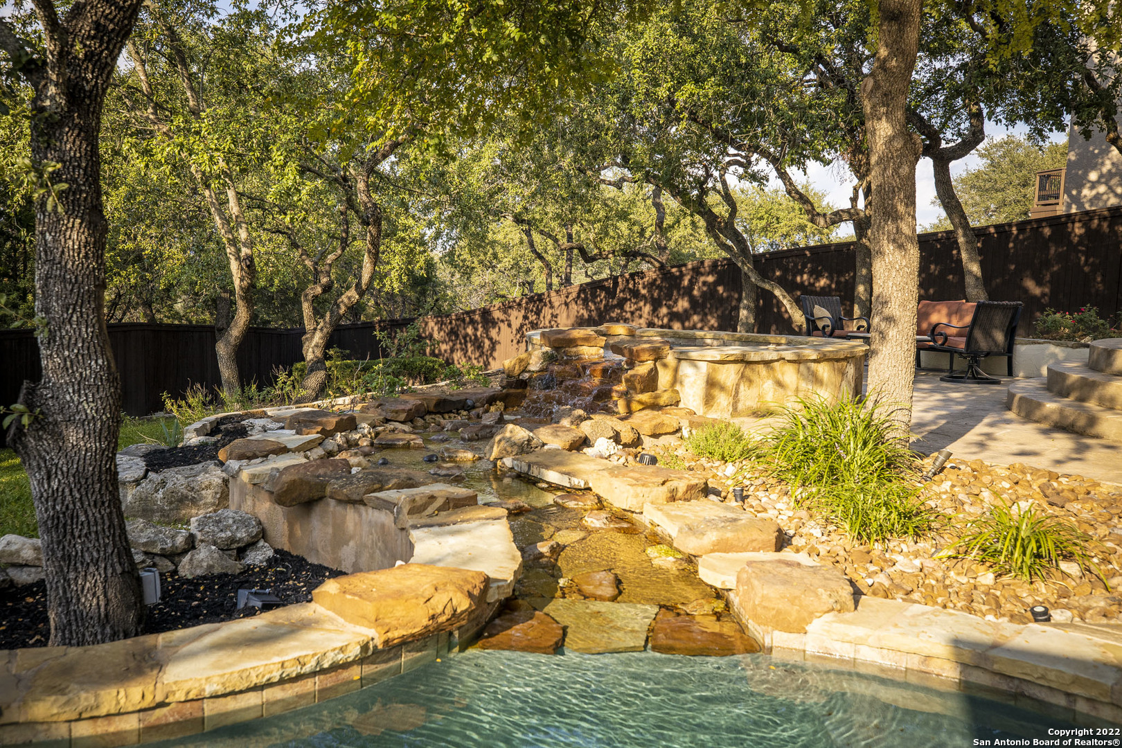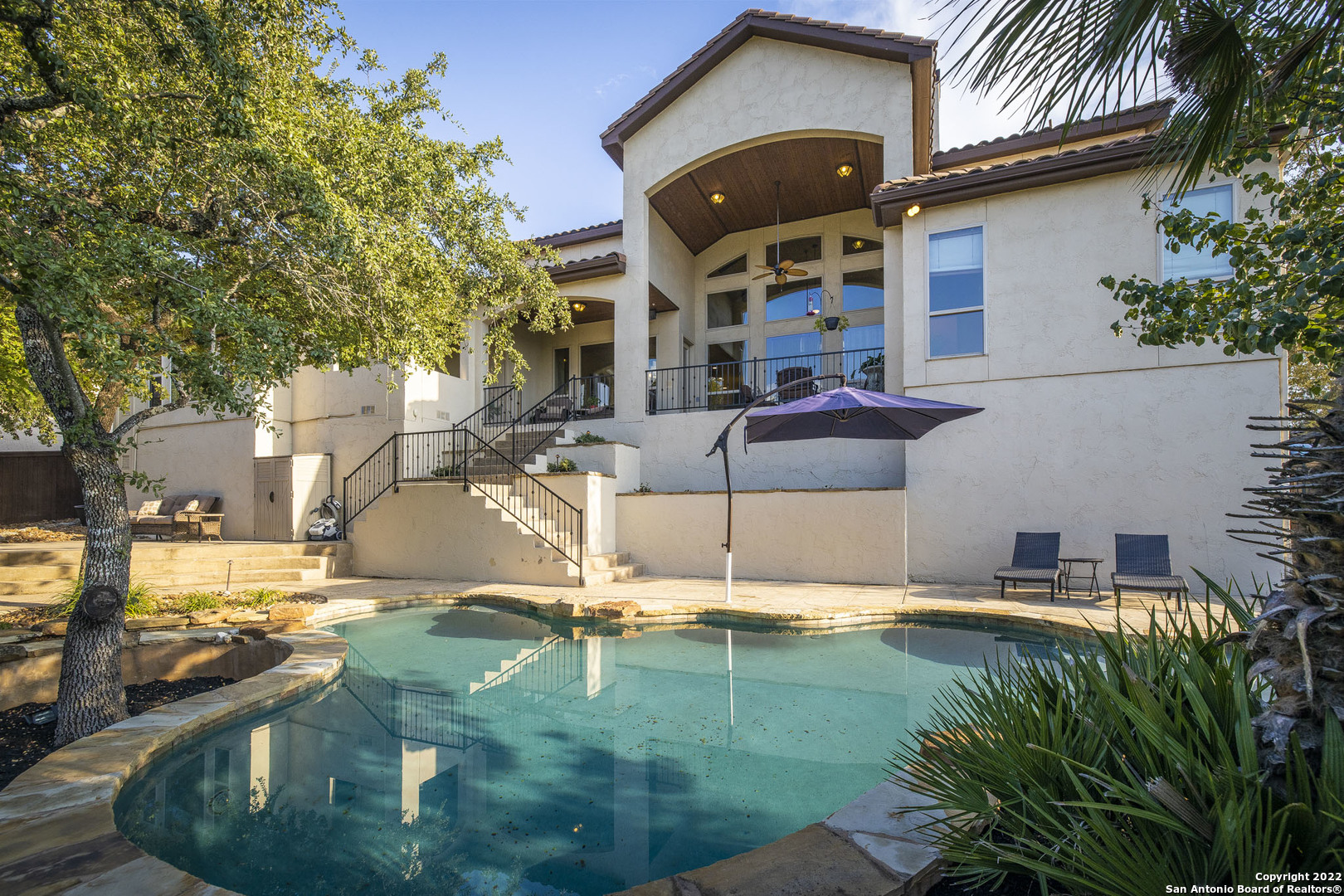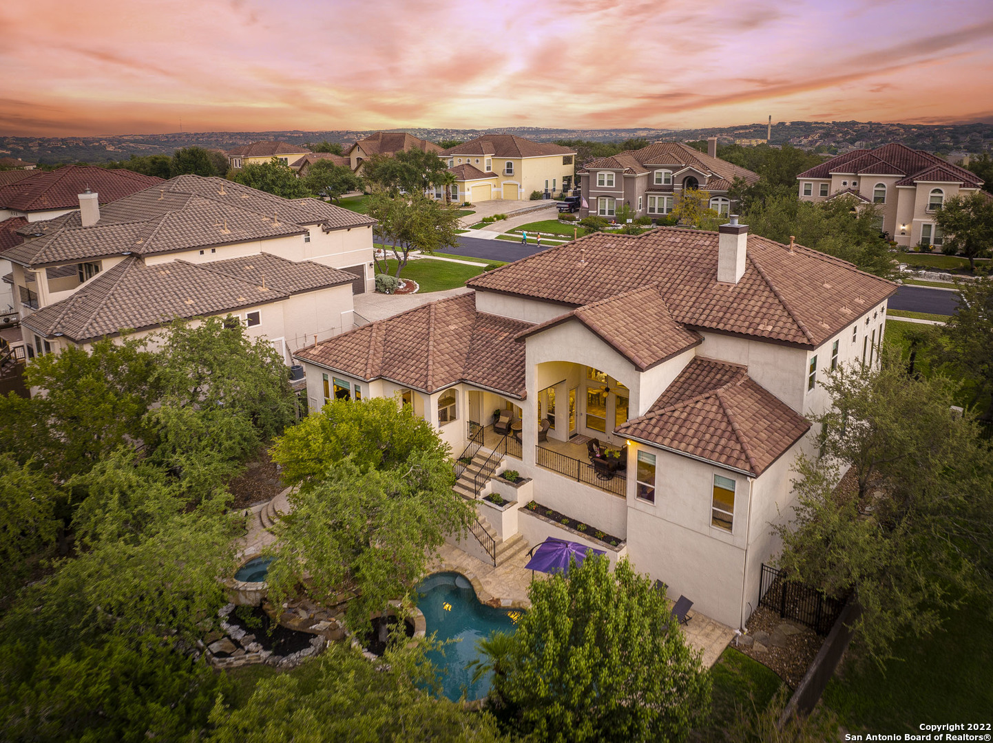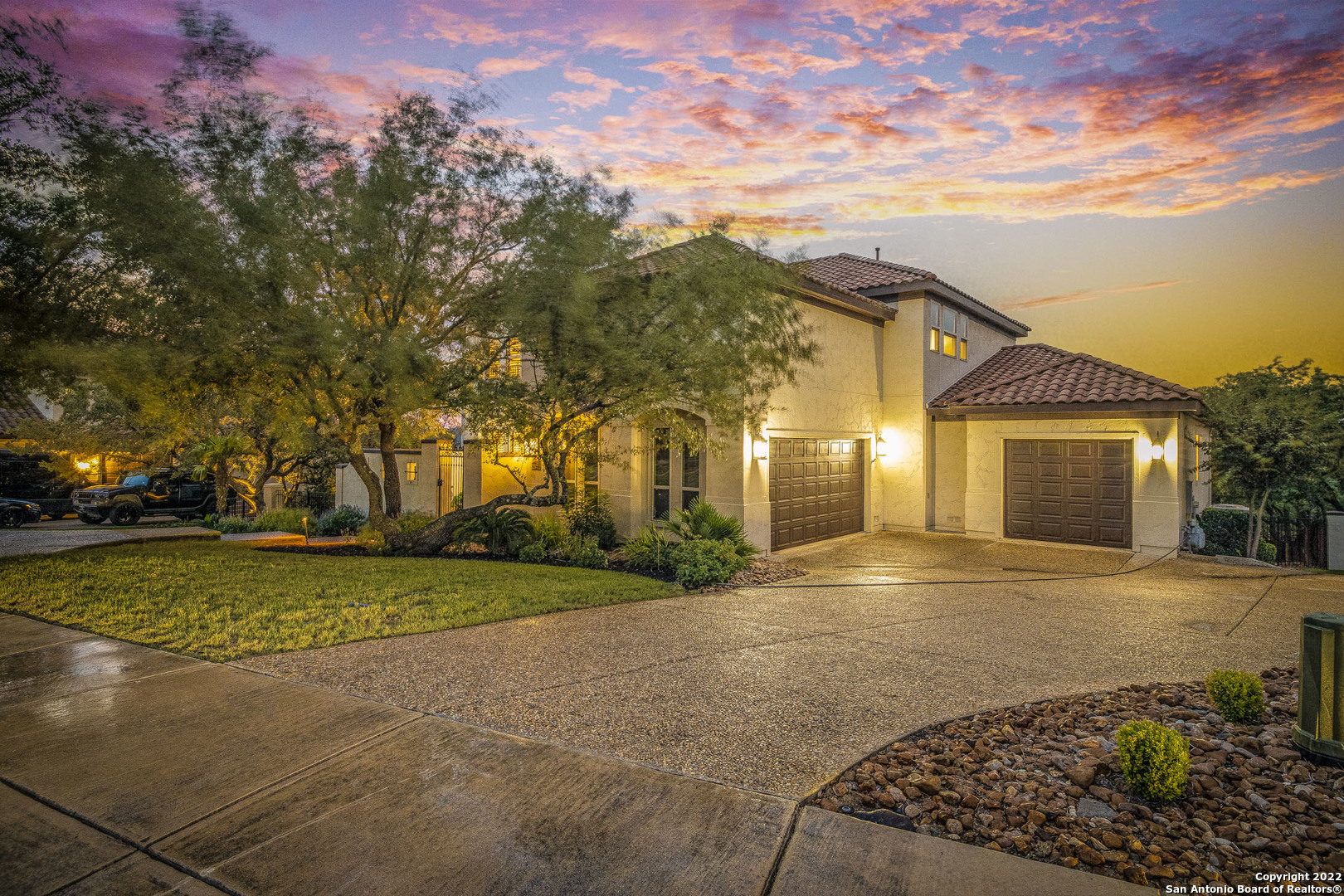 Desirable Canyon Springs offering this Beautiful Sanctuary... Mediterranean TX Hill Country Home including Wonderful Hill Country VIEWS...Great schools and NO City taxes! Master Bedroom, Secondary Bedroom and Study downstairs. Hand troweled walls, 5" Hand Scraped Hardwood and tile throughout first floor, Stacked Ledger Stone Accent Walls, Central Vac, Luxury Appliance Pkg including Double Ovens, Induction Stove Top and Valhalla Granite Counter Tops. Secluded backyard Oasis with Pool, Spa, Water Features, Ou