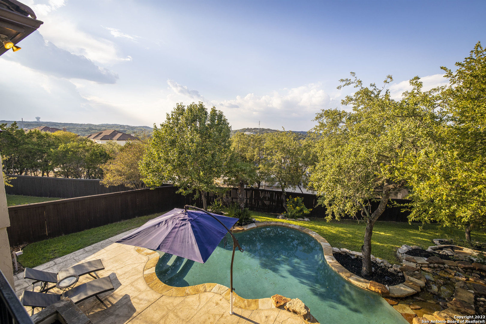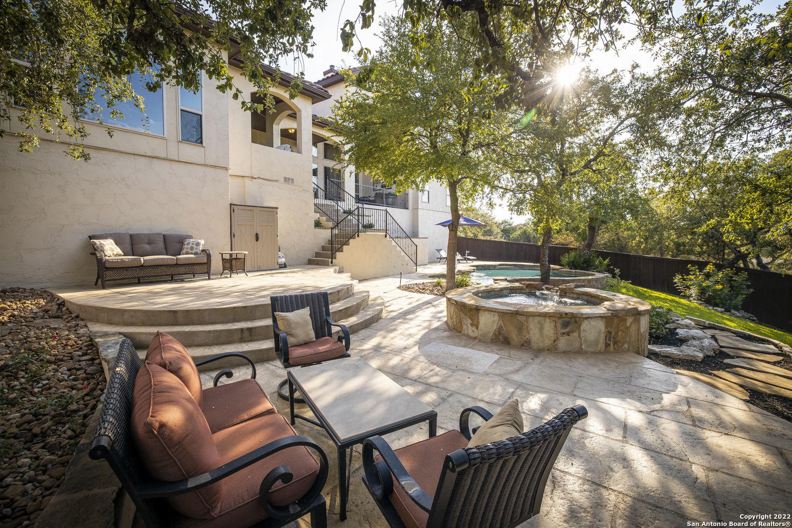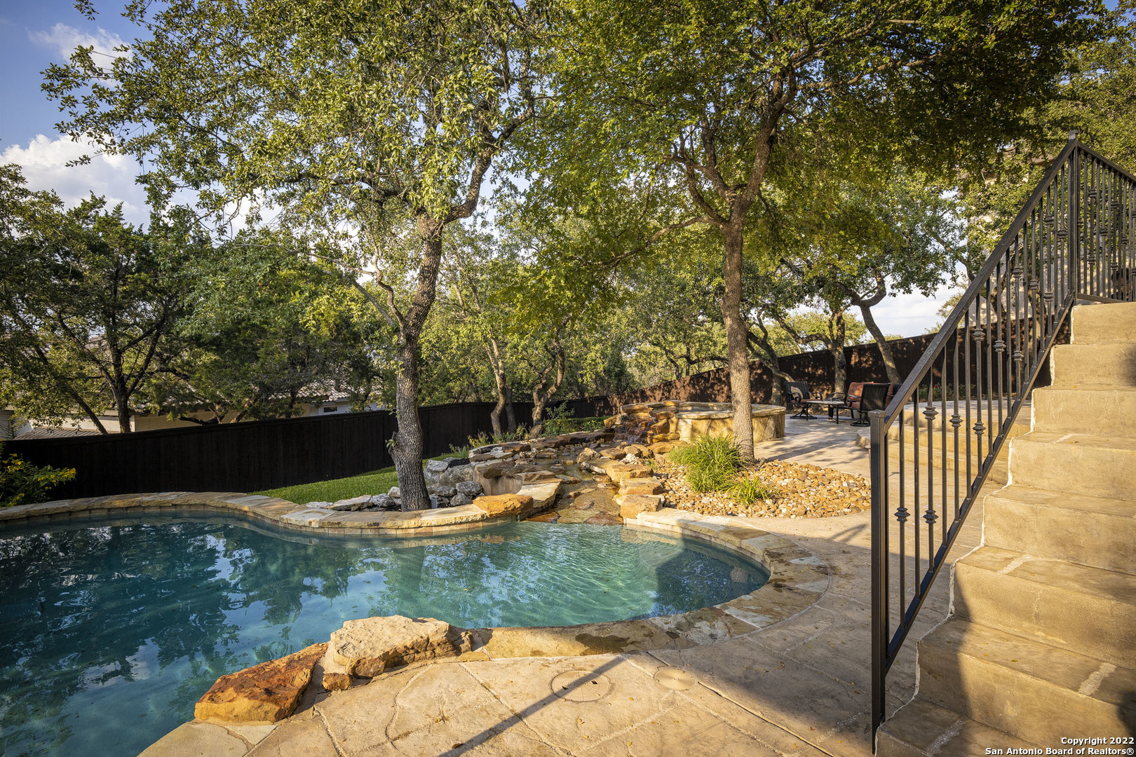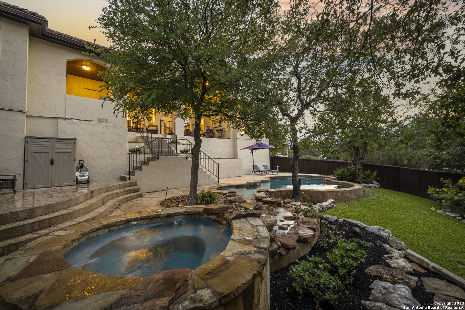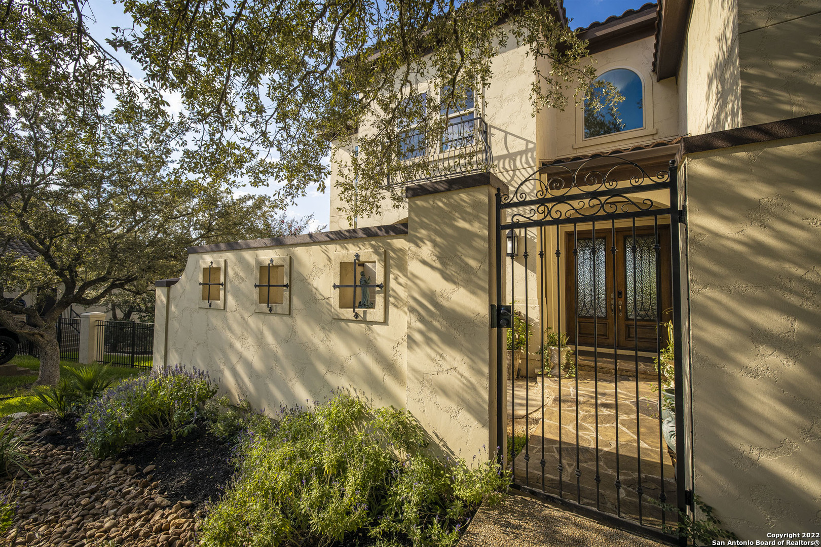 Desirable Canyon Springs offering this Beautiful Sanctuary... Mediterranean TX Hill Country Home including Wonderful Hill Country VIEWS...Great schools and NO City taxes! Master Bedroom, Secondary Bedroom and Study downstairs. Hand troweled walls, 5" Hand Scraped Hardwood and tile throughout first floor, Stacked Ledger Stone Accent Walls, Central Vac, Luxury Appliance Pkg including Double Ovens, Induction Stove Top and Valhalla Granite Counter Tops. Secluded backyard Oasis with Pool, Spa, Water Features, Ou