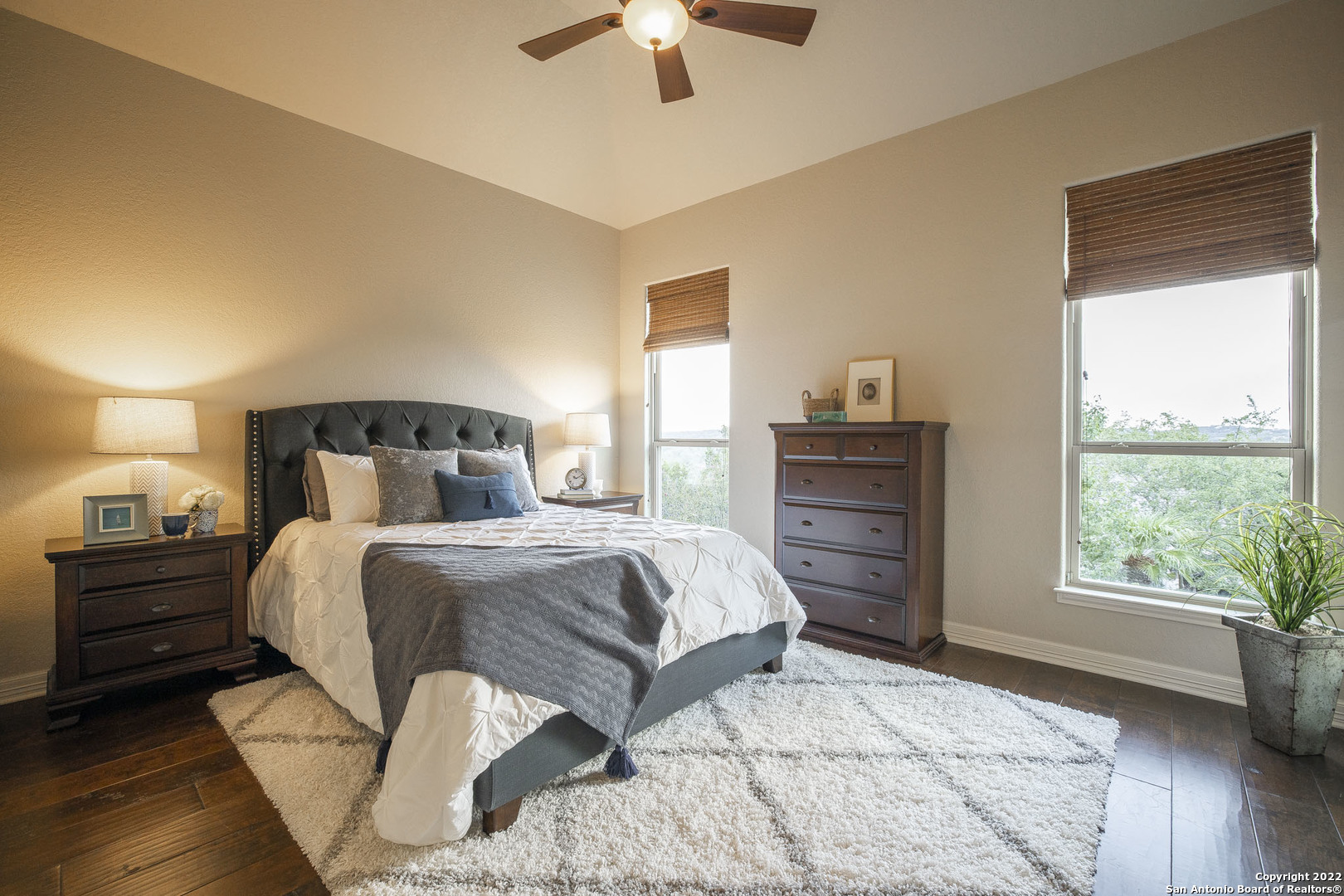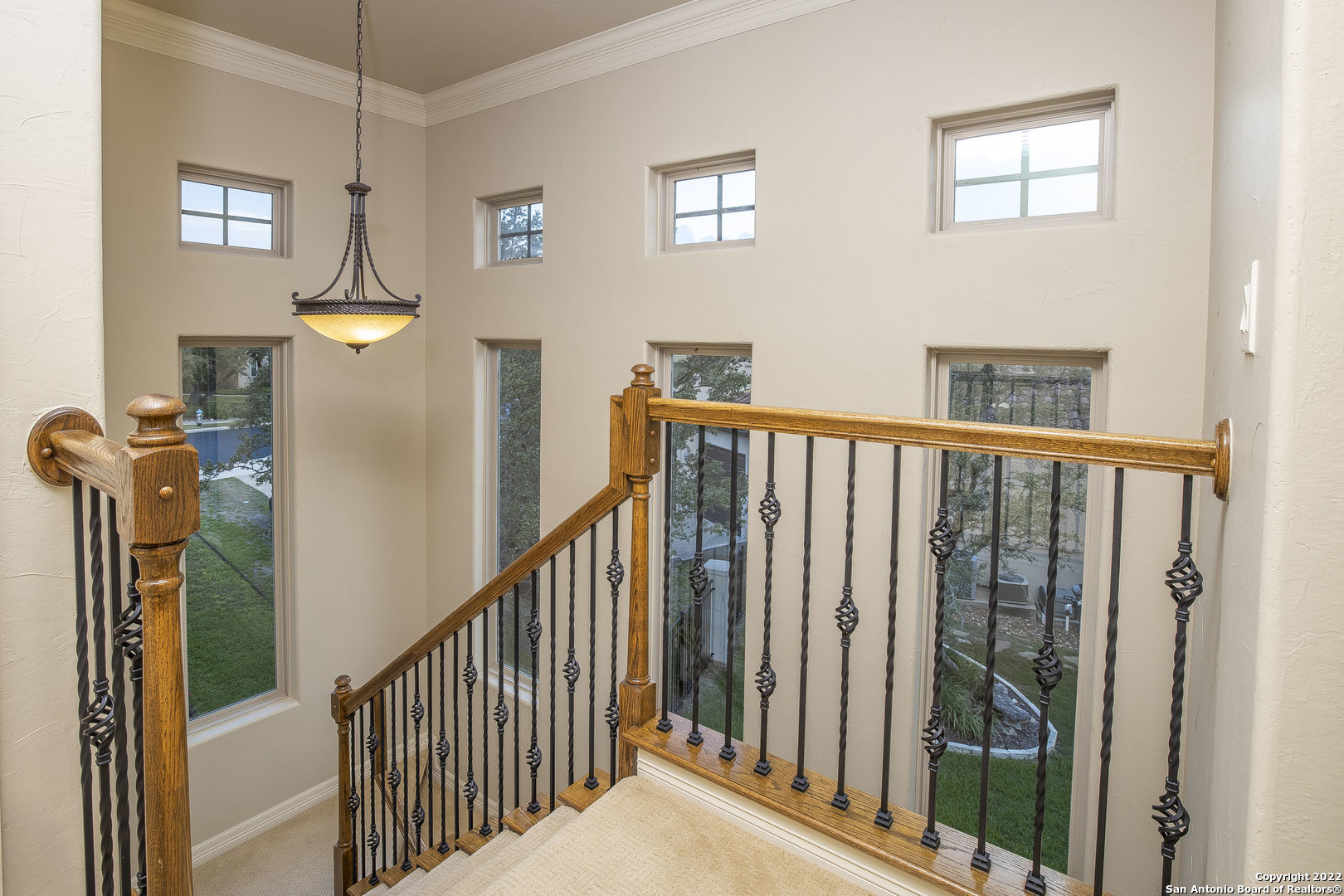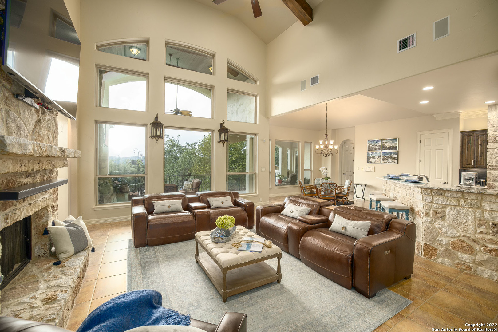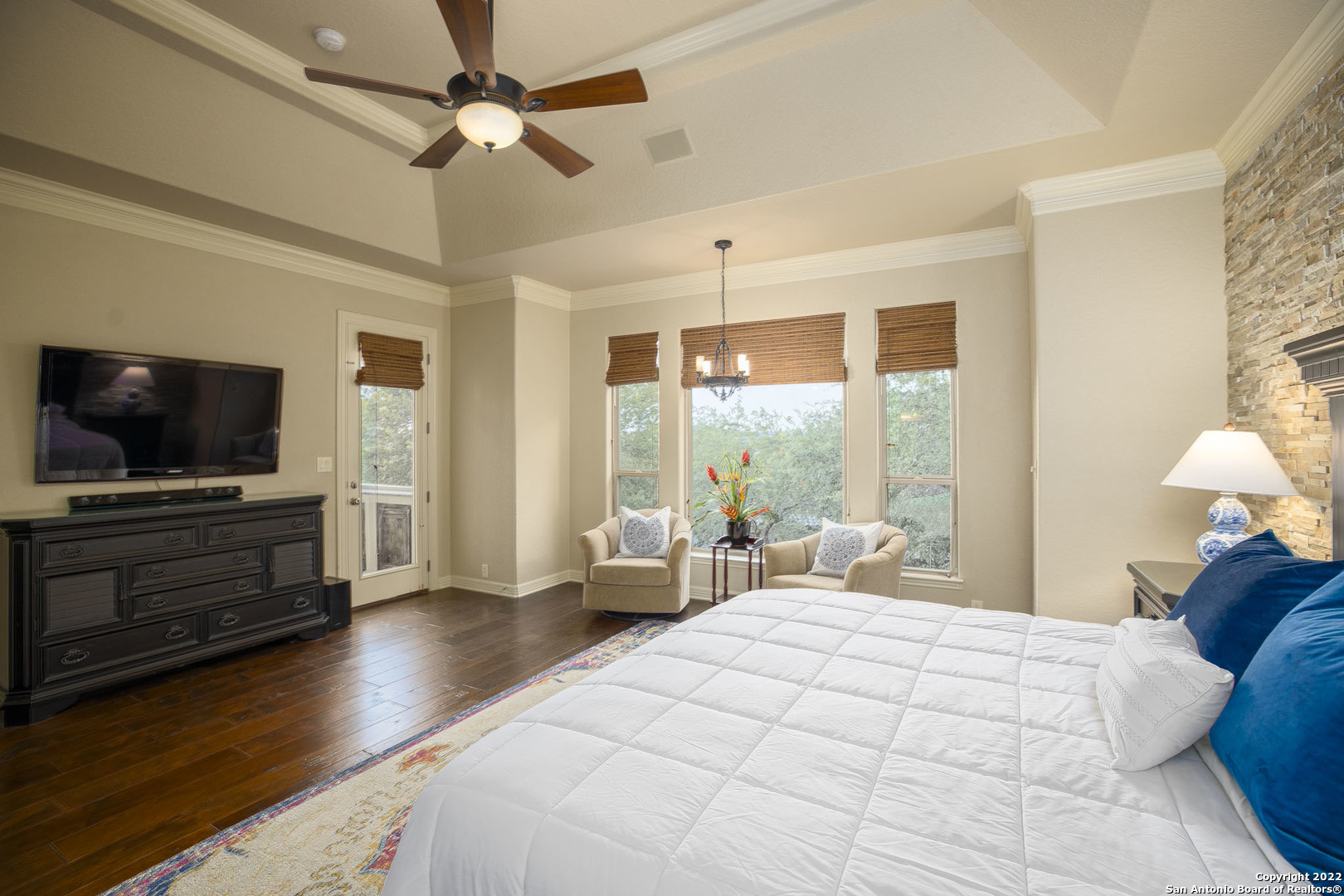 Desirable Canyon Springs offering this Beautiful Sanctuary... Mediterranean TX Hill Country Home including Wonderful Hill Country VIEWS...Great schools and NO City taxes! Master Bedroom, Secondary Bedroom and Study downstairs. Hand troweled walls, 5" Hand Scraped Hardwood and tile throughout first floor, Stacked Ledger Stone Accent Walls, Central Vac, Luxury Appliance Pkg including Double Ovens, Induction Stove Top and Valhalla Granite Counter Tops. Secluded backyard Oasis with Pool, Spa, Water Features, Ou