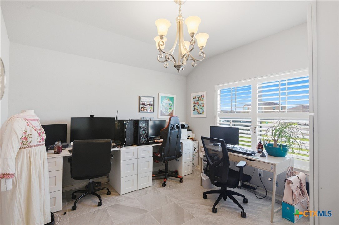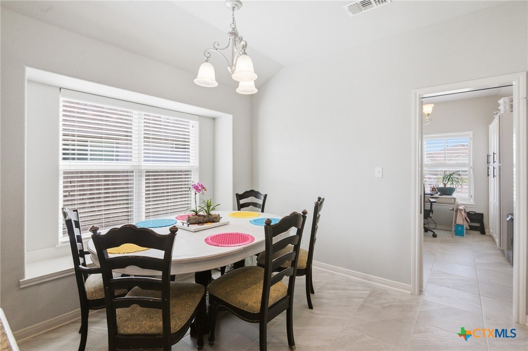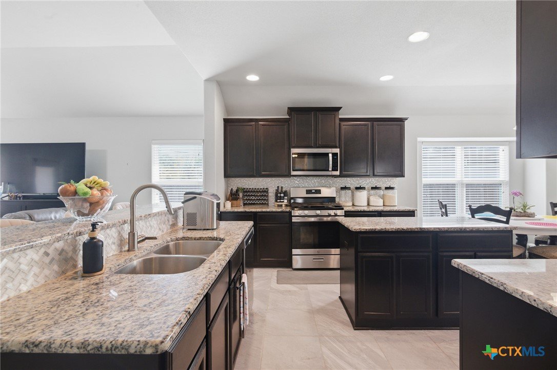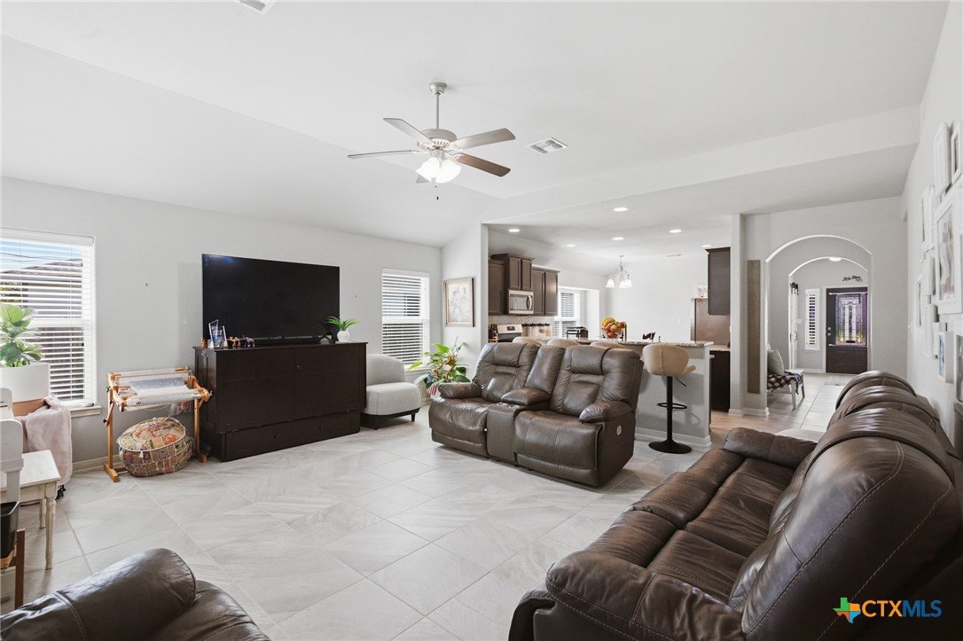 Beautiful 4 bedroom, 2 bath home with a versatile flex-room-- perfect as a study or formal dining room, with stylish barn-style sliding doors off the foyer. The inviting entry showcases arched openings, a tray ceiling and decorative art niches, which add architectural charm. The kitchen is well-appointed with a gas range, built in microwave, dishwasher, rich dark stained cabinetry, granite tops, a center island and a breakfast bar that overlooks the open concept family room with volume ceilings. Designed with a split bedroom layout, the primary suite features a pop-up ceiling treatment and a private bath with an oversized walk in shower and double vanity. Enjoy entertaining on the covered patio, surrounded by a large back yard with plenty of room to relax or play. Situated on a cul-de-sac, this home offers both comfort and convenience and is just blocks from shopping and schools.