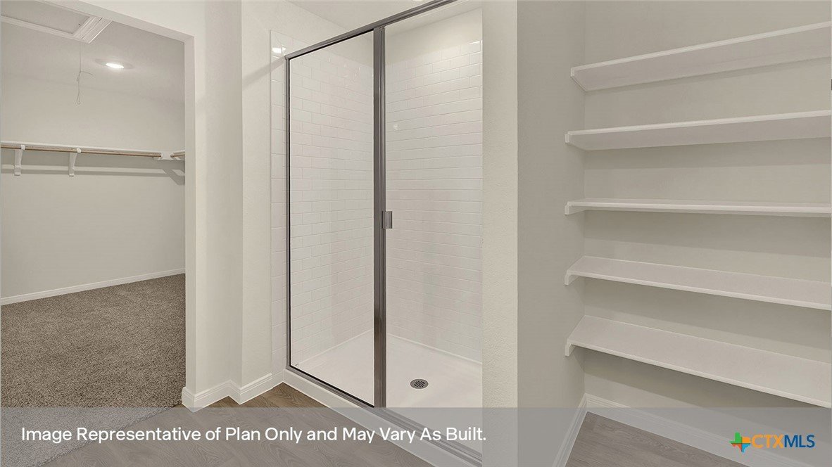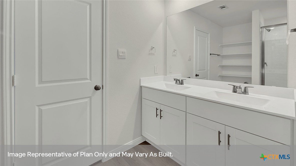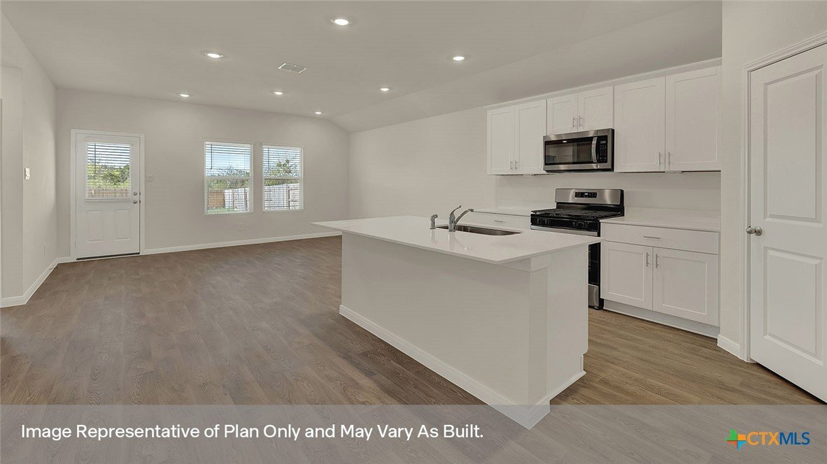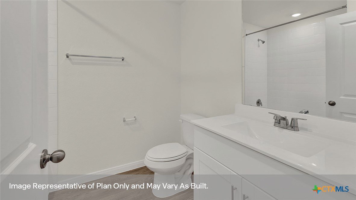 JANUARY ESTIMATED COMPLETION. CORNER LOT. EASY ACCESS TO I-35! Check out the Harris floorplan, our largest one-story home available at Paramount in Kyle, Texas. Perfect for roommates or larger families, this 4 bedroom, 2.5 bathroom, 2 car garage home offers 1,822 square feet of comfortable living space. Our homes in Paramount feature our modern farmhouse exterior and the Harris plan is available in 2 exterior options. At the front of the home, off the foyer, you have two secondary bedrooms and a full bathroom, which includes a shower/tub combination. Moving through the foyer and down a small hall, you will find the half bathroom, utility room and another secondary bedroom. All secondary bedrooms feature a closet with shelving. Whether you use these rooms as an office, child’s room or guest room, there is plenty of space for work, sleep, and play. Making your way through the house, you’ll walk into the heart of the home, the living area. Built as an open concept, move easily between the kitchen, dining, and family room. The L-shaped kitchen includes quartz countertops, a large island with undermount sink, a corner pantry closet, stainless-steel appliances and 36’’ upper cabinets. The primary bedroom is located off the family room. This spacious bedroom will be your oasis at the end of a long day. Enjoy the private bathroom, which features a walk-in shower, marble countertops with dual vanity, separate toilet area with a door, and a large walk-in closet. The Harris includes vinyl flooring throughout the common areas of the home and carpet in the bedrooms. All our new homes at Paramount feature extra storage space in the garage, a covered back patio, full sod, and an irrigation system in the front and back yard. This home comes with our America’s Smart Home base package, which includes Video Front Door Bell, Front Door Deadbolt Lock, Home Hub, Thermostat, and Deako® Smart Switches.