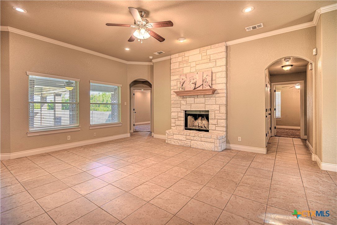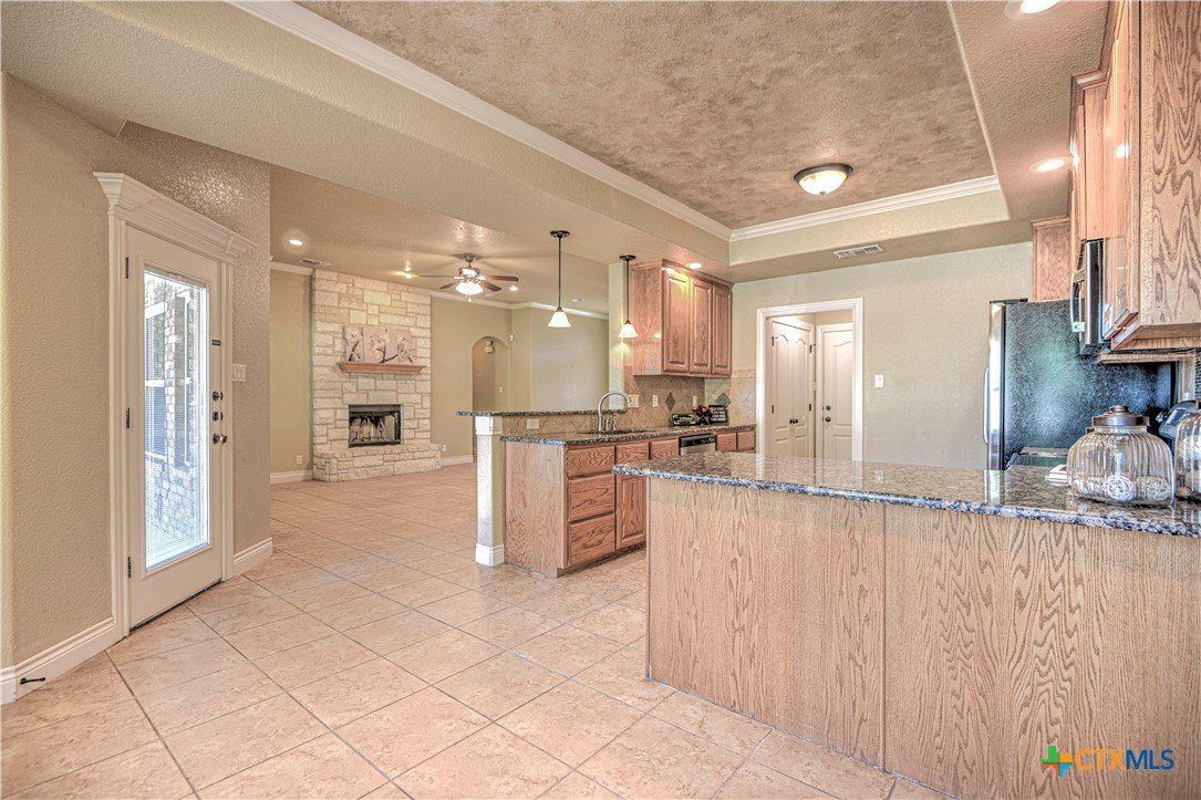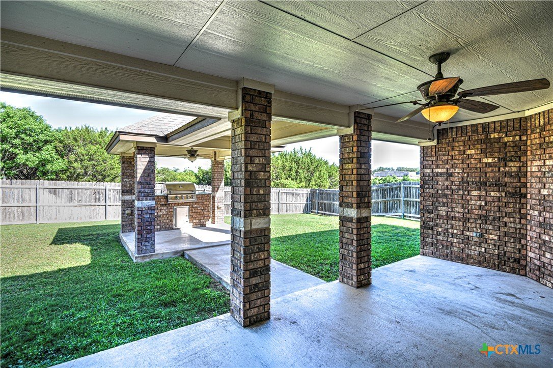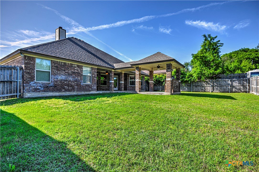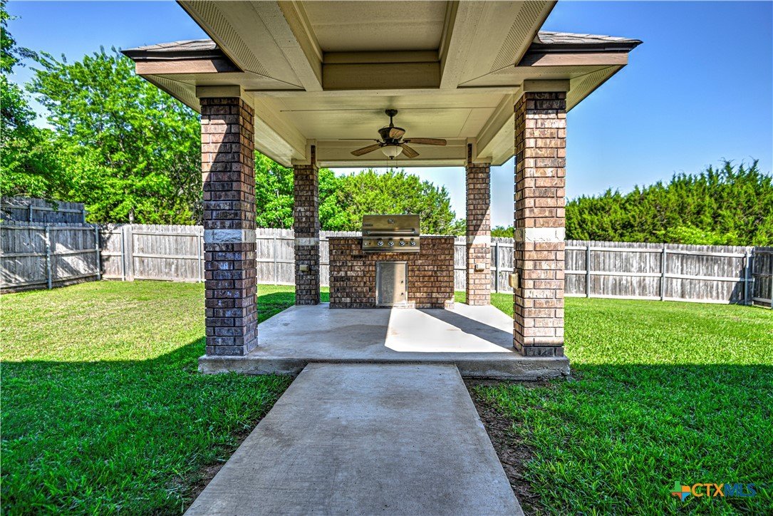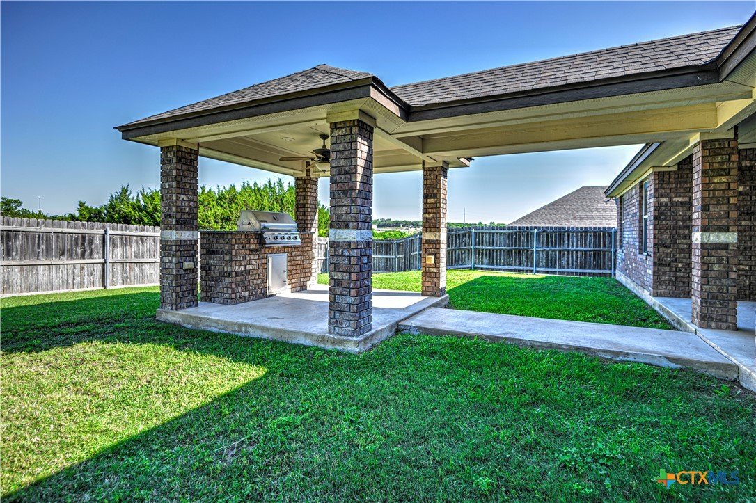 If your dream home includes the perfect place to gather, grill, and grow, this one checks every box—and adds a few you didn’t know you needed. Set beside an open lot for extra privacy and breathing room, this property was designed with hosting in mind. The fully covered extended patio is ready for any occasion, with a built-in grill, ceiling fan, and lighting that keeps the party going well past sunset. A covered walkway connects every outdoor element for a seamless flow between cooking, relaxing, and entertaining. Inside, thoughtful architectural details set the tone—arched entries, classic crown molding, and wide open living areas bring character and warmth to every corner. The spacious great room is anchored by a striking white stone fireplace, perfect for cozy nights or lively get-togethers. The kitchen is a true centerpiece: granite countertops shine under pendant lights, while a tile backsplash and stainless steel appliances add polish and practicality. The long breakfast bar offers front-row seating for casual meals or just keeping the cook company. Tucked away for privacy, the owner’s suite is your personal sanctuary. A tiered ceiling adds elegance, while the luxurious bath features a corner jetted tub and separate shower. You’ll love the oversized walk-in closet—complete with built-in shelving and storage to keep everything in its place. Two of the secondary bedrooms also feature walk-in closets, making this home as functional as it is beautiful.