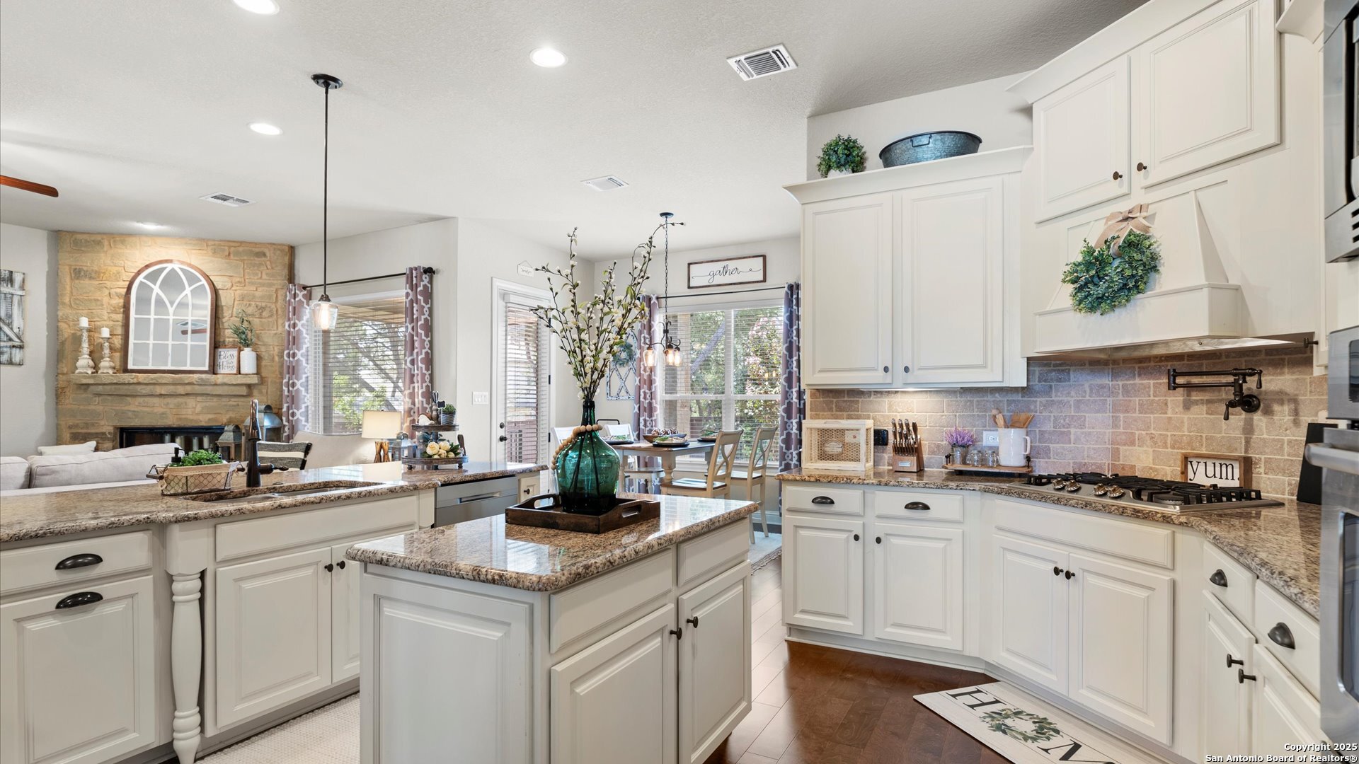 One story home located in Manor Creek, a gated community in the heart of the Hill Country of Central Texas. This beautiful home is set on a cul-de-sac on over a third of an acre and features three bedrooms and two baths along with a study and a formal dining room/eat in kitchen. This open floor plan is perfect for entertaining. Large kitchen with an island, stainless steel appliances, double wall ovens, and a beautiful stone fireplace add warmth and coziness. Don't miss out on seeing this pristinely kept home!