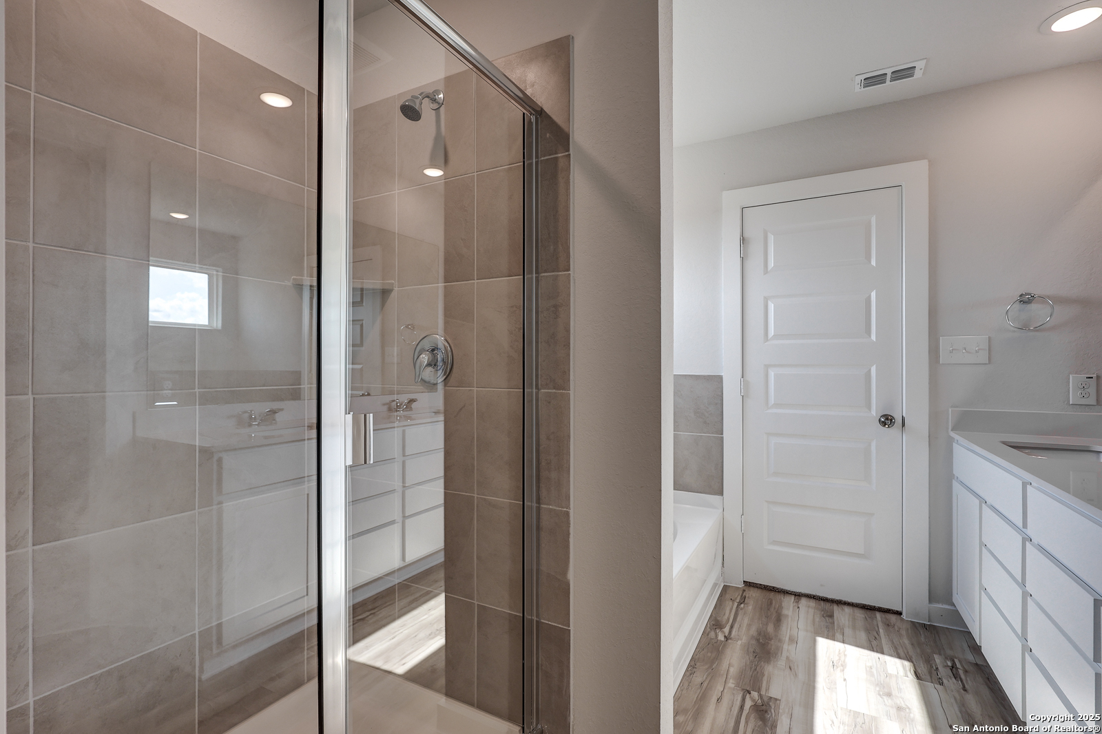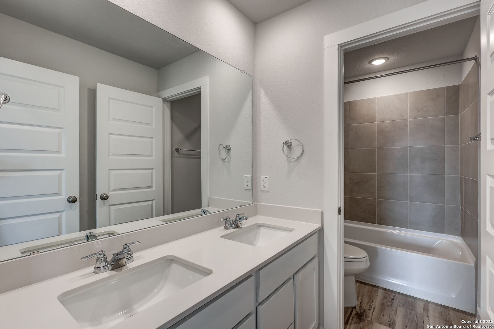 ** The Wilson at Hiddenbrooke offers a spacious two-story retreat, beginning with a welcoming foyer that leads into an expansive open-concept great room. This central area seamlessly integrates distinct dining and living spaces alongside a well-appointed kitchen featuring an island and corner pantry. Accessible from this hub is an optional covered patio, perfect for outdoor enjoyment, complemented by a charming front porch. A convenient half bathroom is also situated on the first floor. Upstairs, three bedrooms provide private living quarters. Two bedrooms share a full bathroom, while the primary suite enjoys its own en-suite bathroom with a dual-sink vanity and a spacious walk-in closet. A dedicated laundry room completes the upper level of this thoughtfully designed home. Additional highlights include 42" grey shaker-style kitchen cabinets with quartz countertops, luxury wood-look vinyl plank flooring in common areas, stainless-steel appliances, separate garden tub and shower in the primary bath, extra recessed can lights throughout, cultured marble countertops with modern rectangular sinks in bathrooms, a landscape package with sprinkler system, a covered patio, a garage door opener with two remotes, and exceptional features such as the Century Home Connect smart home package.
