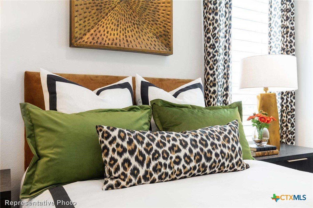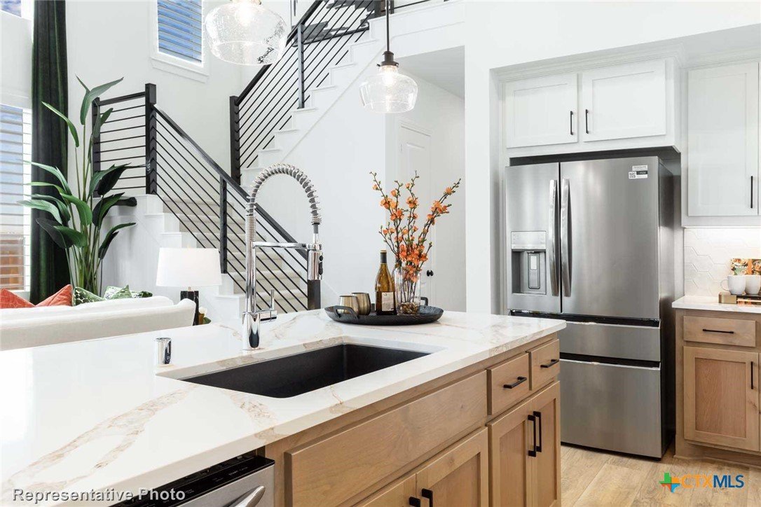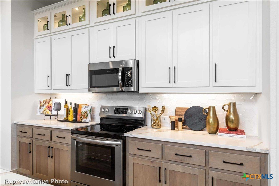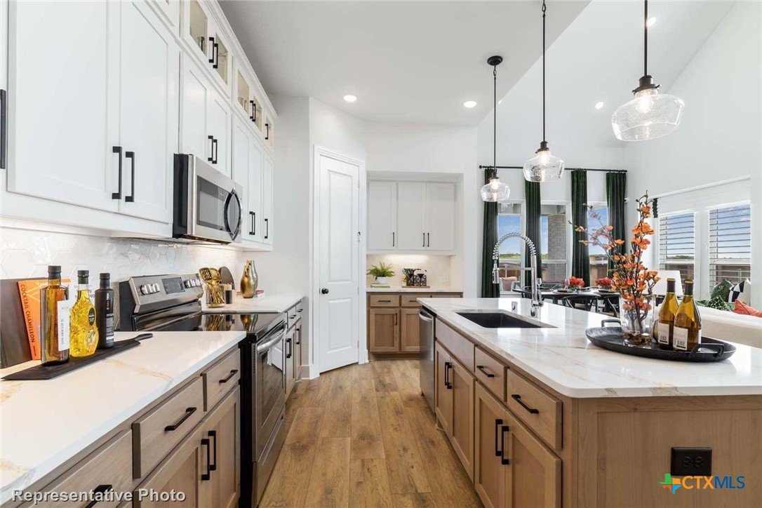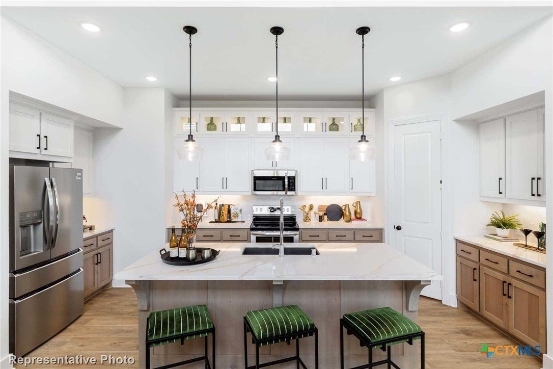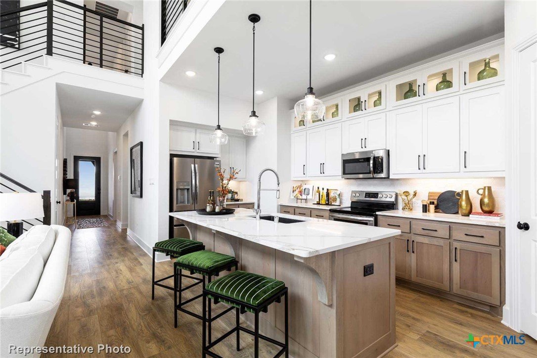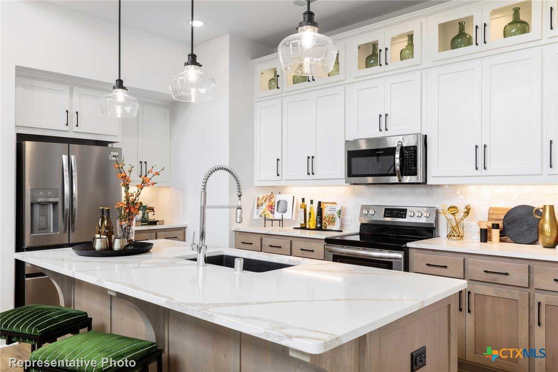 MLS 563278 - Built by Highland Homes - Ready Now! ~ Two story home with brick elevation and the added option of an entertainment room on the second floor make it one of our larger two story plans. Features include gourmet kitchen with microwave oven, gas cooktop w stainless steel vent hood and center island with quartz countertops. This home includes 8' doors downstairs, freestanding tub in primary bath, master bay window, iron railing at stairs to top ilo standard half wall, and extended outdoor living area. Full sod and sprinkler system included!