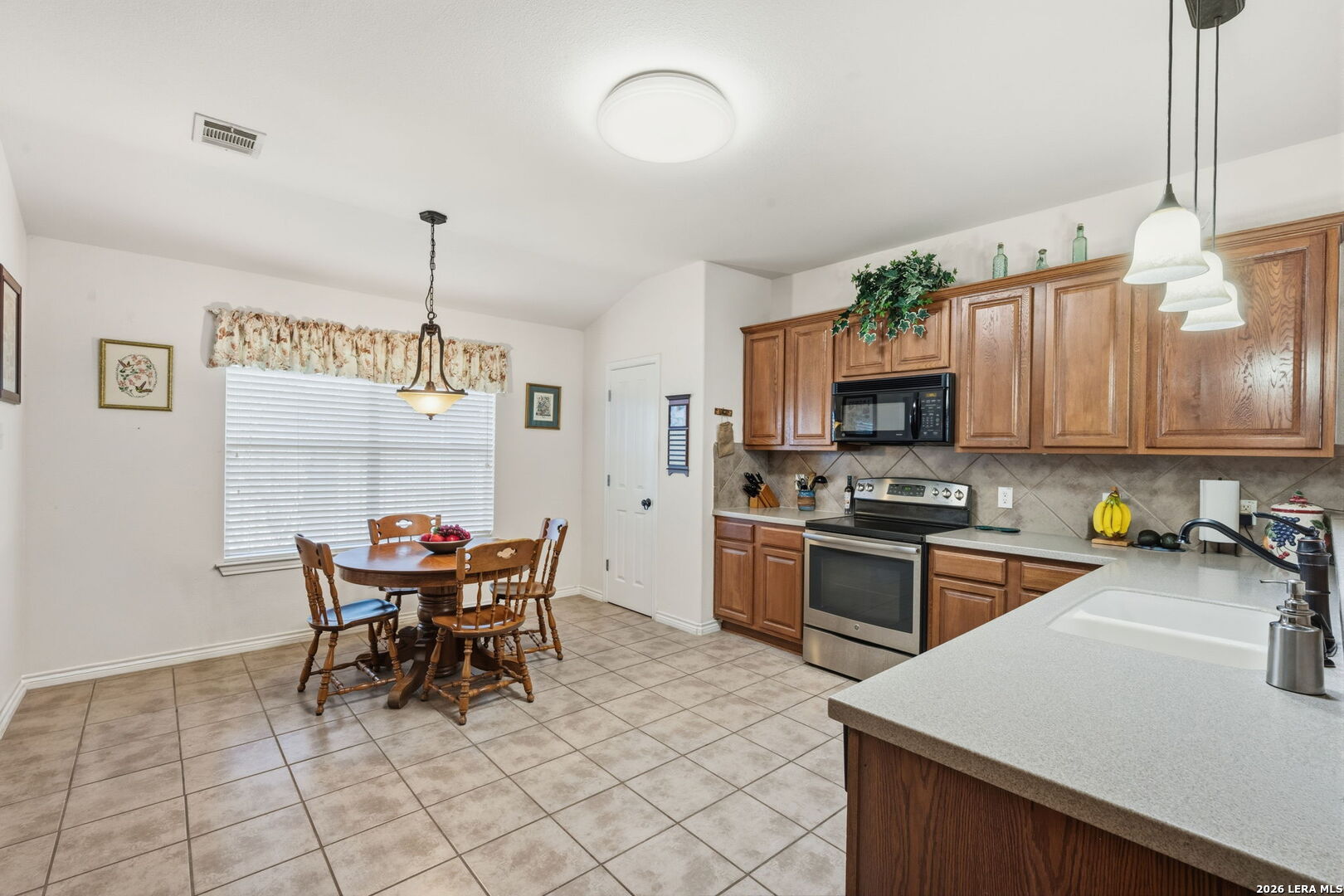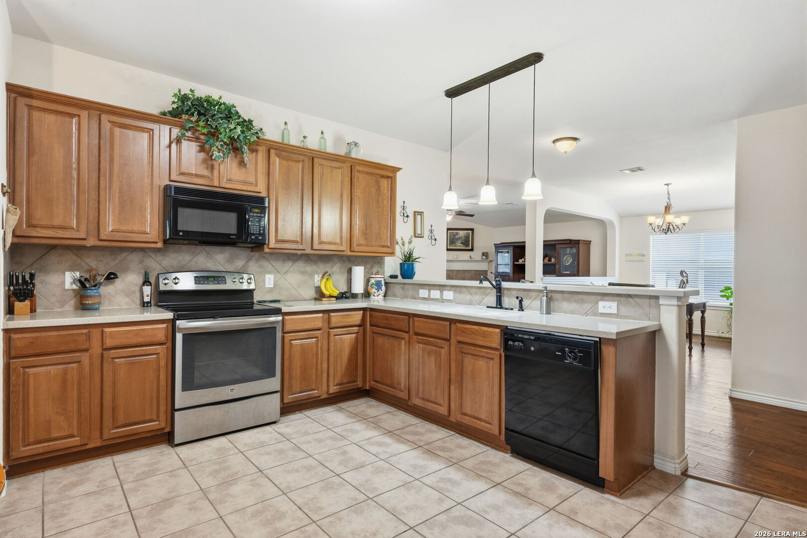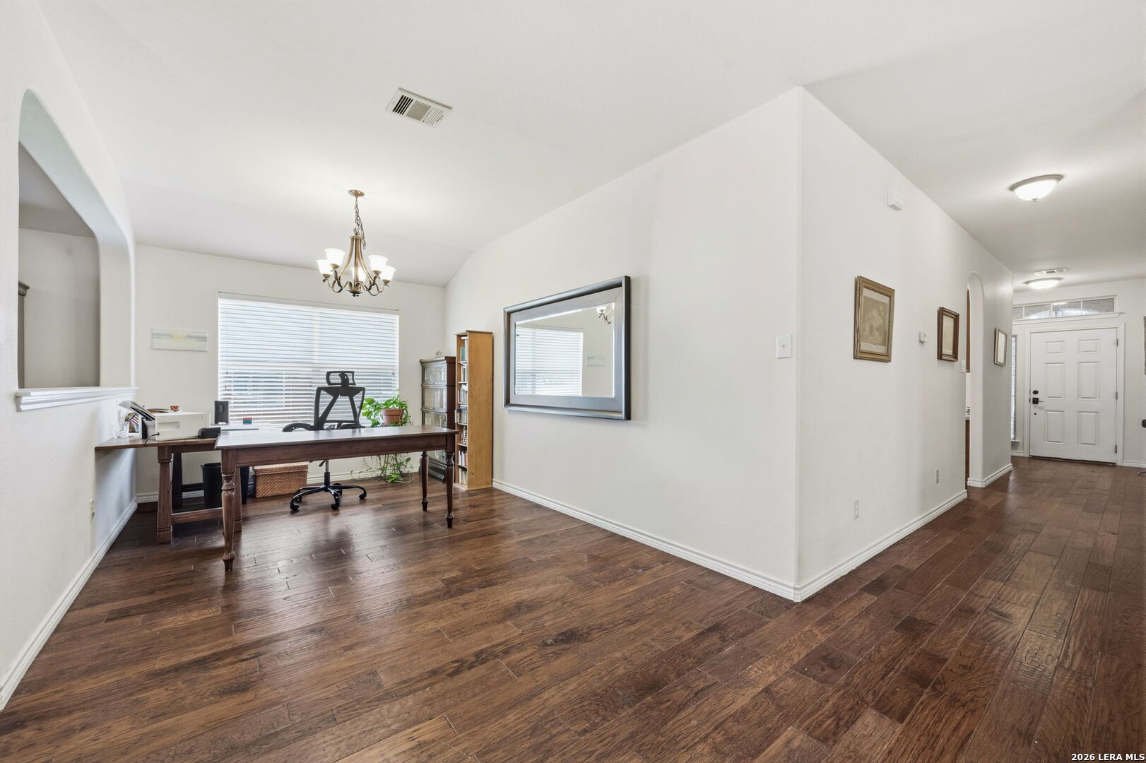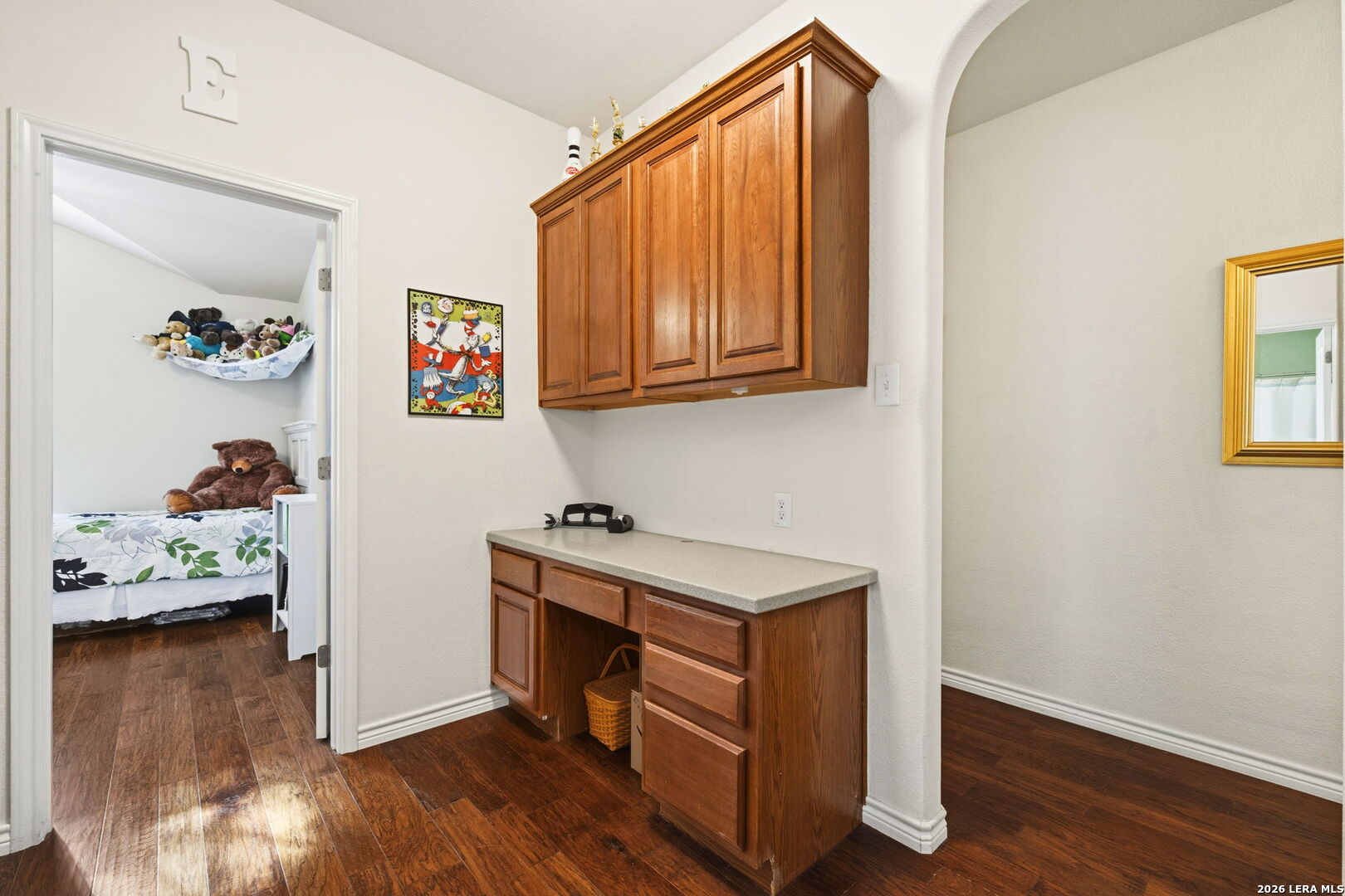 Nestled on a quiet cul-de-sac lot shaded by mature trees, this beautiful home offers the perfect blend of comfort, space, and flexibility. Inside, you'll find wood flooring throughout the main living areas with tile in all wet areas, combining style with easy maintenance. The oversized kitchen is designed for both everyday living and entertaining, featuring abundant cabinet space, flat-top cooking, a mounted microwave, and room for an eat-in kitchen setup. A separate dining room provides incredible versatility and can easily function as a home office, kids' play area, gym, or flex space to suit your needs. The wide-open floor plan, high ceilings, and abundant natural light create an inviting and airy atmosphere throughout the home. Secondary bedrooms are thoughtfully split from the oversized primary suite, offering added privacy. The primary bedroom features crown molding and a spacious walk-in closet, while the primary bath includes a double vanity, separate garden tub, and walk-in shower. An office nook conveniently located in the secondary bedroom hallway adds extra functionality for remote work or study. Outside, enjoy relaxing or entertaining on the large covered patio, surrounded by natural trees and a privacy fence. The home also includes a full sprinkler system and a 2-car garage, completing this exceptional property. This home checks all the boxes-space, flexibility, privacy, and charm-ready to fit your lifestyle.