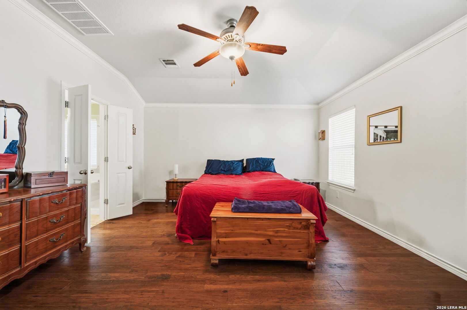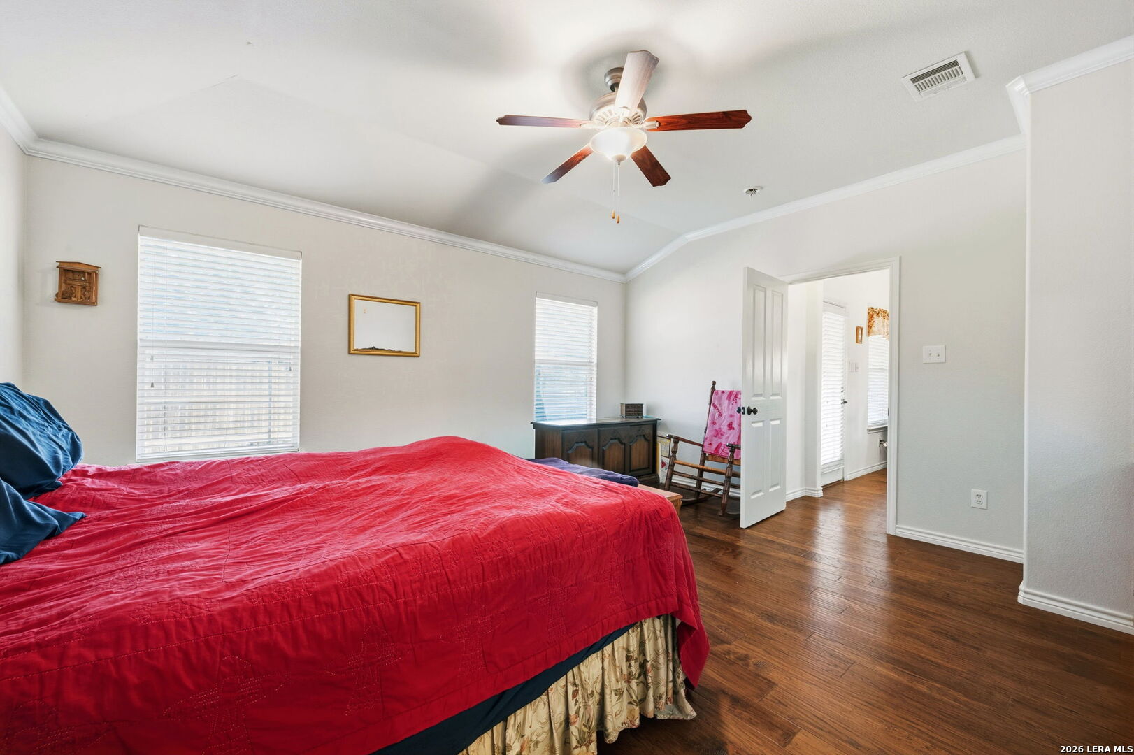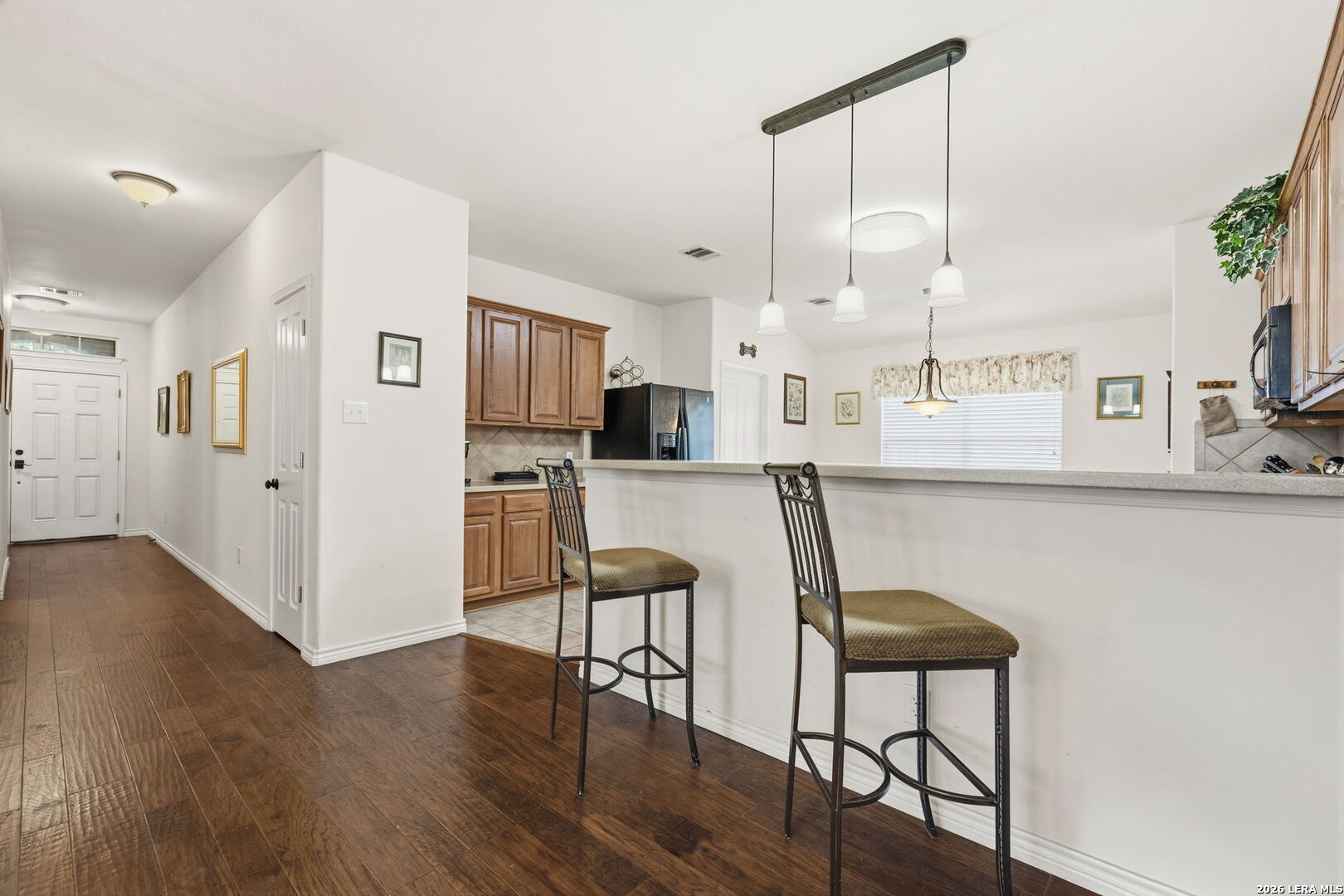 Nestled on a quiet cul-de-sac lot shaded by mature trees, this beautiful home offers the perfect blend of comfort, space, and flexibility. Inside, you'll find wood flooring throughout the main living areas with tile in all wet areas, combining style with easy maintenance. The oversized kitchen is designed for both everyday living and entertaining, featuring abundant cabinet space, flat-top cooking, a mounted microwave, and room for an eat-in kitchen setup. A separate dining room provides incredible versatility and can easily function as a home office, kids' play area, gym, or flex space to suit your needs. The wide-open floor plan, high ceilings, and abundant natural light create an inviting and airy atmosphere throughout the home. Secondary bedrooms are thoughtfully split from the oversized primary suite, offering added privacy. The primary bedroom features crown molding and a spacious walk-in closet, while the primary bath includes a double vanity, separate garden tub, and walk-in shower. An office nook conveniently located in the secondary bedroom hallway adds extra functionality for remote work or study. Outside, enjoy relaxing or entertaining on the large covered patio, surrounded by natural trees and a privacy fence. The home also includes a full sprinkler system and a 2-car garage, completing this exceptional property. This home checks all the boxes-space, flexibility, privacy, and charm-ready to fit your lifestyle.