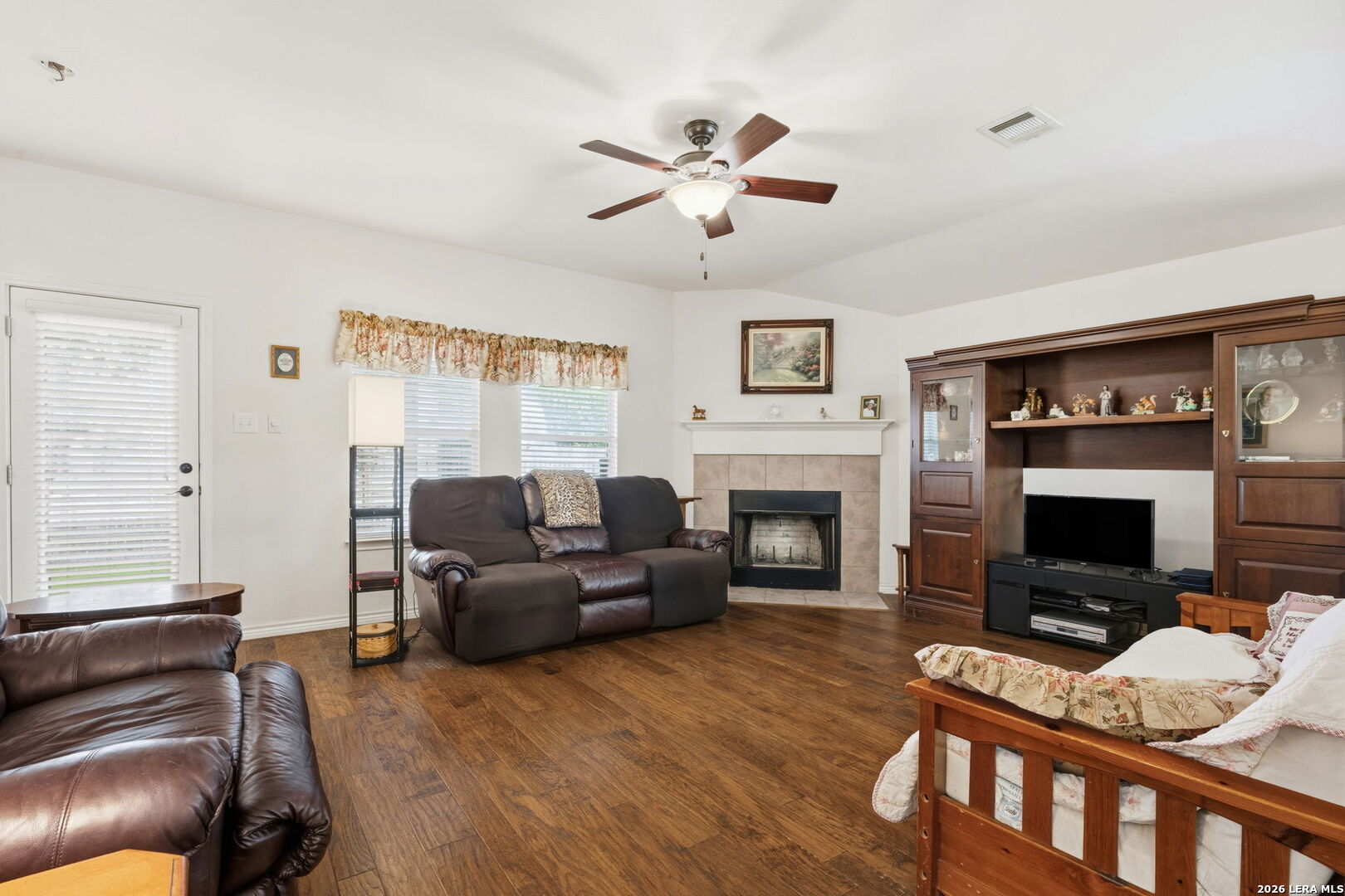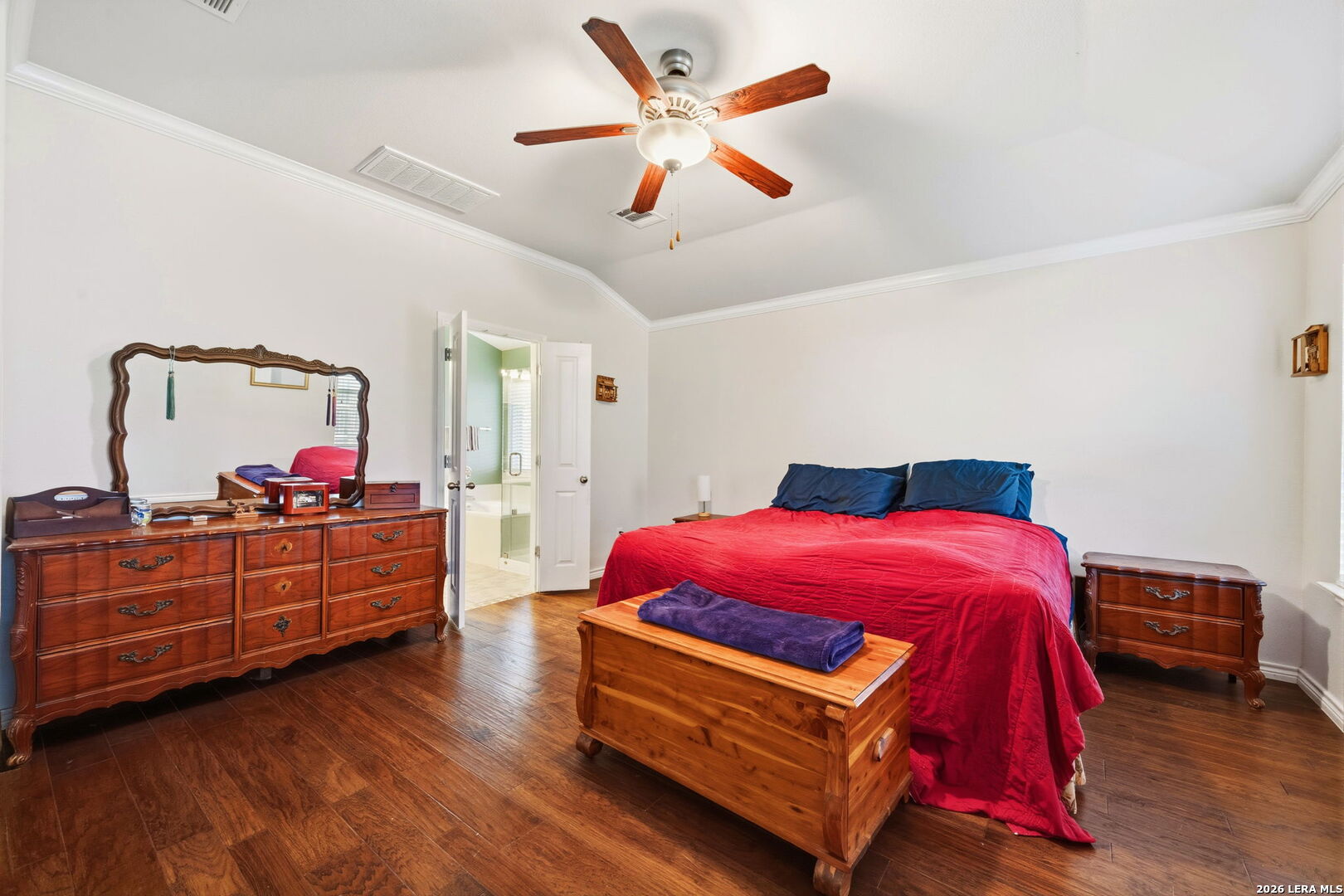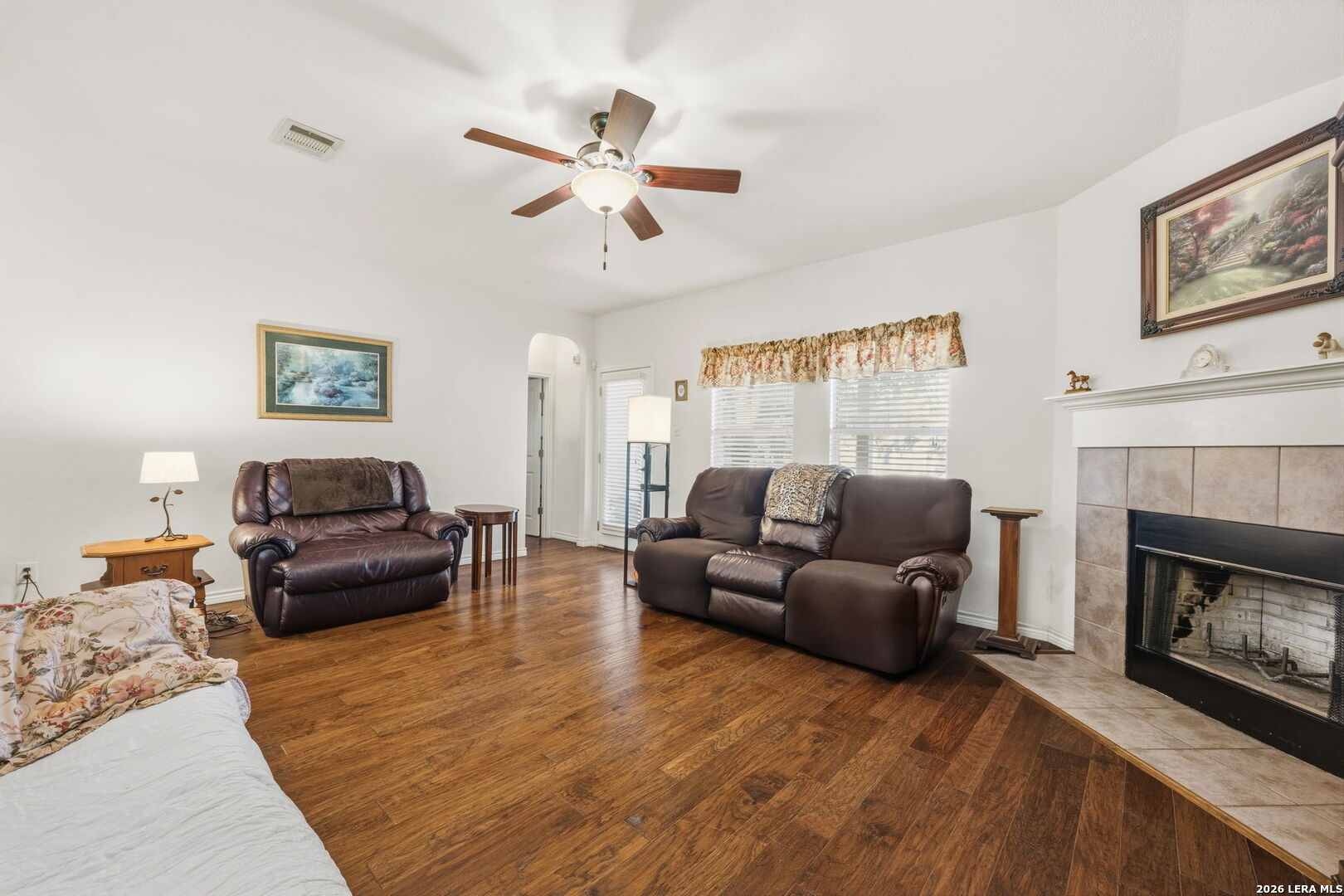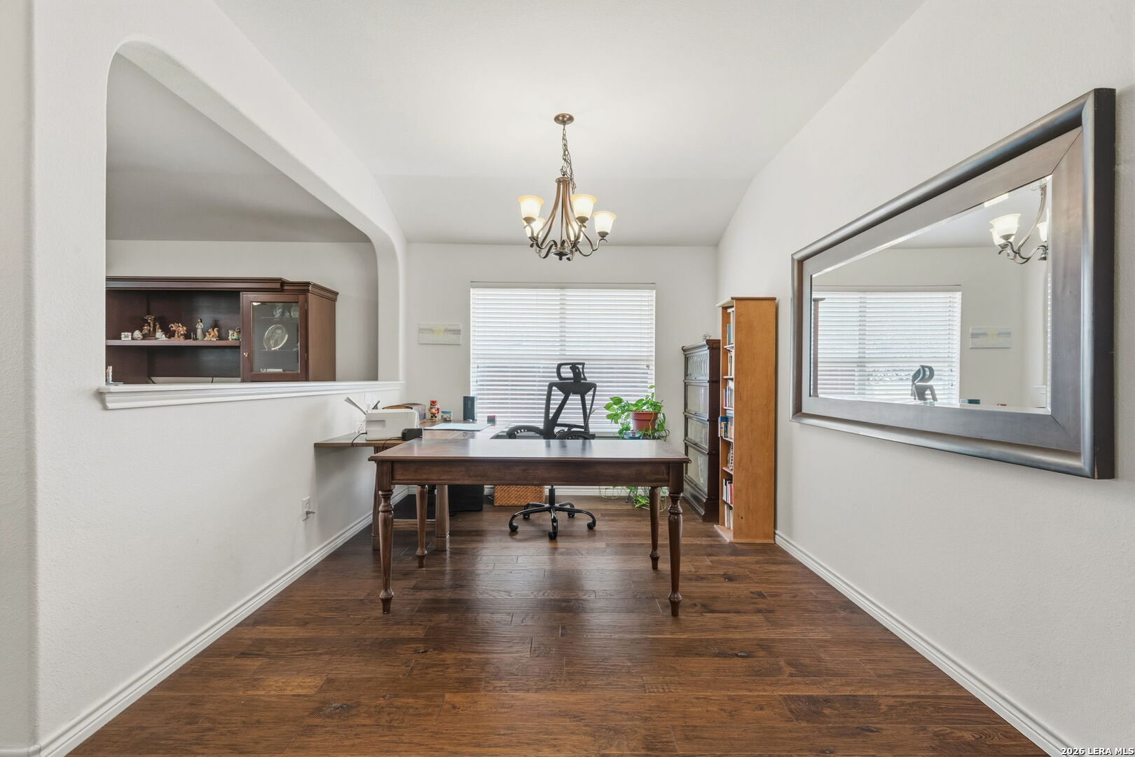 Nestled on a quiet cul-de-sac lot shaded by mature trees, this beautiful home offers the perfect blend of comfort, space, and flexibility. Inside, you'll find wood flooring throughout the main living areas with tile in all wet areas, combining style with easy maintenance. The oversized kitchen is designed for both everyday living and entertaining, featuring abundant cabinet space, flat-top cooking, a mounted microwave, and room for an eat-in kitchen setup. A separate dining room provides incredible versatility and can easily function as a home office, kids' play area, gym, or flex space to suit your needs. The wide-open floor plan, high ceilings, and abundant natural light create an inviting and airy atmosphere throughout the home. Secondary bedrooms are thoughtfully split from the oversized primary suite, offering added privacy. The primary bedroom features crown molding and a spacious walk-in closet, while the primary bath includes a double vanity, separate garden tub, and walk-in shower. An office nook conveniently located in the secondary bedroom hallway adds extra functionality for remote work or study. Outside, enjoy relaxing or entertaining on the large covered patio, surrounded by natural trees and a privacy fence. The home also includes a full sprinkler system and a 2-car garage, completing this exceptional property. This home checks all the boxes-space, flexibility, privacy, and charm-ready to fit your lifestyle.