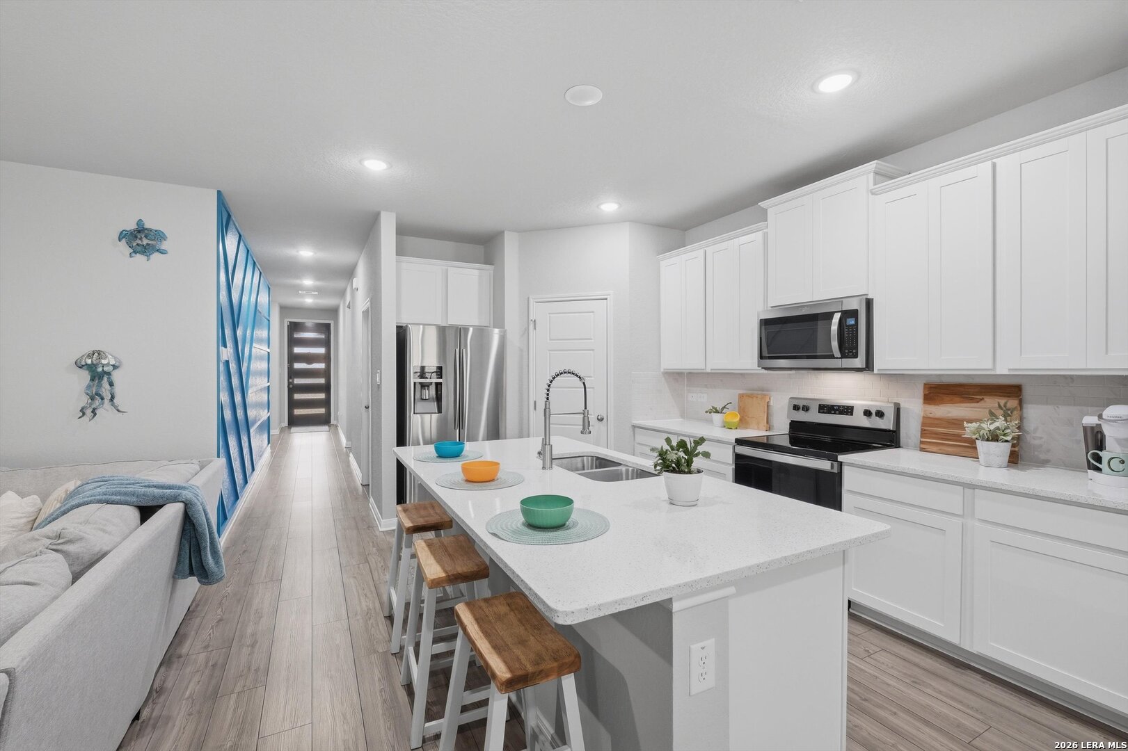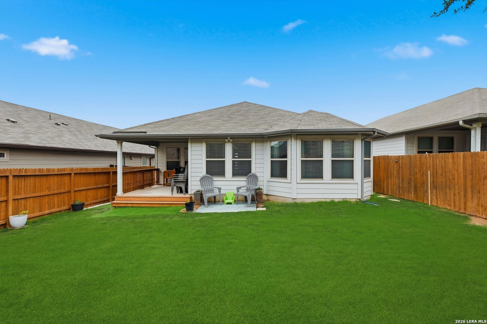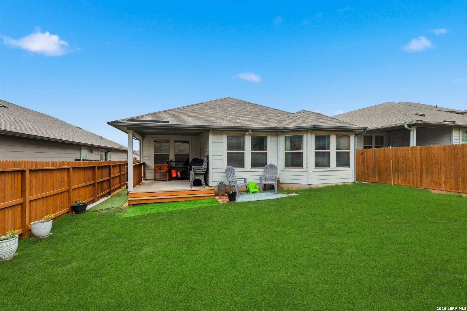 Welcome to this beautifully maintained one-story home where modern design and a smart open-concept layout create a space that feels both functional and inviting. From the moment you step inside, you're greeted by a bright, seamless flow connecting the living, dining, and kitchen areas-ideal for everyday living and effortless entertaining. The kitchen serves as the heart of the home, featuring a spacious island, quartz countertops, ample cabinetry, and a walk-in pantry, all designed to keep everything within reach while staying connected to the main living space. The thoughtfully designed floor plan places all bedrooms on the main level, offering both convenience and privacy, with comfortable secondary bedrooms and a well-appointed primary suite that provides a relaxing retreat. Step outside to a covered patio with an extended, opened-up porch-perfect for hosting gatherings or enjoying quiet evenings overlooking the backyard. The outdoor space also includes a privacy fence with extended sides, sprinkler system, gutters, added lighting, and a storage shed for extra functionality. Built with energy efficiency in mind, the home includes double pane windows, foam insulation, Energy Star appliances, and a programmable thermostat, along with a water softener and owned security system. Located in a welcoming community with a pool, park, playground, and BBQ areas, and served by top-rated schools, this home offers comfort, convenience, and a layout that truly works for today's lifestyle. This is where your next chapter begins!