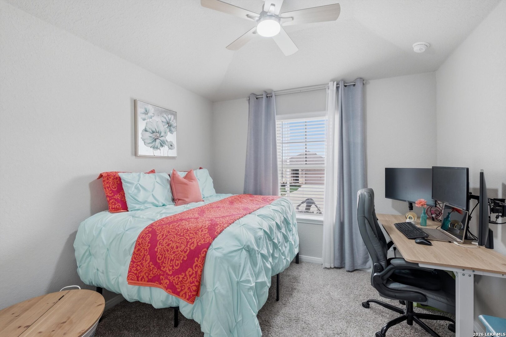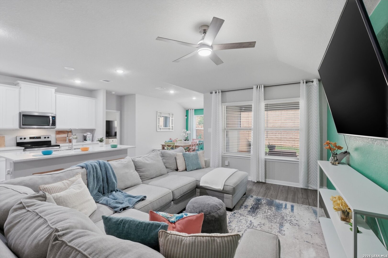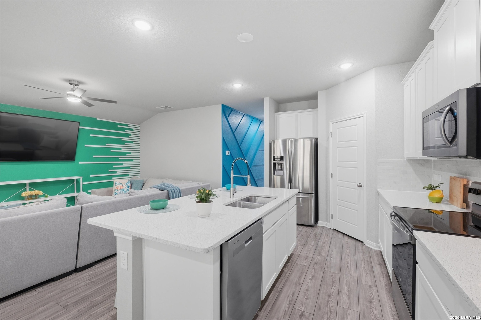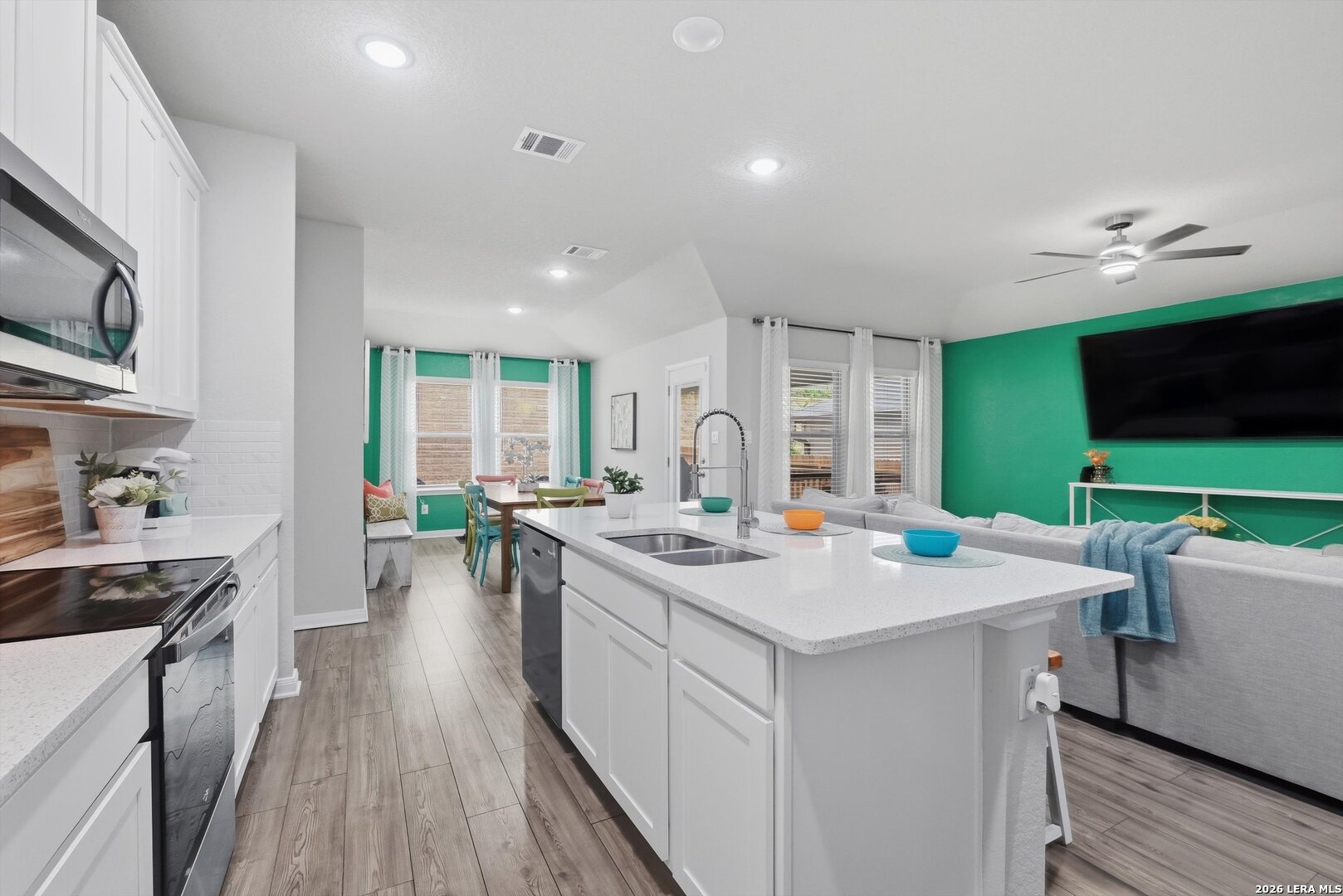 Welcome to this beautifully maintained one-story home where modern design and a smart open-concept layout create a space that feels both functional and inviting. From the moment you step inside, you're greeted by a bright, seamless flow connecting the living, dining, and kitchen areas-ideal for everyday living and effortless entertaining. The kitchen serves as the heart of the home, featuring a spacious island, quartz countertops, ample cabinetry, and a walk-in pantry, all designed to keep everything within reach while staying connected to the main living space. The thoughtfully designed floor plan places all bedrooms on the main level, offering both convenience and privacy, with comfortable secondary bedrooms and a well-appointed primary suite that provides a relaxing retreat. Step outside to a covered patio with an extended, opened-up porch-perfect for hosting gatherings or enjoying quiet evenings overlooking the backyard. The outdoor space also includes a privacy fence with extended sides, sprinkler system, gutters, added lighting, and a storage shed for extra functionality. Built with energy efficiency in mind, the home includes double pane windows, foam insulation, Energy Star appliances, and a programmable thermostat, along with a water softener and owned security system. Located in a welcoming community with a pool, park, playground, and BBQ areas, and served by top-rated schools, this home offers comfort, convenience, and a layout that truly works for today's lifestyle. This is where your next chapter begins!