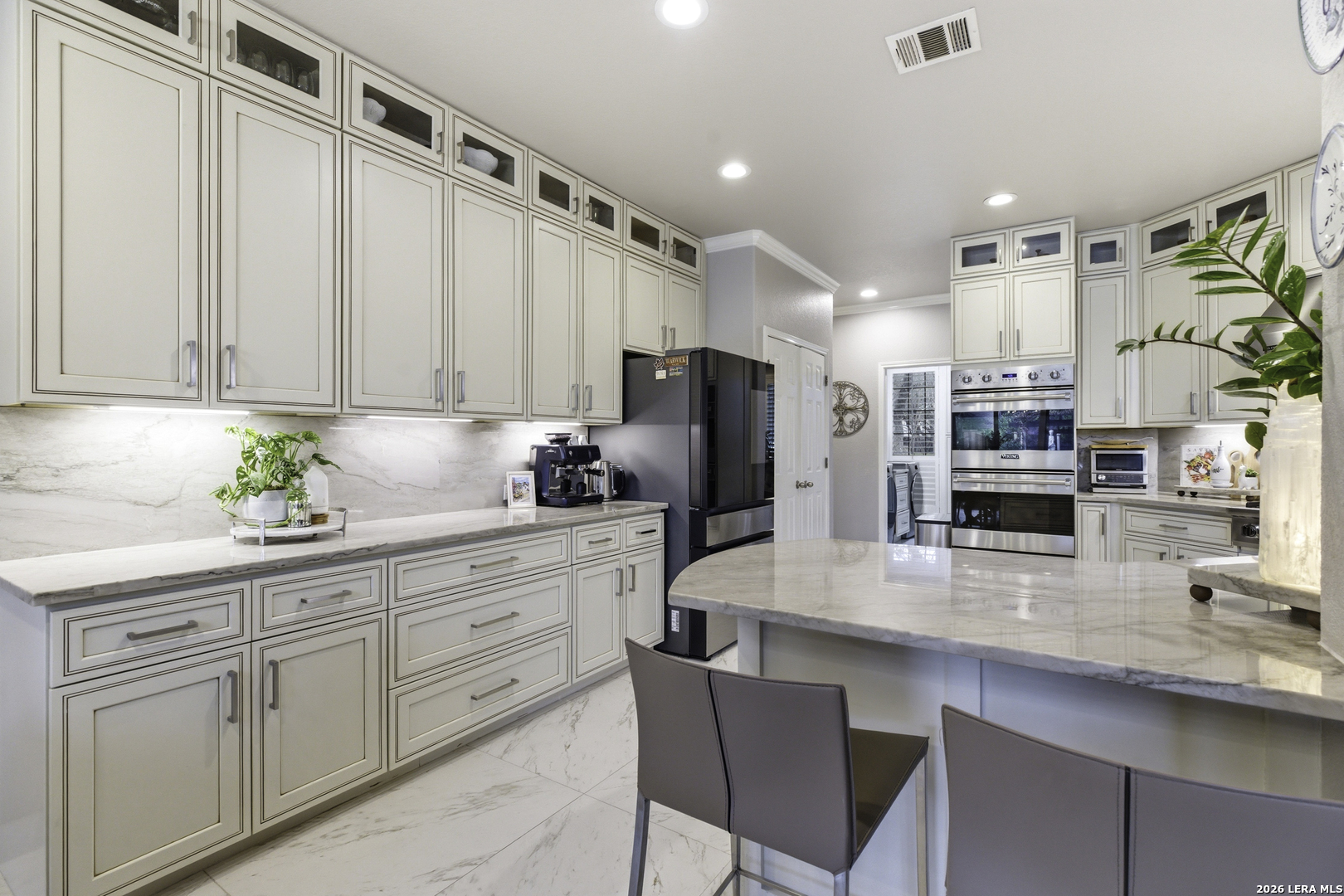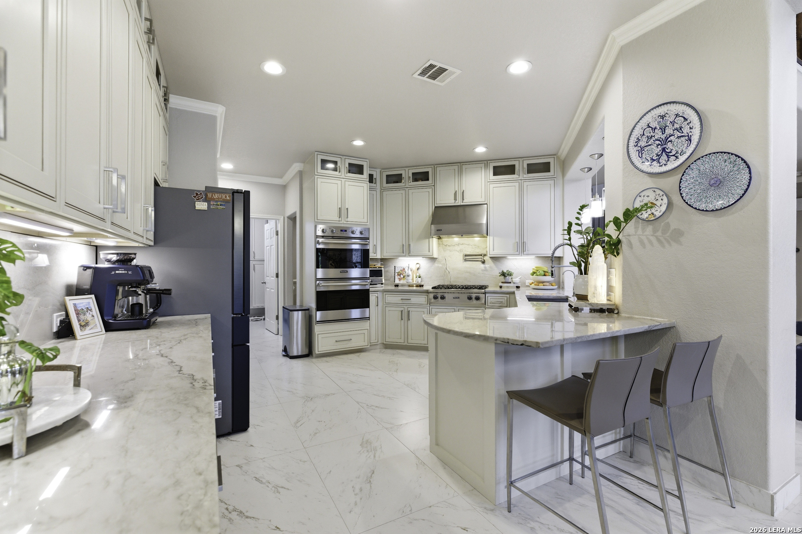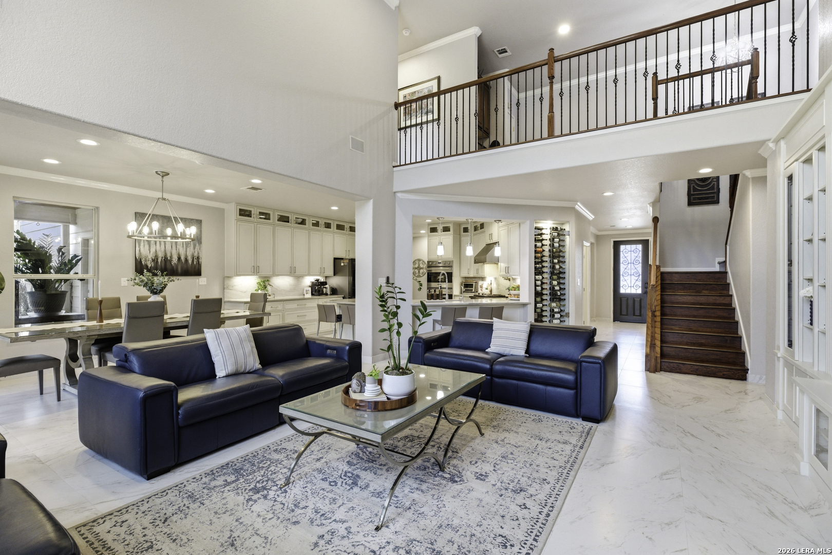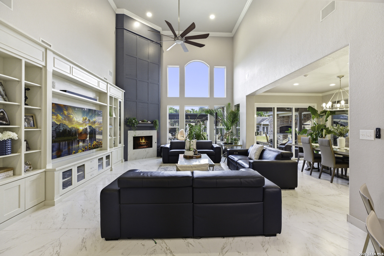 Welcome to an extraordinary private estate in the highly sought-after community of Timberwood Park, where luxury living meets unmatched versatility on a sprawling half-acre lot. Designed for multigenerational living, entertaining, and everyday comfort, this exceptional property offers a rare combination of elegance, functionality, and resort-style amenities. The beautifully remodeled main residence showcases sophisticated finishes, expansive living spaces, designer lighting, porcelain flooring, and a stunning chef's kitchen featuring premium Viking appliances, a pot filler, and generous prep space ideal for entertaining. Thoughtfully designed upgrades between 2020 and 2022 elevate every corner of the home, blending modern style with timeless comfort. This remarkable compound includes a private upstairs apartment with its own entrance, full kitchen, living and dining areas, and balcony - perfect for guests, extended family, or potential income opportunities. Two detached office suites with a full bathroom provide an ideal work-from-home environment or the flexibility to convert into a guest casita or creative studio. Step outside into your personal resort oasis featuring an expansive swimming pool, outdoor shower, full outdoor kitchen with Argentine-style barbecue, pizza oven, gas grill, griddle, refrigerator, and island seating, plus a fireplace lounge and covered pavilion designed for unforgettable gatherings. The lush grounds include mature palm trees, fruit trees, a vegetable garden, and ample space for recreation. Additional highlights include a whole-house Generac generator, RV parking with full hookups, a three-car garage, a gym with sauna conversion, and extensive energy-efficient upgrades throughout. Residents of Timberwood Park enjoy exceptional neighborhood amenities, including multiple sports courts, swimming pools, a clubhouse, fitness center, a six-hole putting green, scenic park spaces, and vibrant community events year-round - all while being conveniently located near top-rated schools with easy access to Highway 281 and Loop 1604. This is more than a home; it is a private retreat designed for luxurious everyday living, unforgettable entertaining, and limitless possibilities.